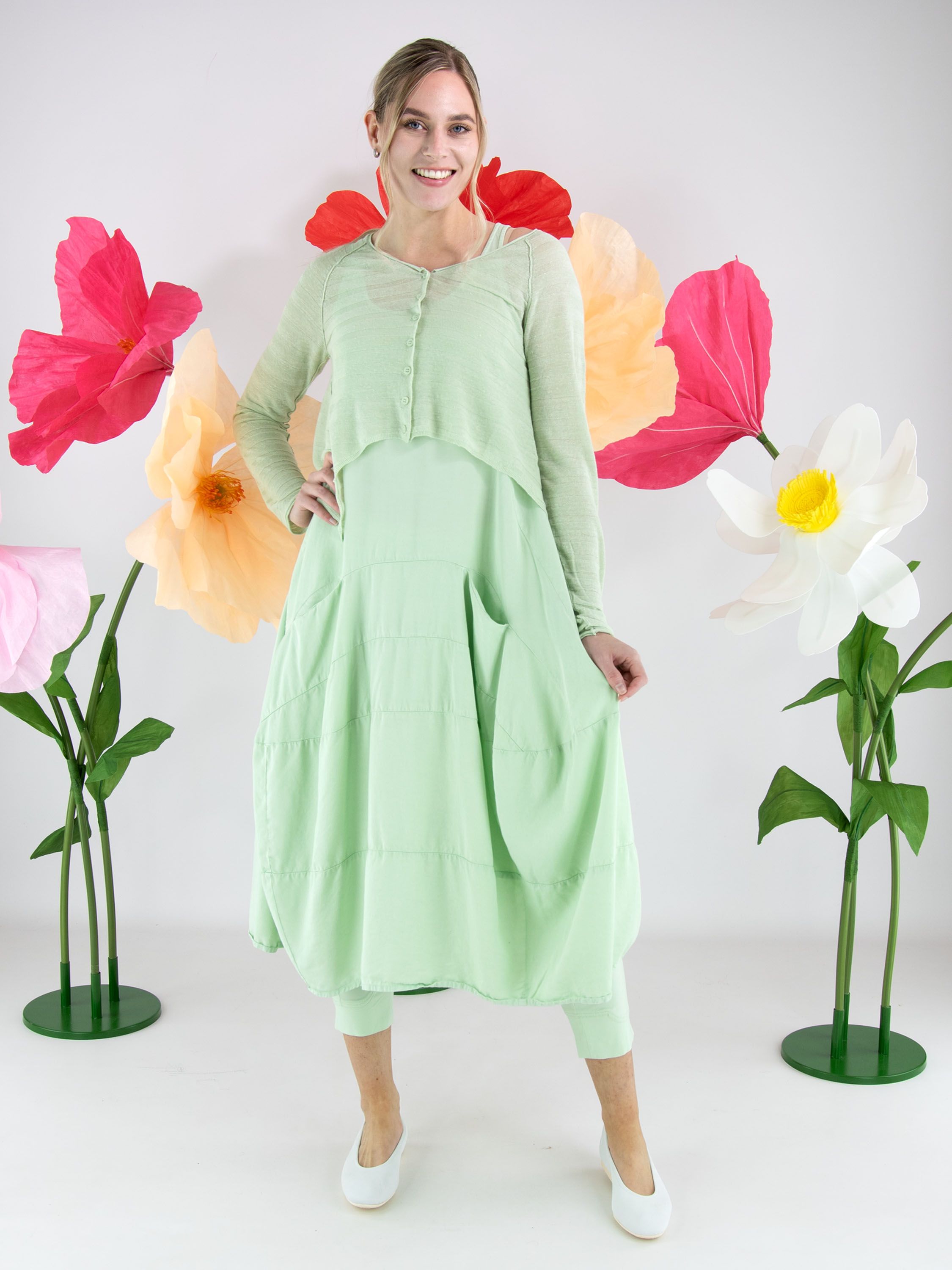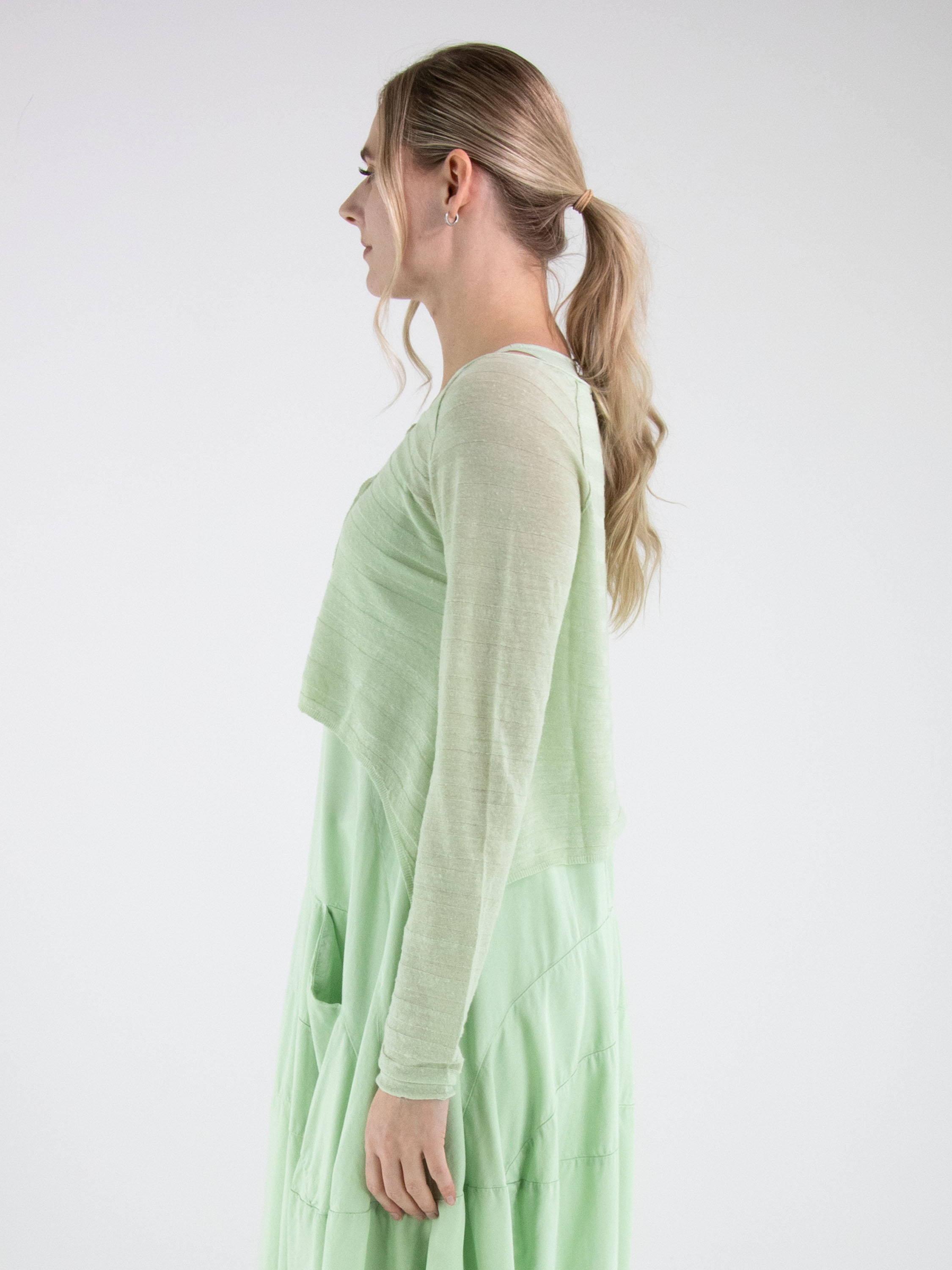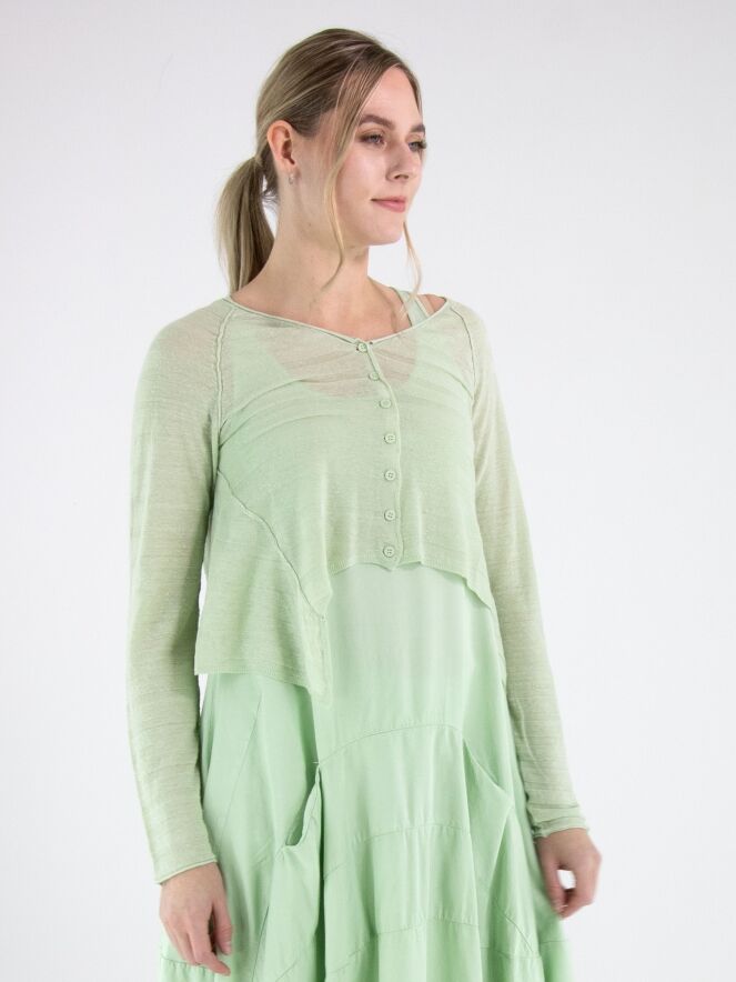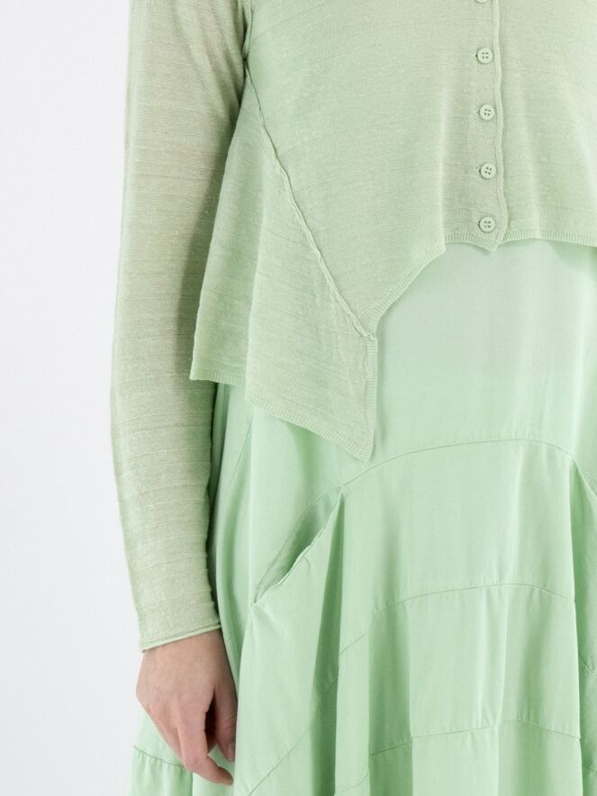 Kort, licht transparant vest van Rundholz Black Label in een frisse pistachegroene tint. De stof heeft een subtiele gestreepte structuur, wat het ontwerp een verfijnde en moderne uitstraling geeft. Aan de onderzijde zijn de zijkanten iets langer dan het middendeel, wat zorgt voor een speels en eigentijds silhouet. Dit exclusieve designer vest kan op 30 graden worden gewassen.