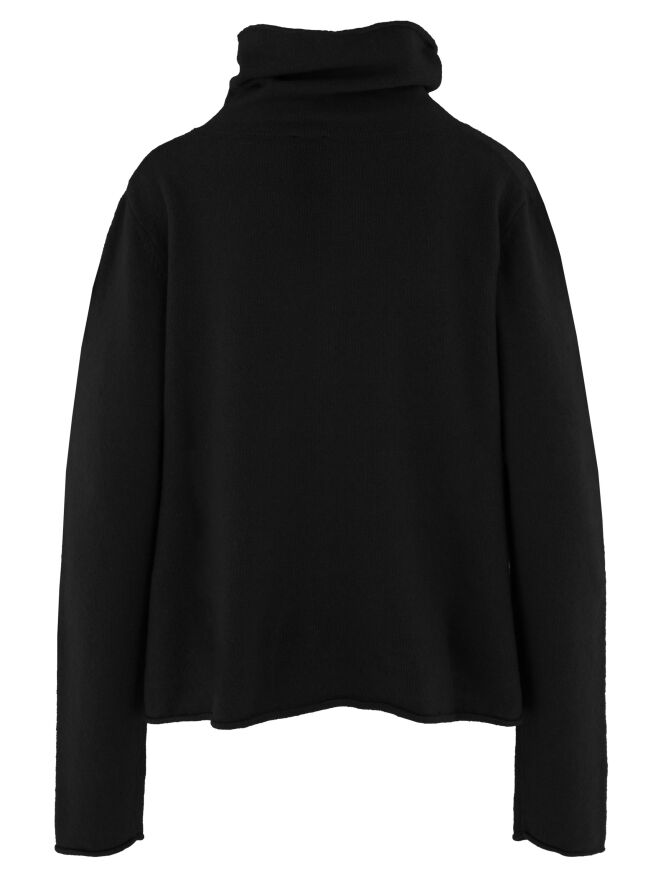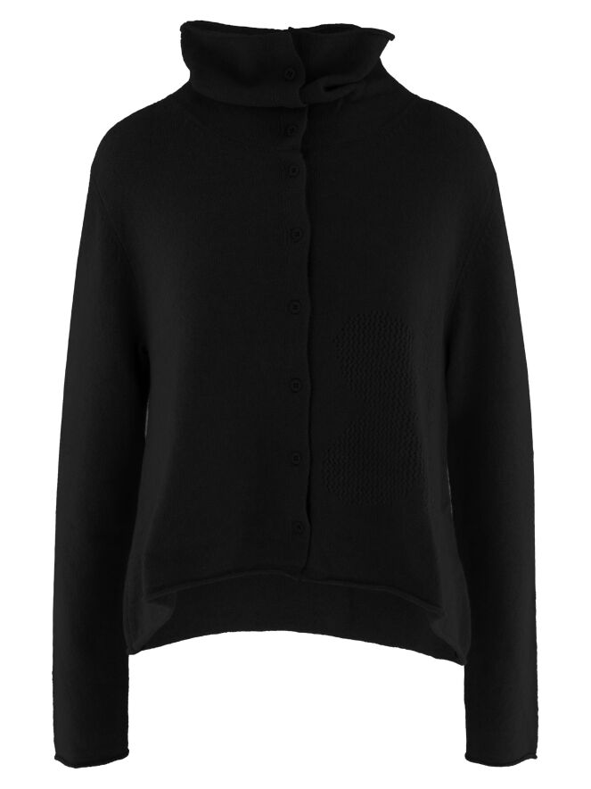 Een kort, wijd vest van Rundholz Black Label in zwart. Het vest heeft een vallende col en een gerulde onderrand. In het linker voorpand is met een andere breisteek een bloempatroon verwerkt. Dit vest mag met de hand worden gewassen.