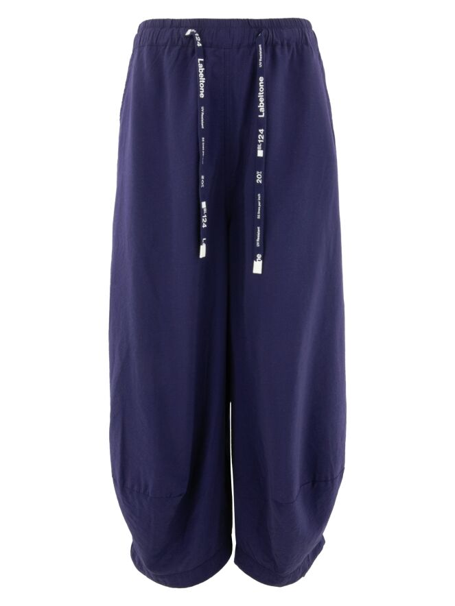 Een wijde broek van Rundholz Black label in de kleur indigo blauw. In de taille is een fijn geplooide elastieken band met een koord in een tunnelverwerking. Ter hoogte van de kuit is een stiknaad in de pijpen waarna de pijpen iets toelopen naar de onderkant. Deze broek mag op de hand worden gewassen.