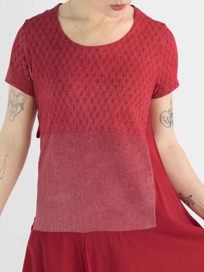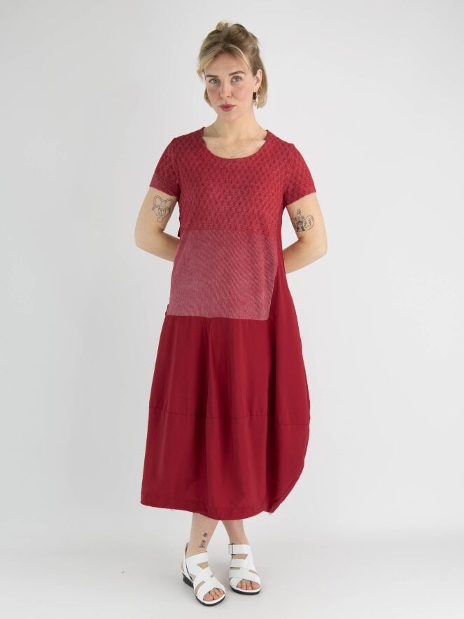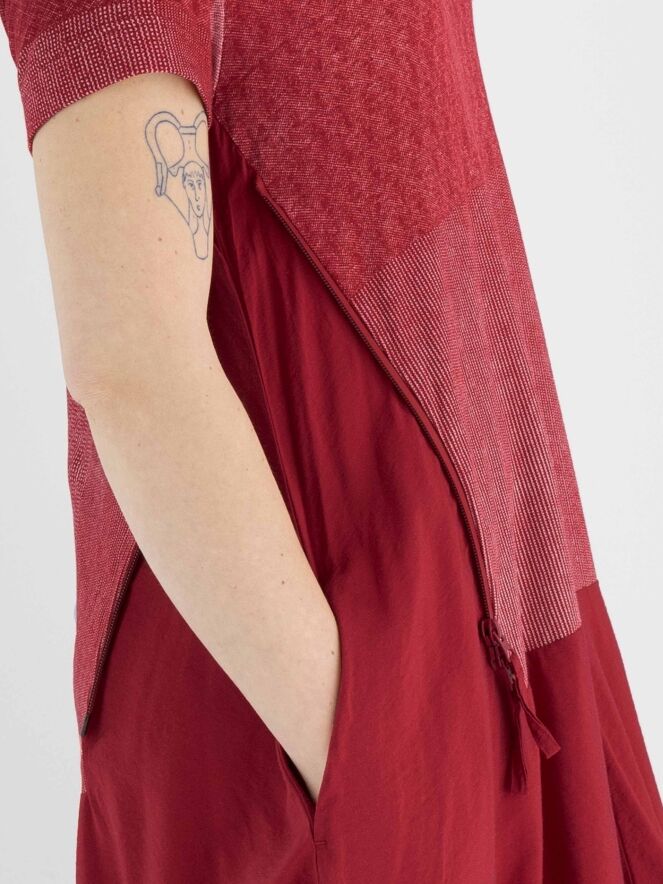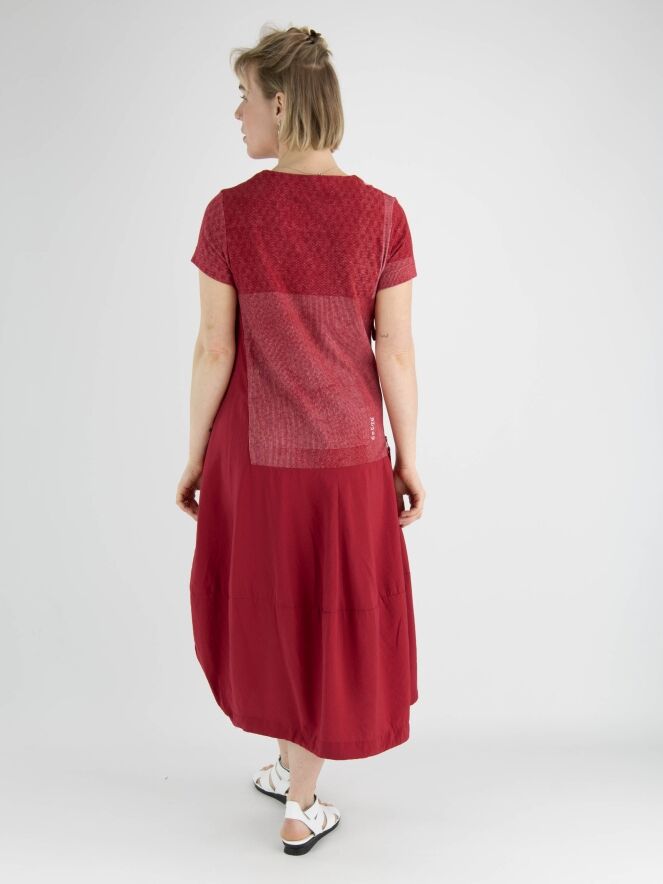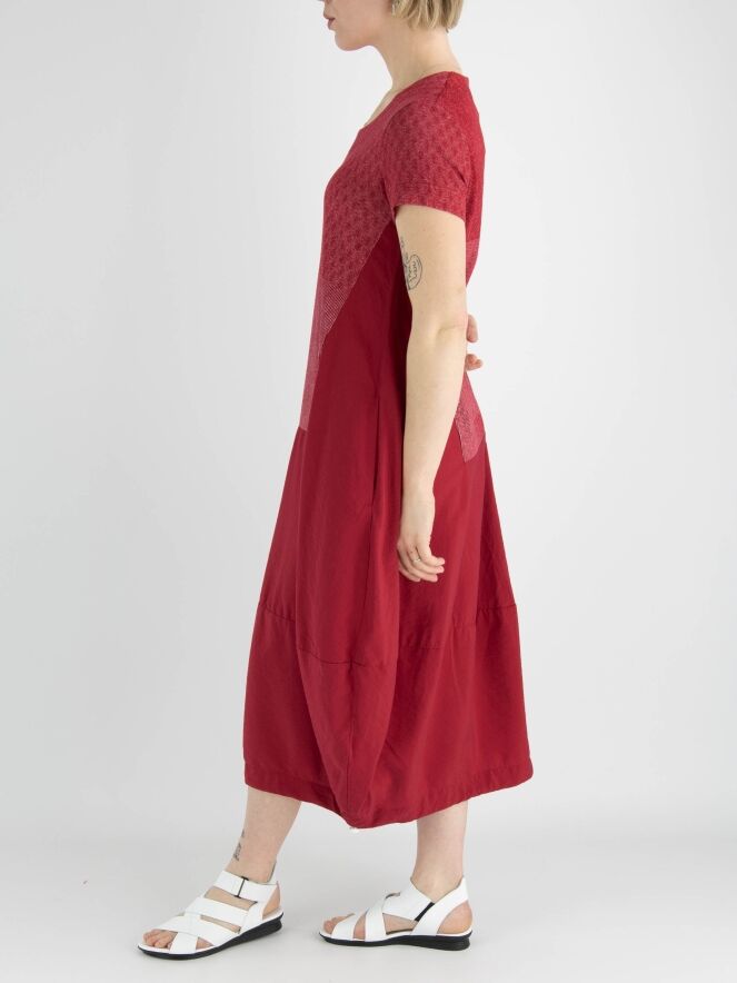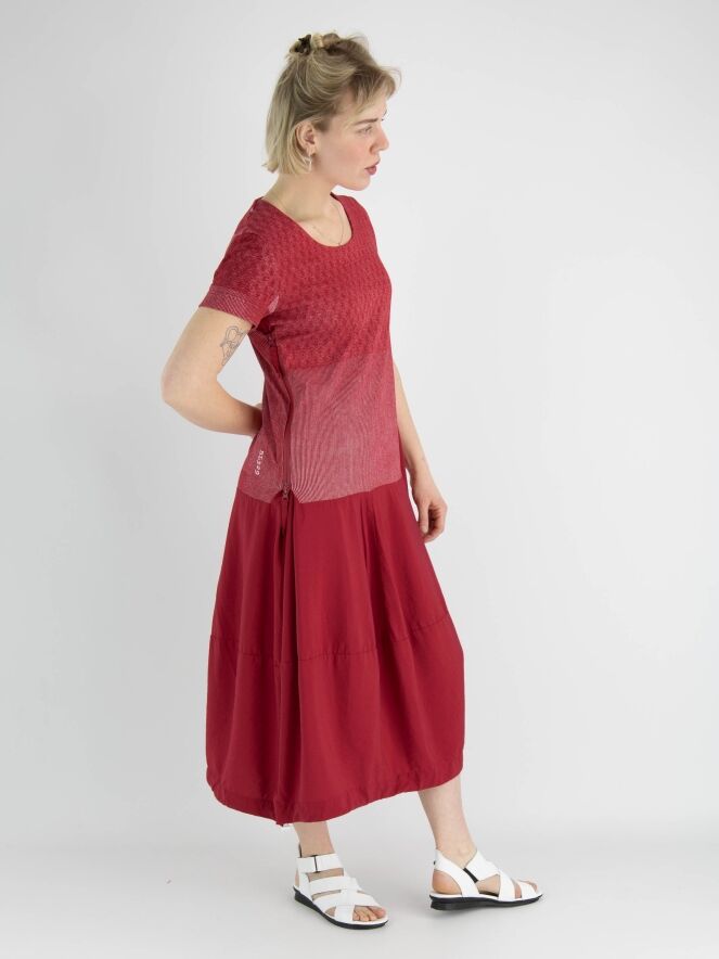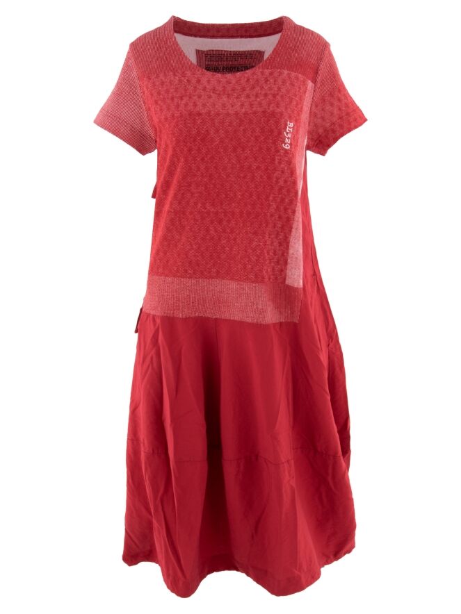 Een jurk van Rundholz Black label in de kleur rood met boven de taille en grafische print met de kleuren rood en wit. De jurk heeft een ronde hals en korte mouwen. Vanuit de taille heeft de jurk een ballon vorm en in de rechter zijkant is een rits gezet waarmee de jurk meer ruimte krijgt wanneer de rits wordt opengezet. Deze jurk mag op de hand worden gewassen.