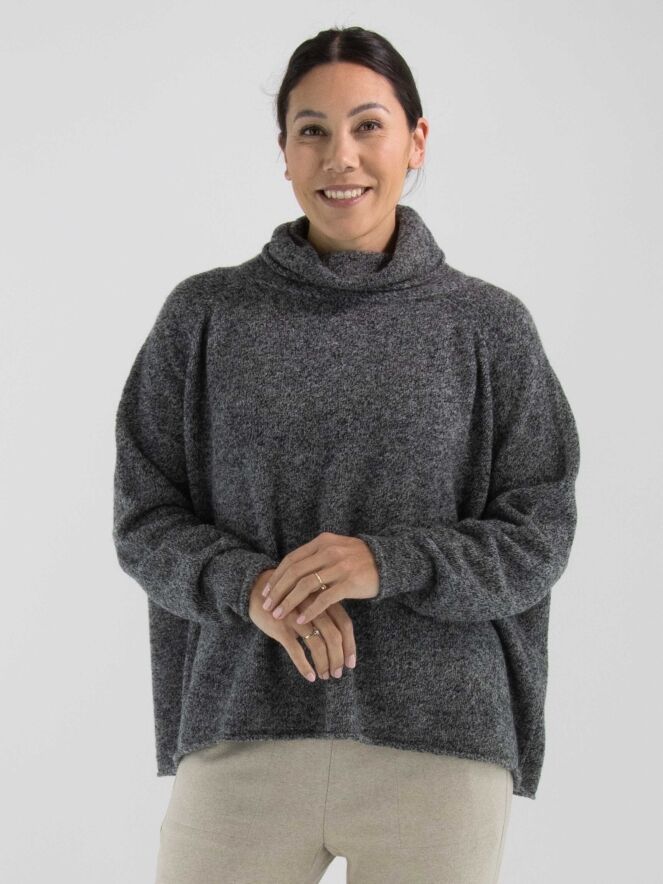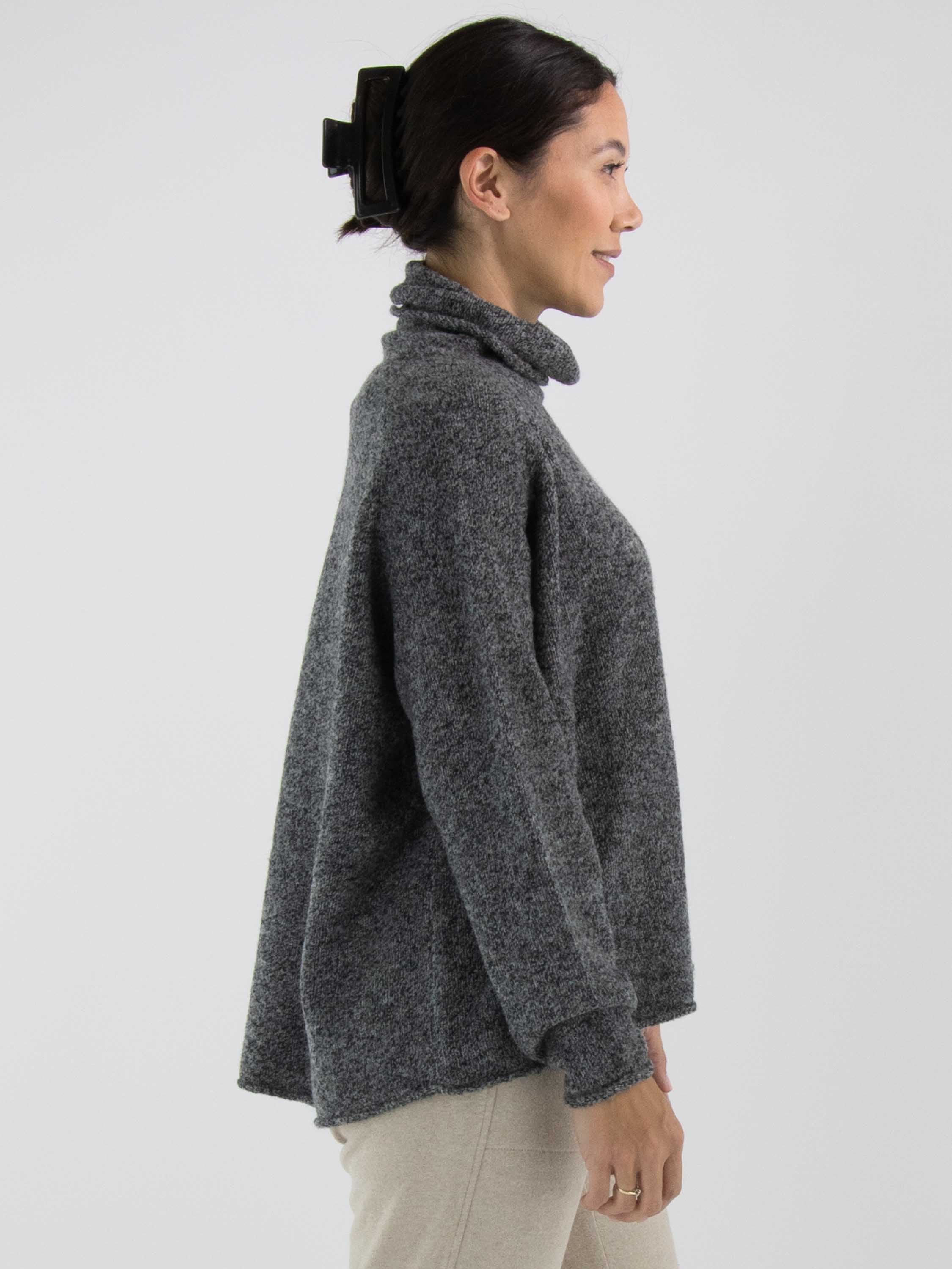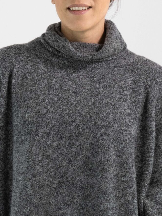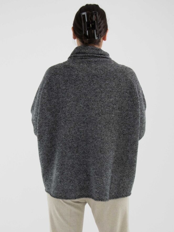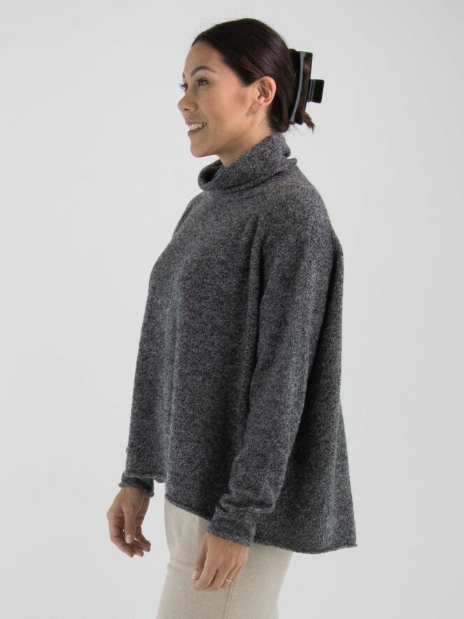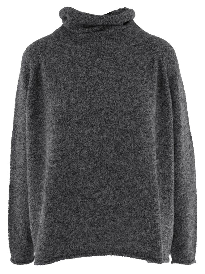 Een ruime, gemêleerde pullover van Rundholz Black Label in grijstinten met zwart. De pullover heeft een vallende col en mag met de hand worden gewassen.