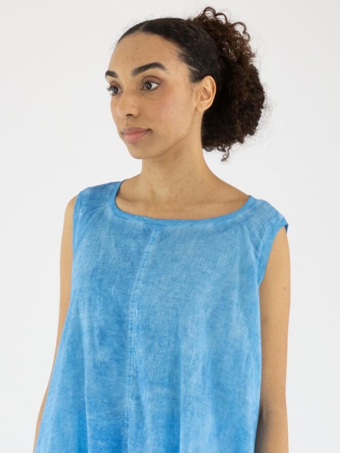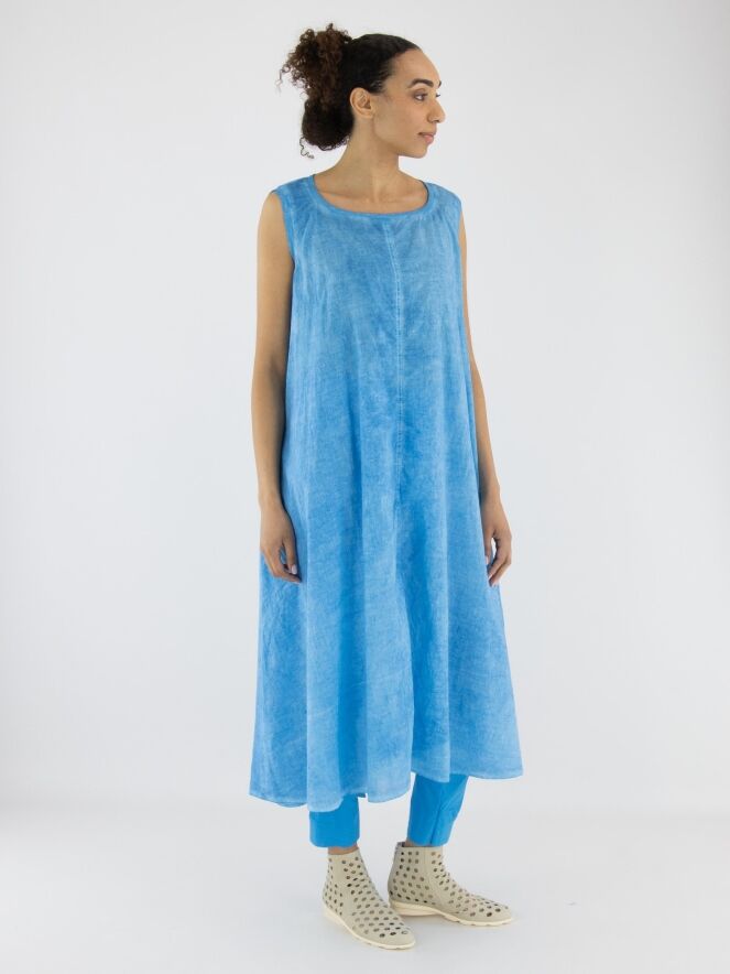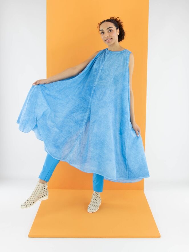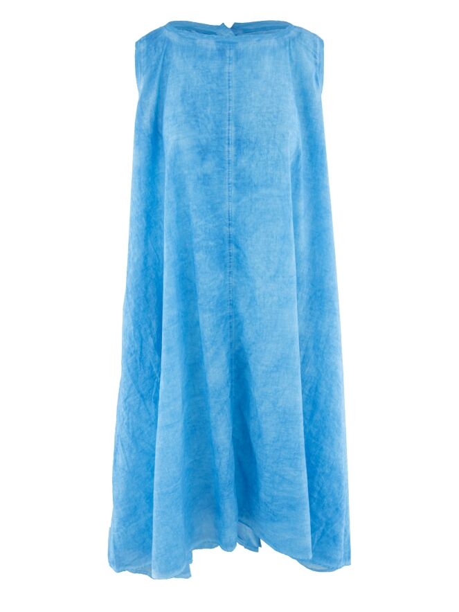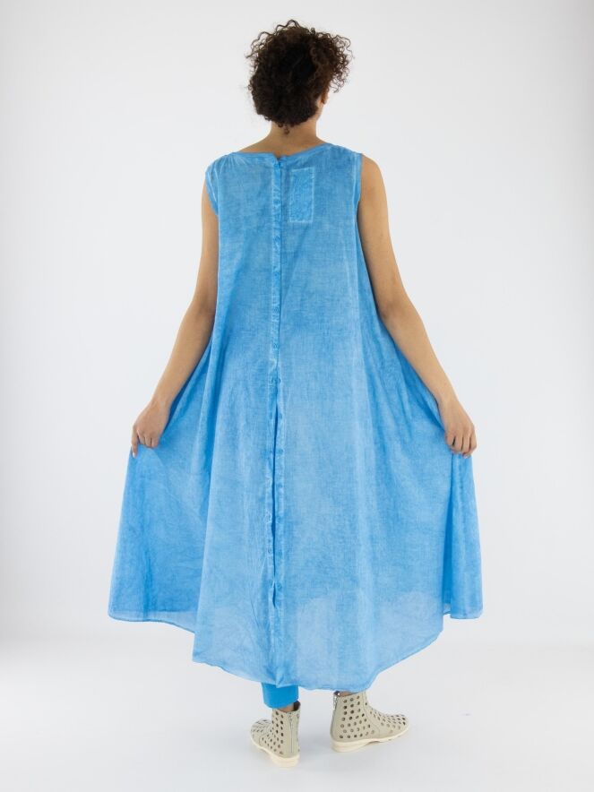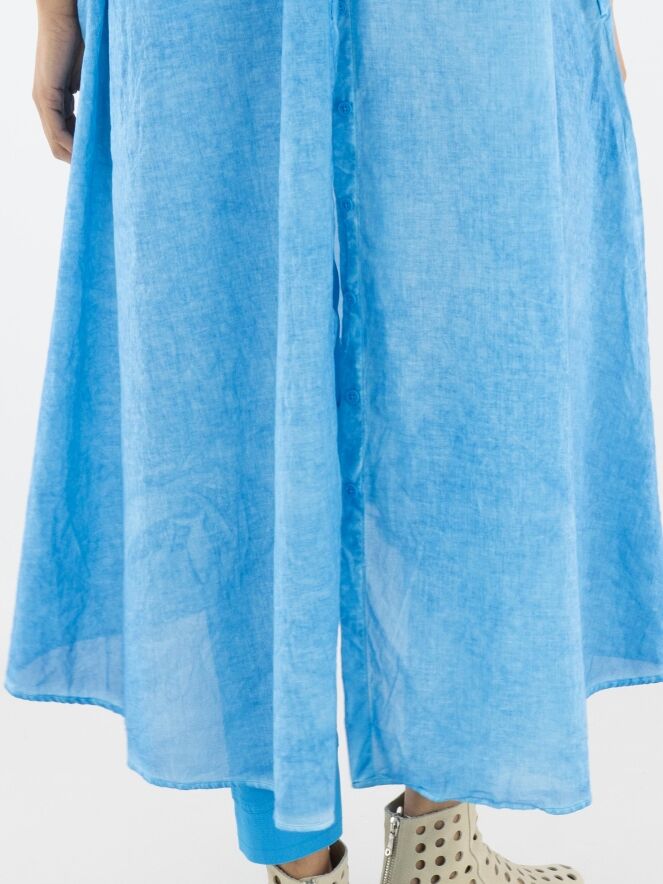 Een licht transparante jurk van Rundholz Black Label in een gemêleerde helderblauwe kleur. Langs de brede ronde hals en de mouwinzet bevindt zich een fijn geribbelde tricot boord. Aan de achterkant loopt een knoopsluiting over de gehele lengte. Ter hoogte van de taille zijn steekzakken verwerkt. Deze jurk kan op 30 graden worden gewassen.