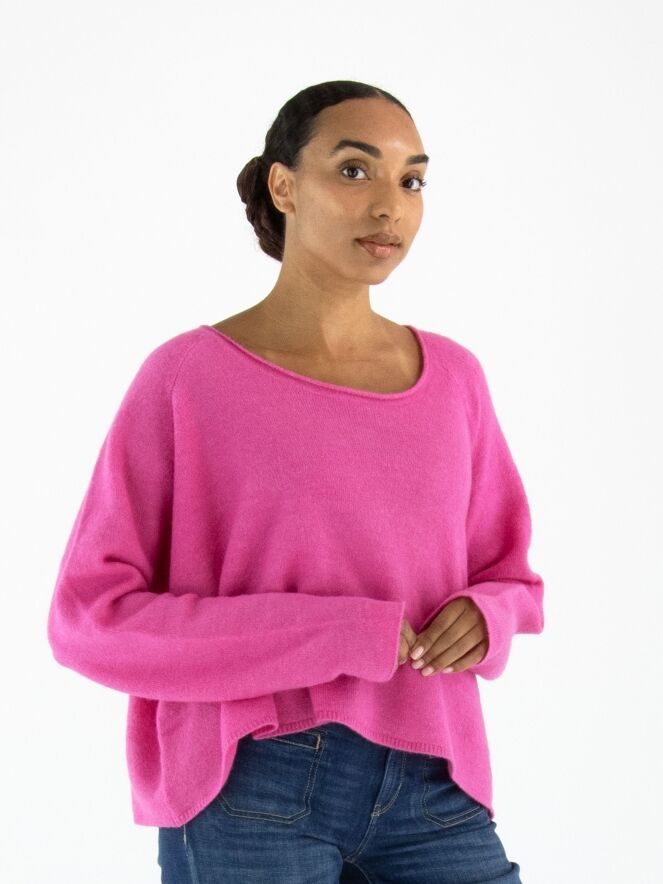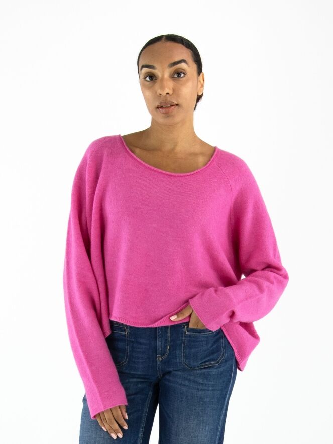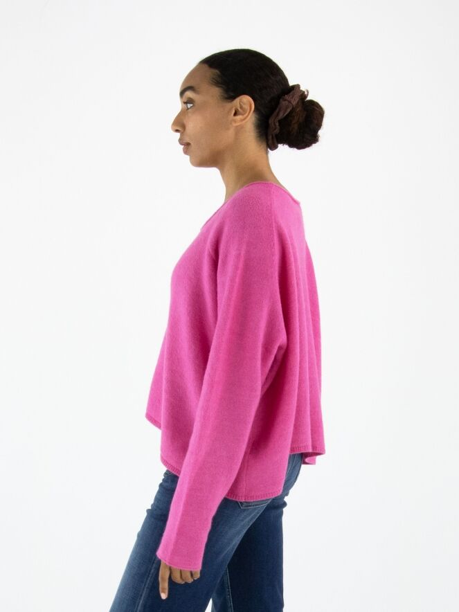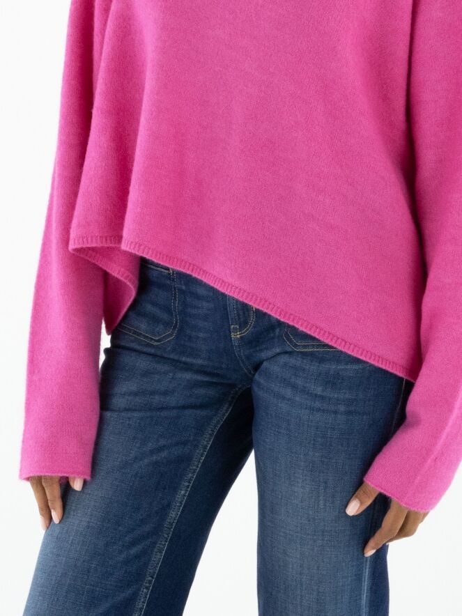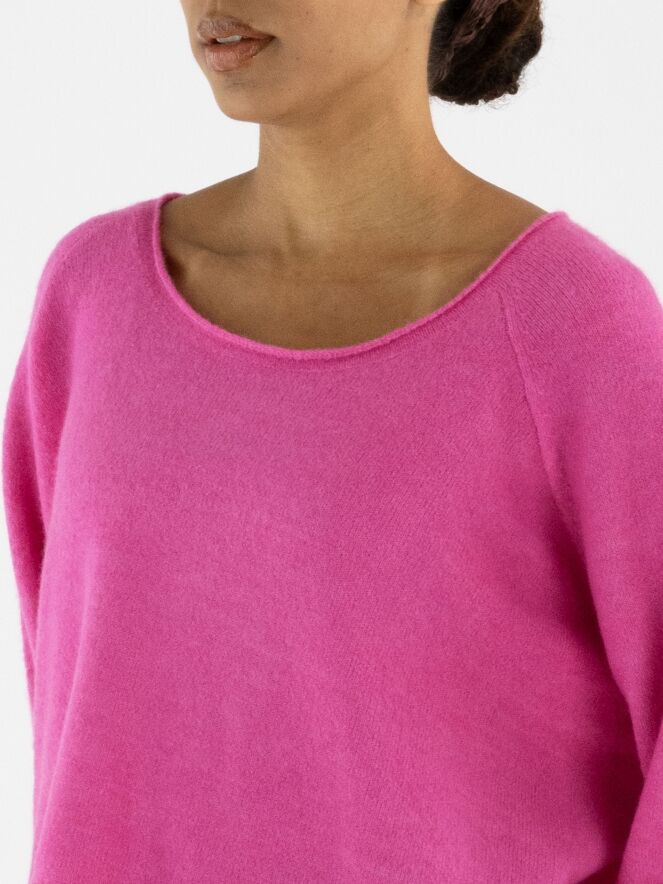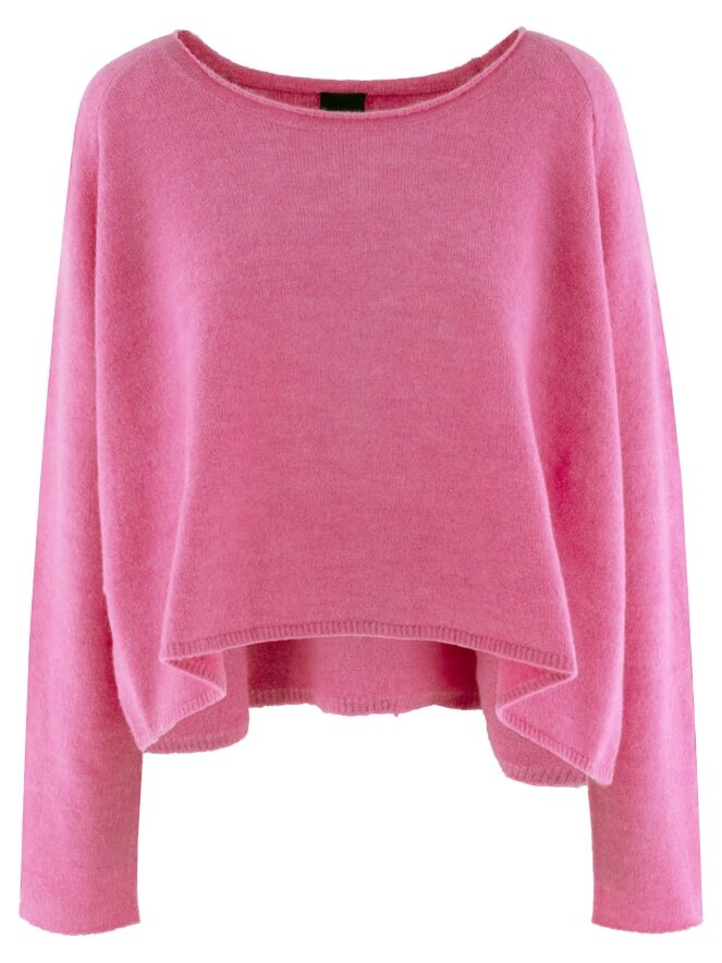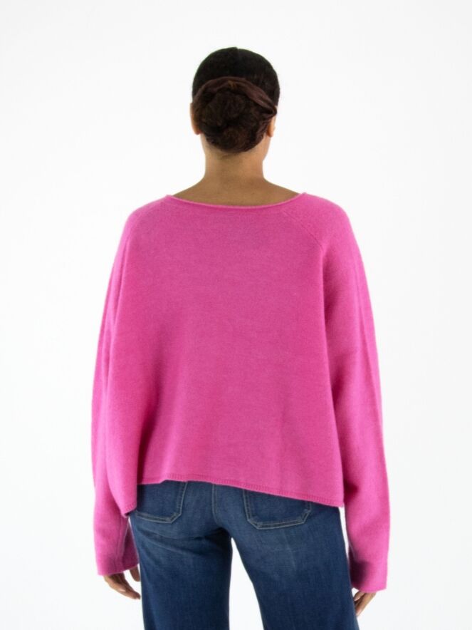 Een wijde, korte pullover van Rundholz Black Label in de kleur pink. De pullover heeft een ronde hals en lange mouwen. Deze pullover mag met de hand worden gewassen.