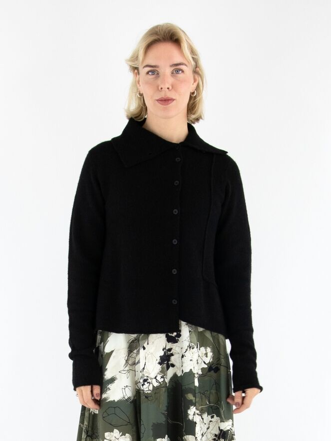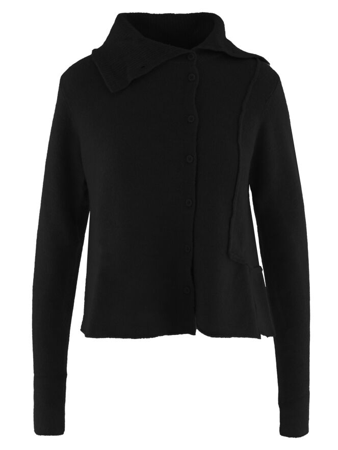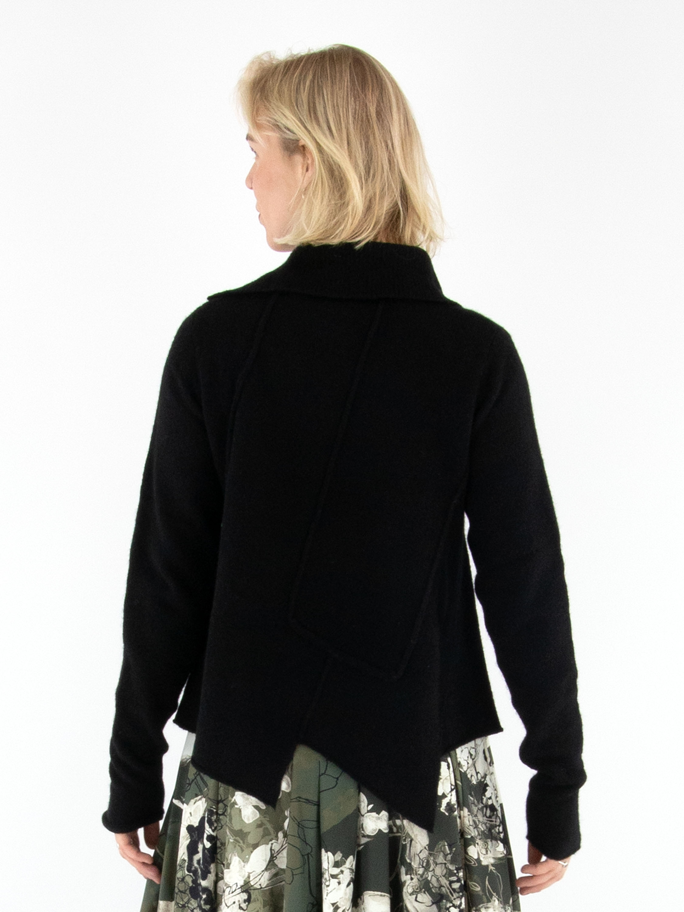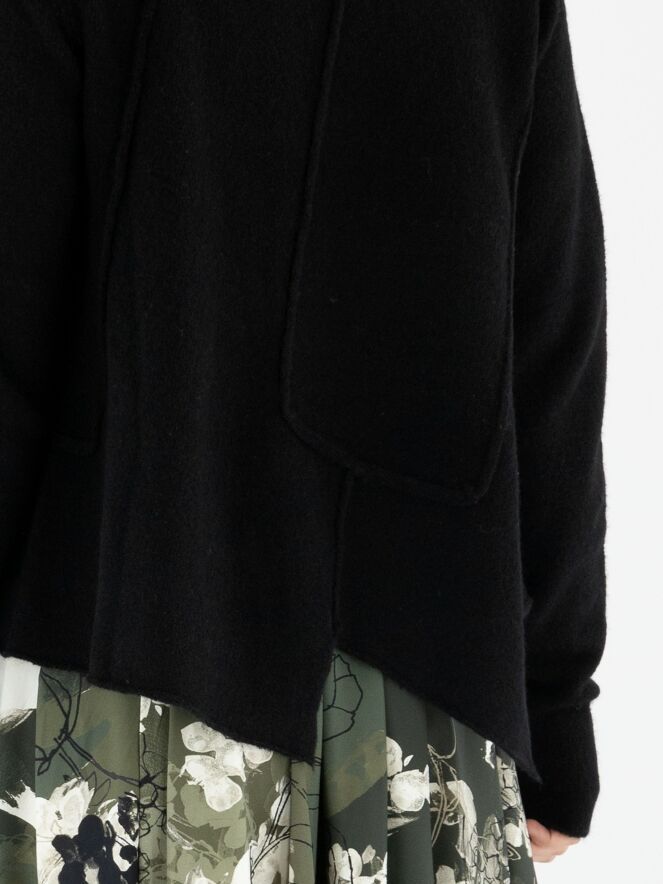 Een vest van Rundholz Black Label in de kleur zwart. Op de voor- en achterkant zijn enkele omgekeerde stiknaden verwerkt. De vallende col is fijn geribbeld en de onderrand is asymmetrisch gesneden. Dit vest mag met de hand worden gewassen.