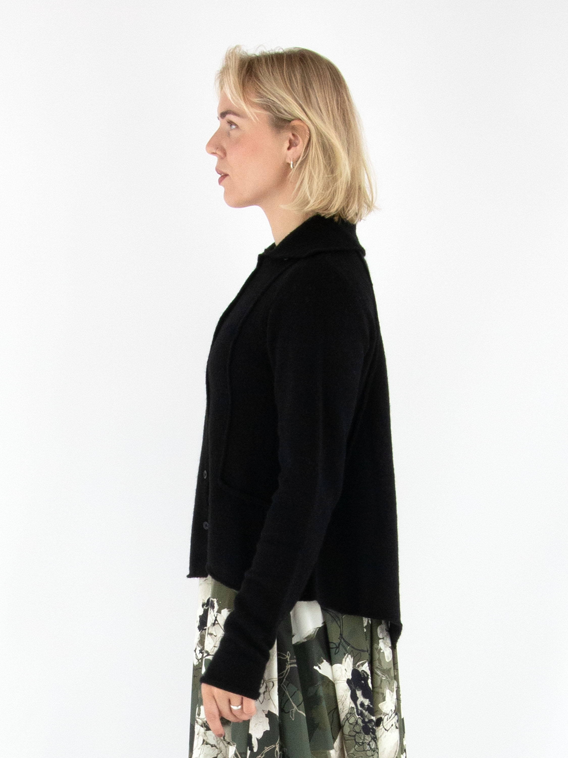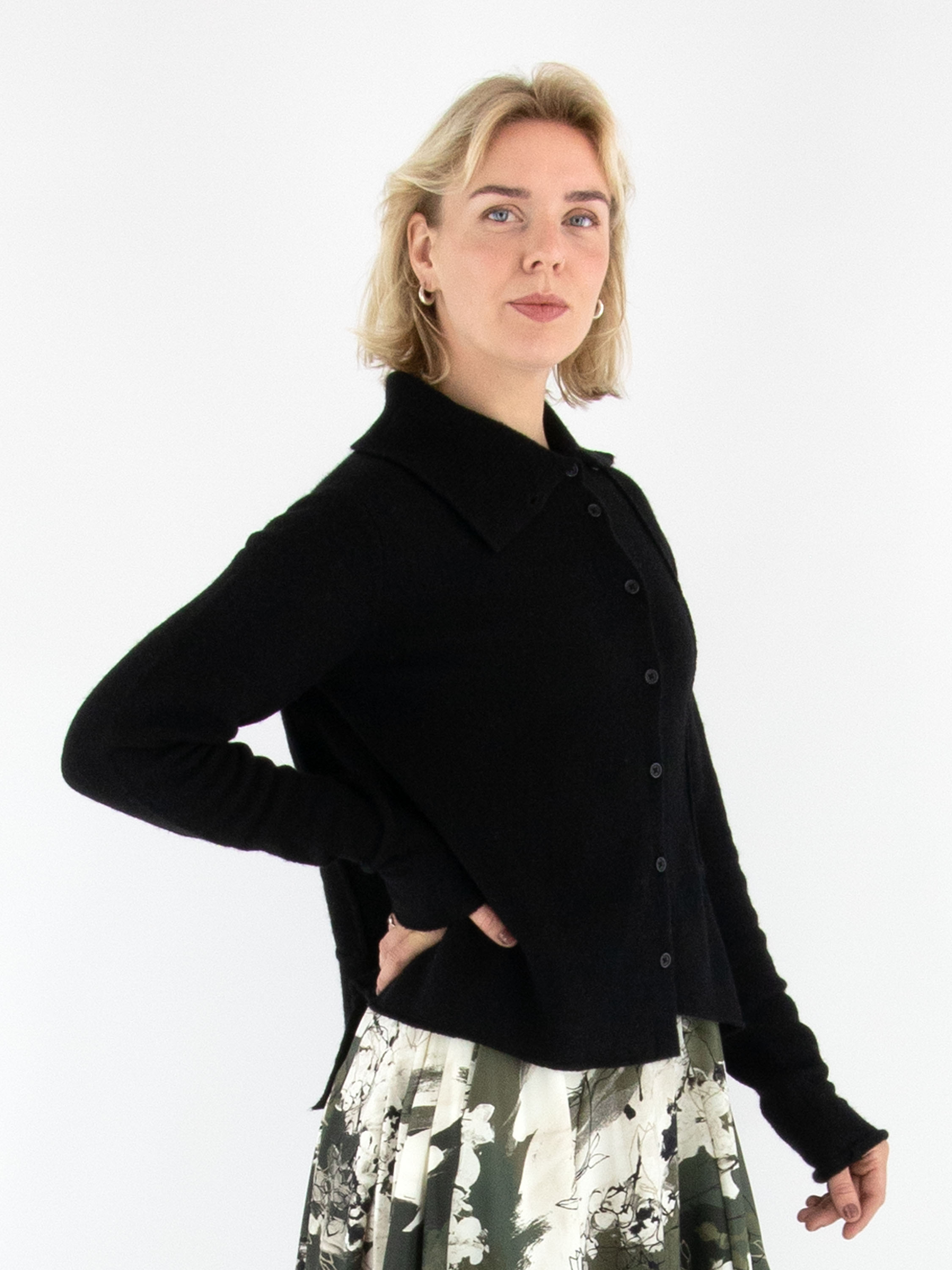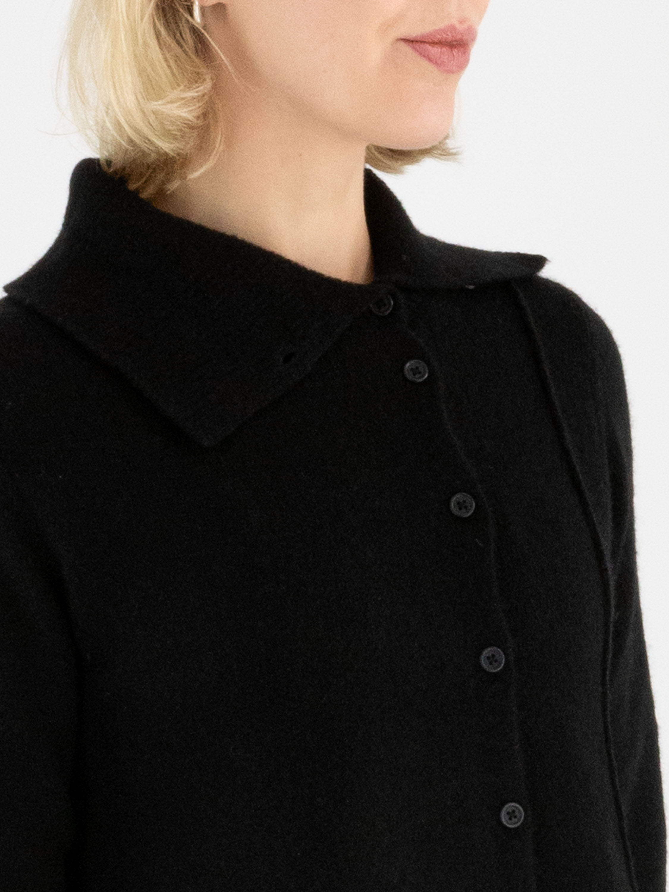 Een vest van Rundholz Black Label in de kleur zwart. Op de voor- en achterkant zijn enkele omgekeerde stiknaden verwerkt. De vallende col is fijn geribbeld en de onderrand is asymmetrisch gesneden. Dit vest mag met de hand worden gewassen.