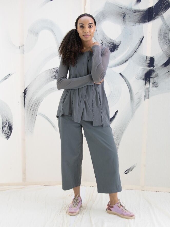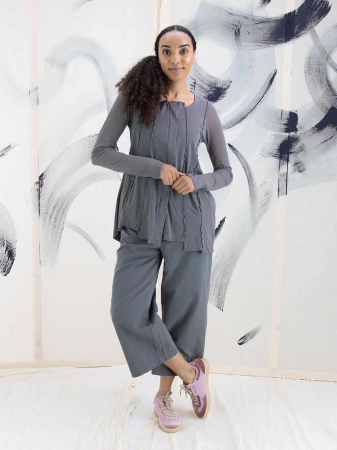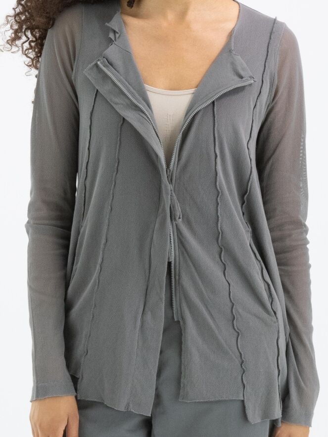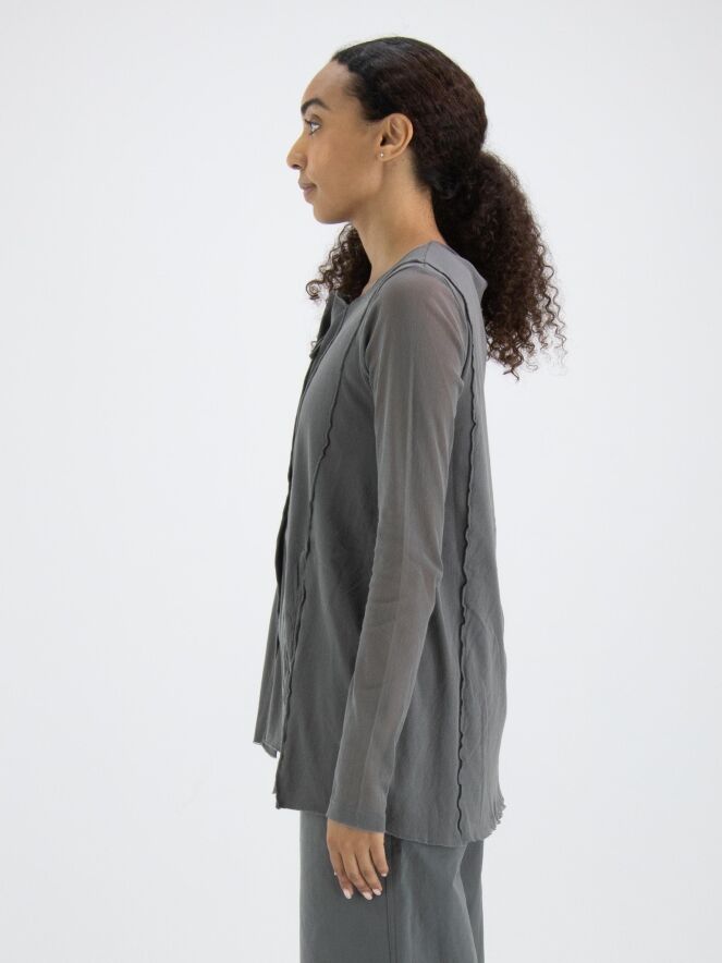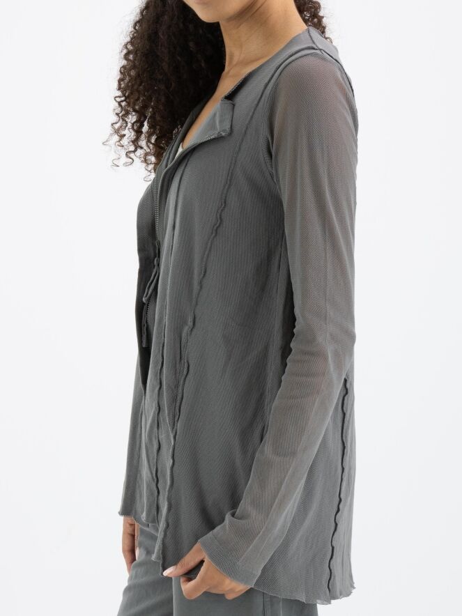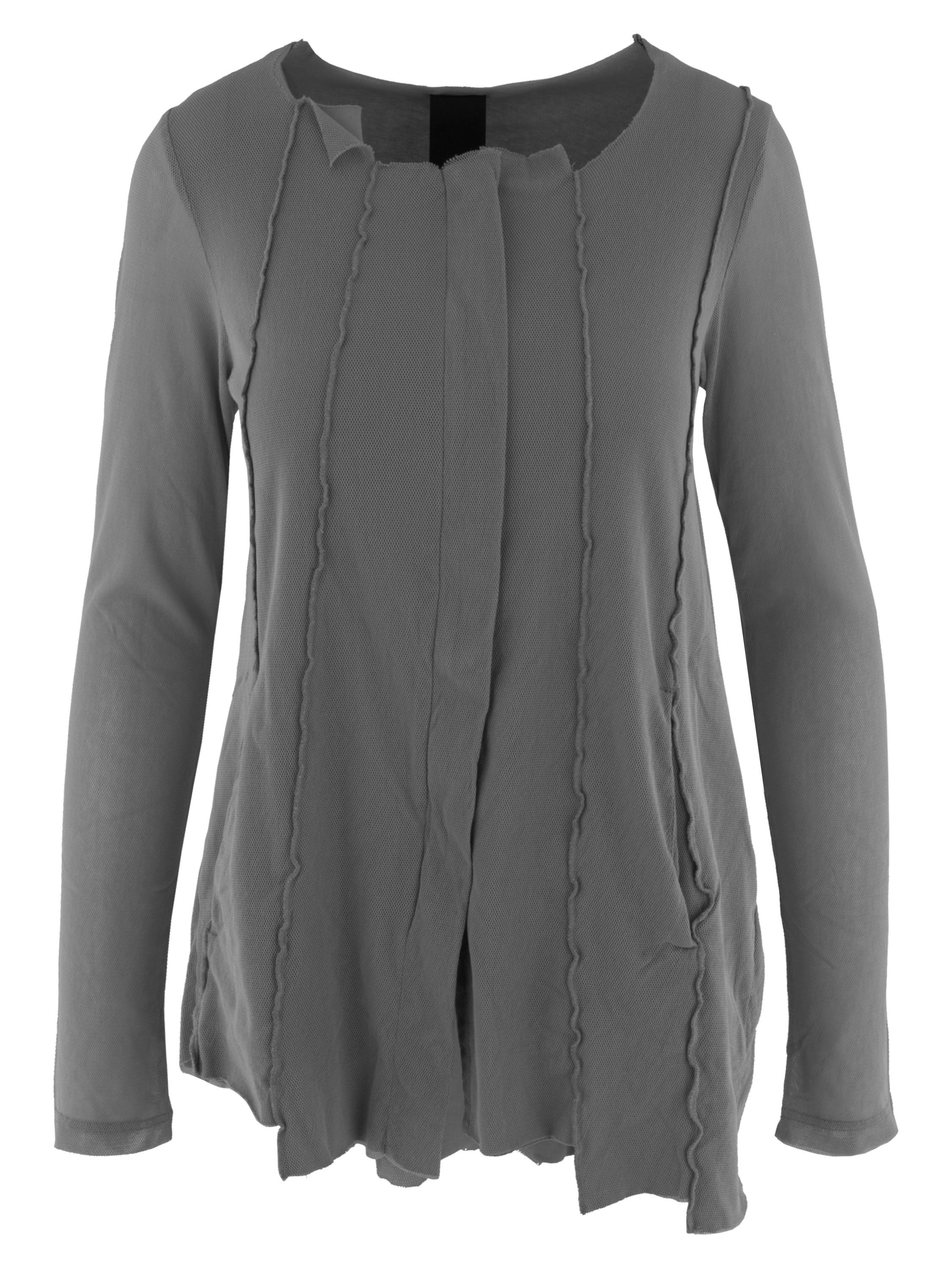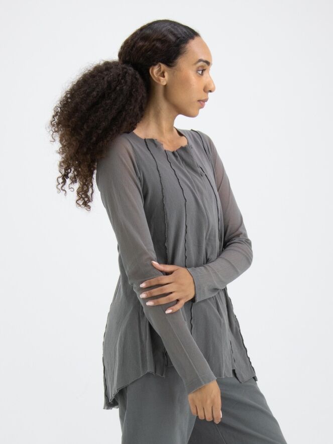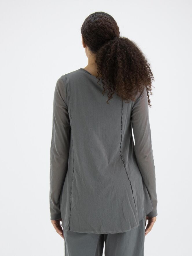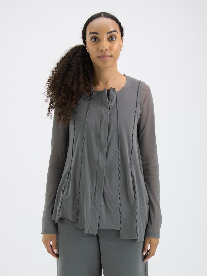 Een vest van Rundholz Black Label in een zachte donkergrijze kleur. Het vest heeft over de basisstof een voile transparante stof die in de lange mouwen mooi tot uiting komt. Het vest heeft vanuit de onregelmatige ronde hals meerdere omgekeerde stiknaden naar beneden. Dit vest mag op 30 graden worden gewassen.