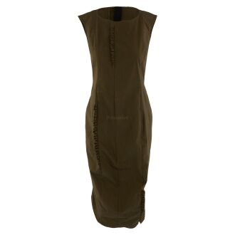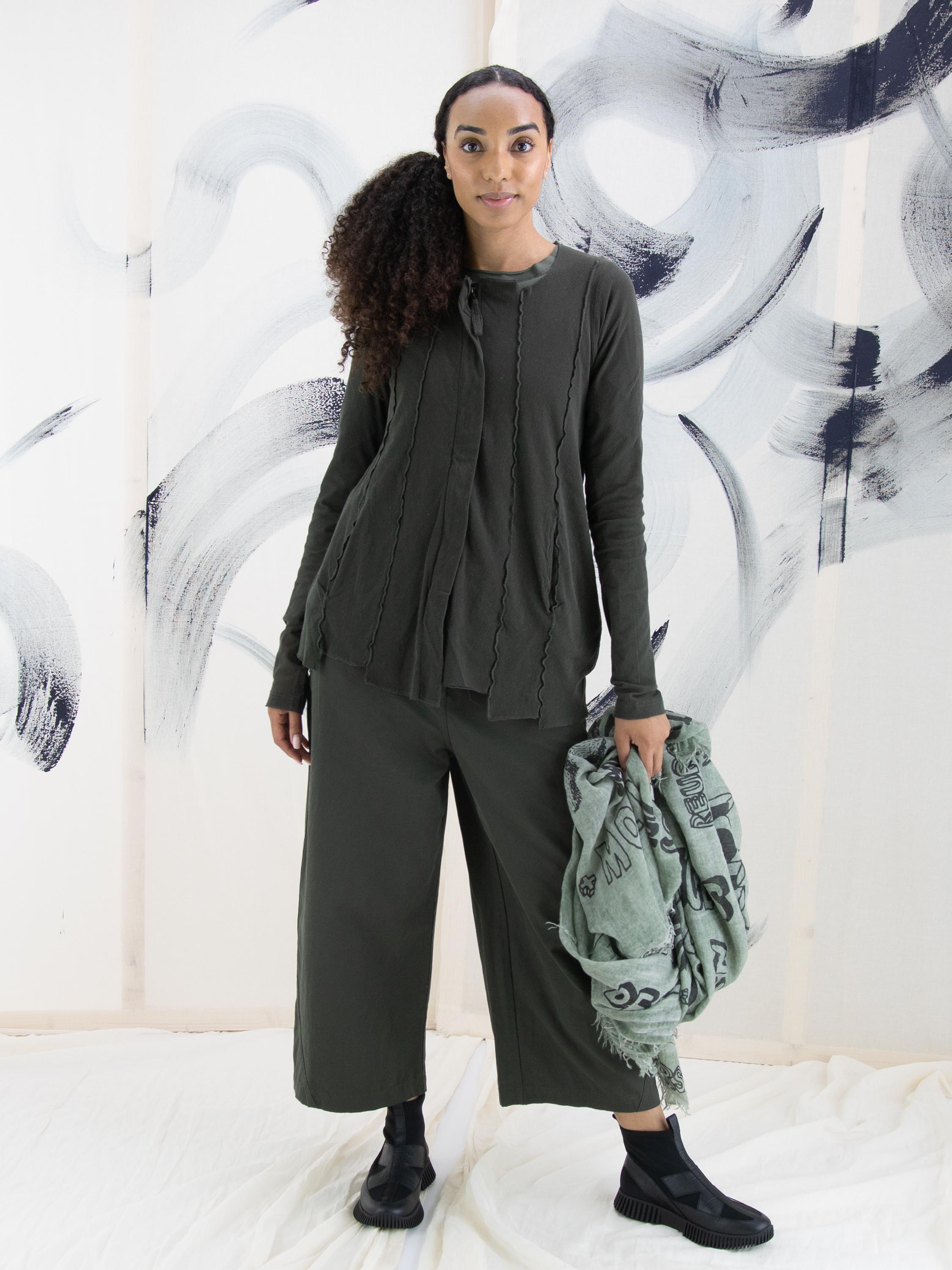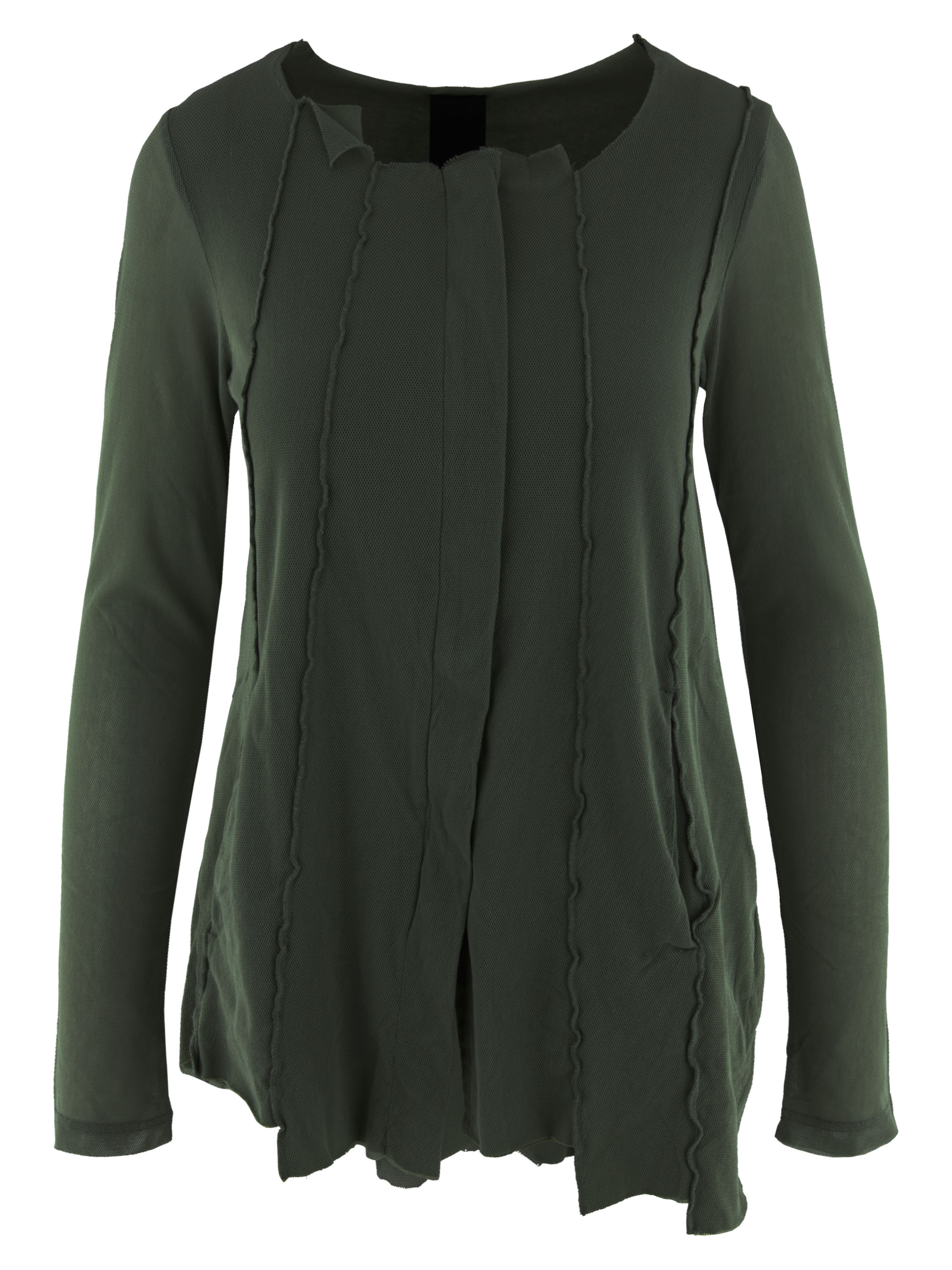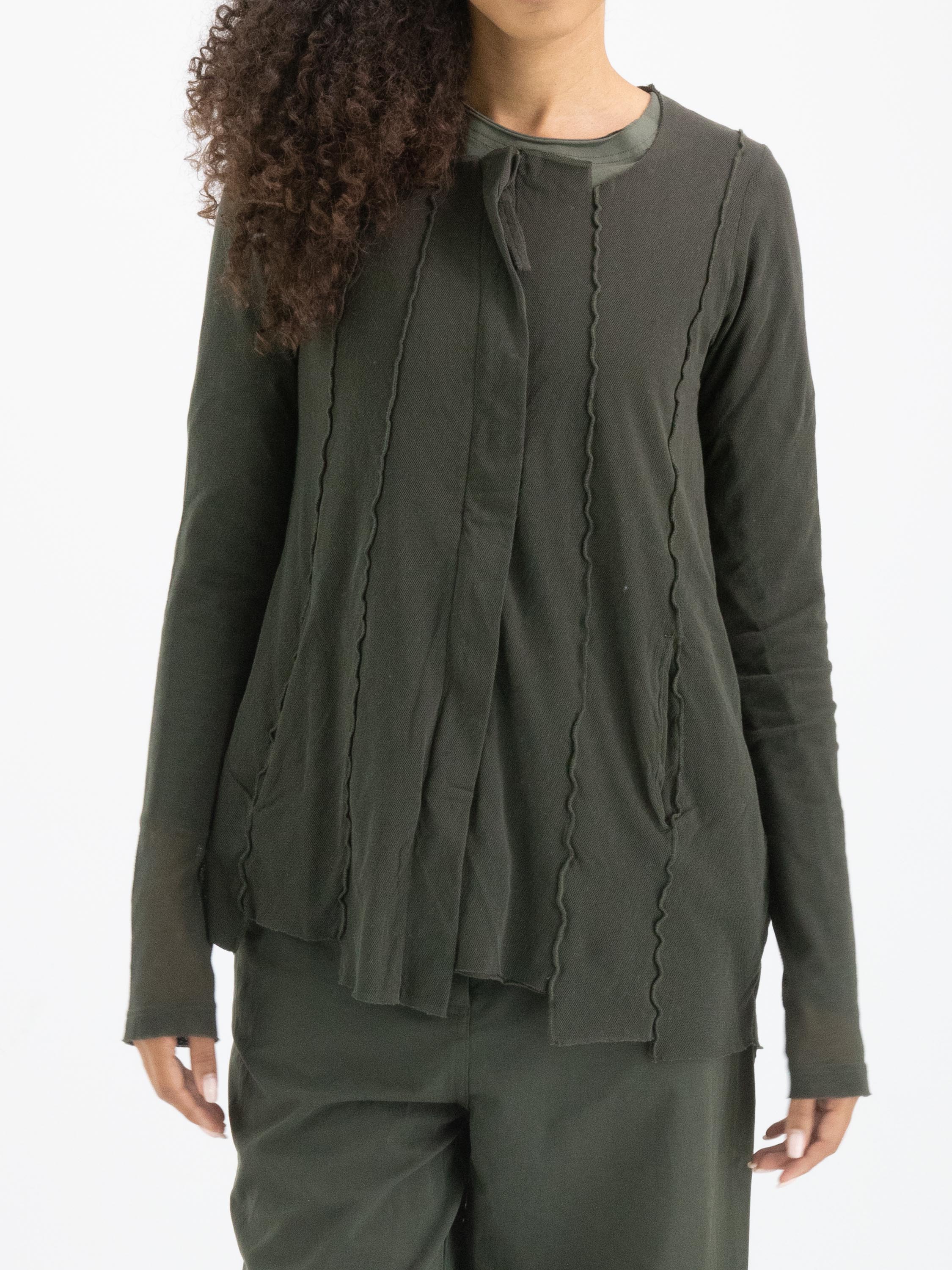 Een vest van Rundholz Black Label in een khaki kleur. Het vest heeft over de basisstof een voile transparante stof die in de lange mouwen mooi tot uiting komt. Het vest heeft vanuit de onregelmatige ronde hals meerdere omgekeerde stiknaden naar beneden. Dit vest mag op 30 graden worden gewassen.