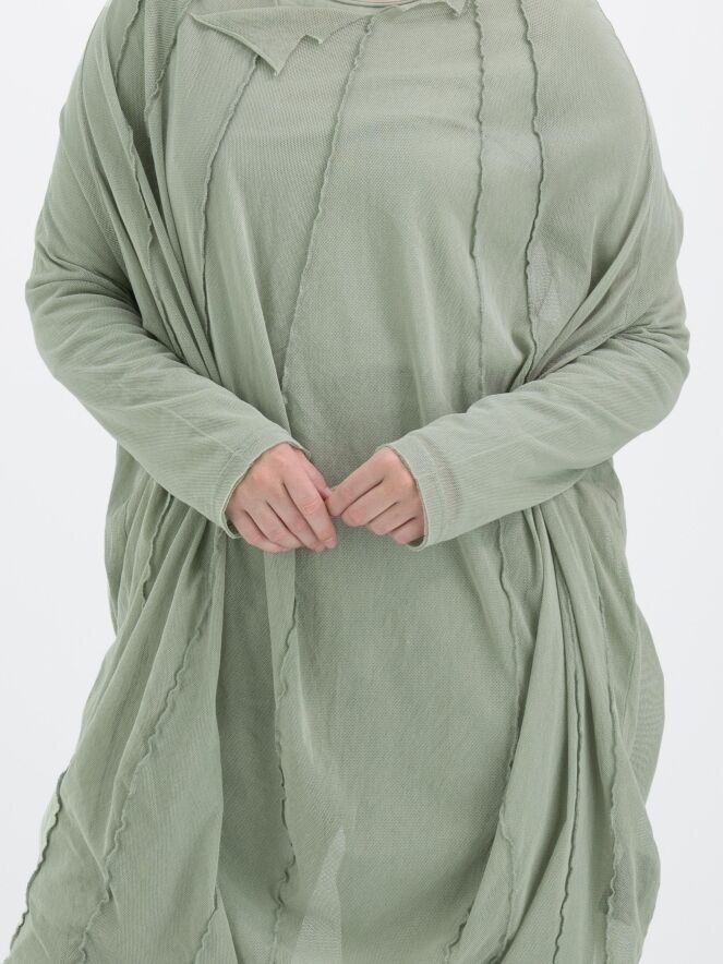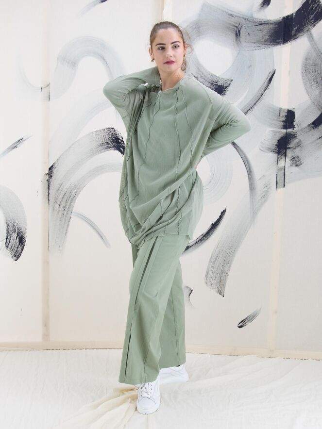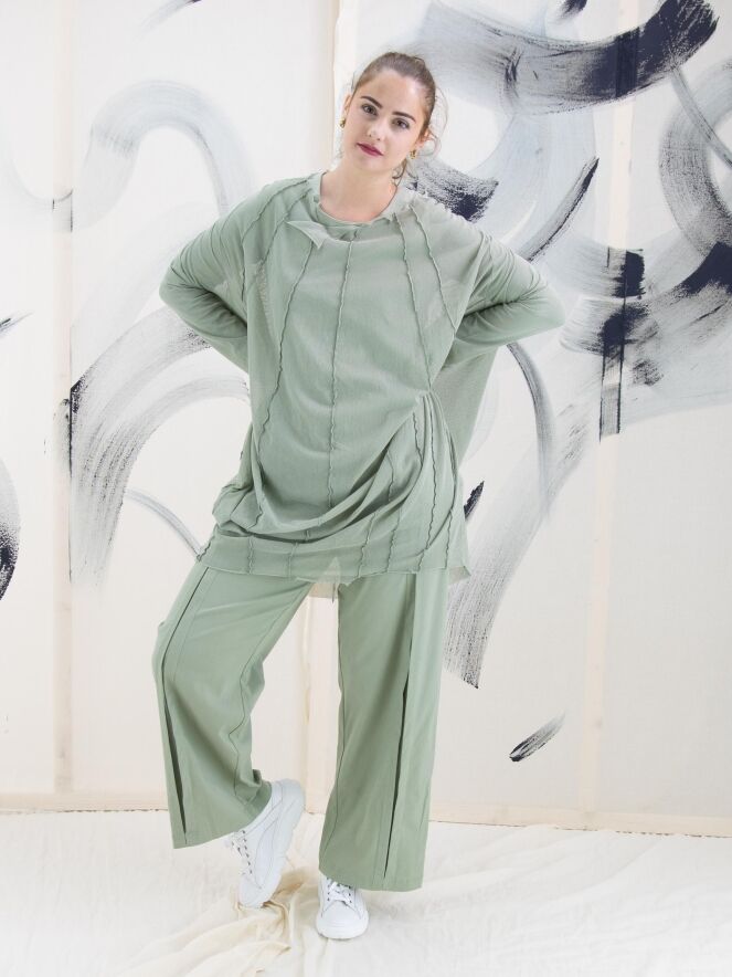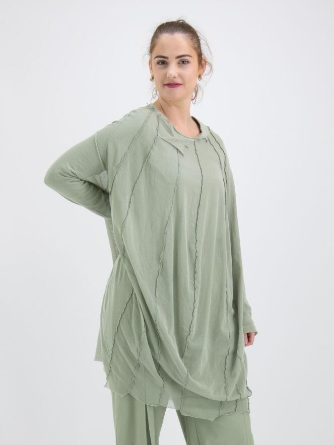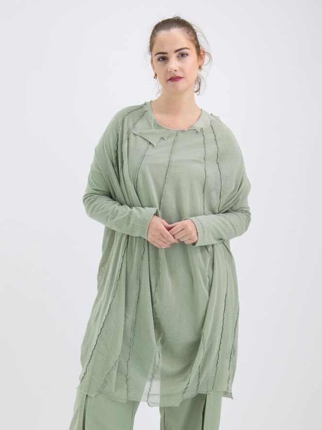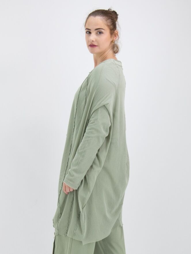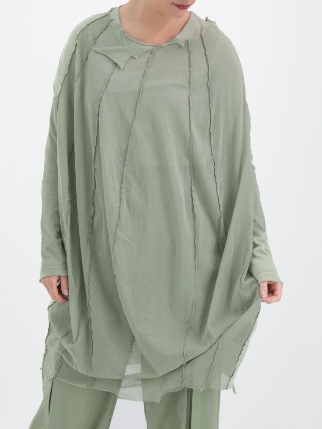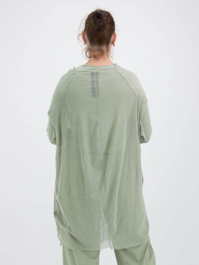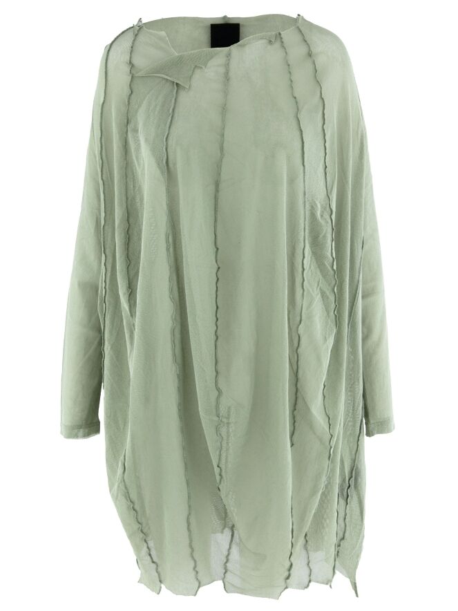 Een transparant shirt van Rundholz Black Label in een zachte olijfkleur. Vanuit de wijde, onafgewerkte ronde hals lopen meerdere omgekeerde stiknaden naar beneden. Het shirt heeft lange mouwen en mag op 30 graden worden gewassen.