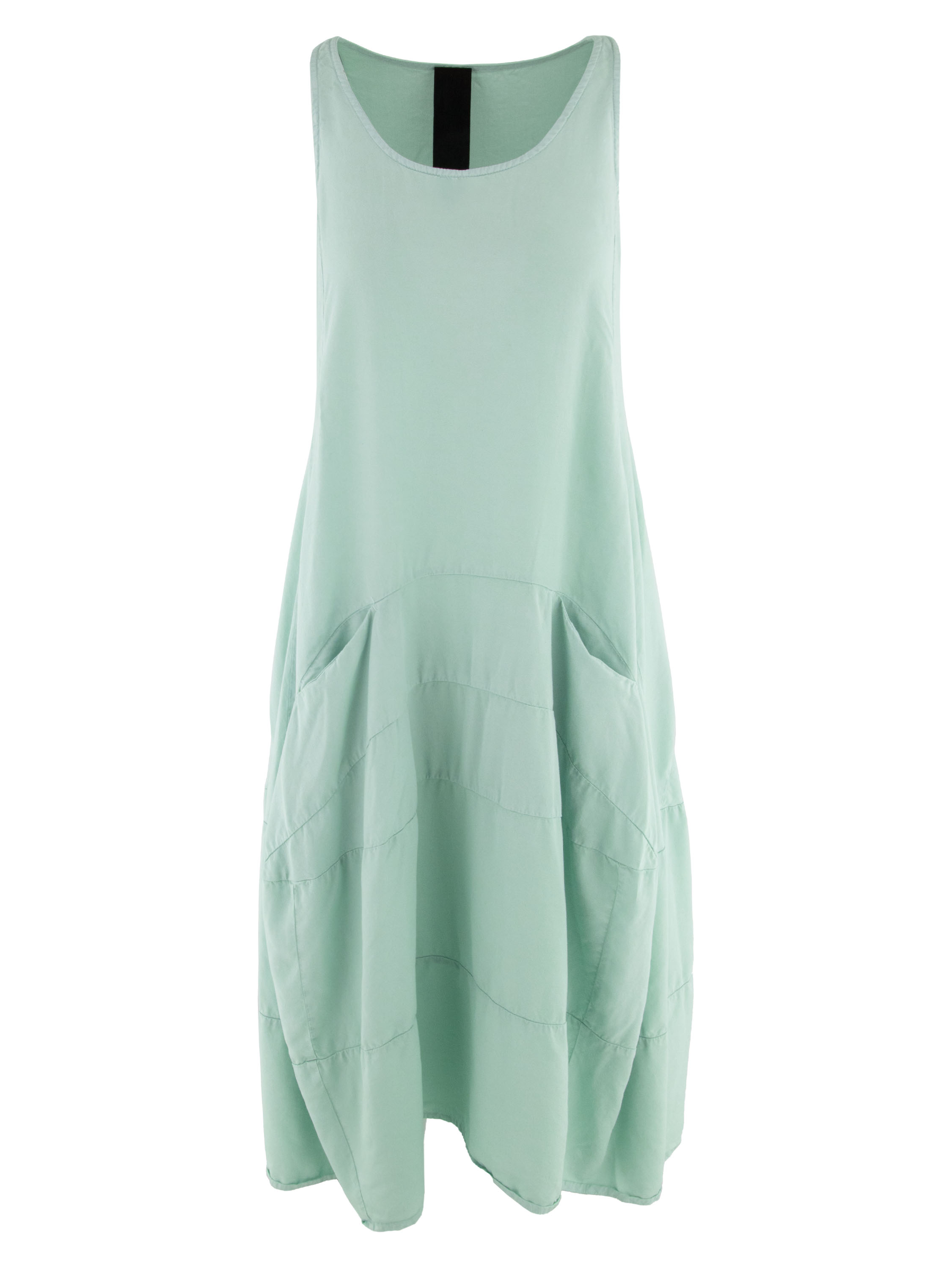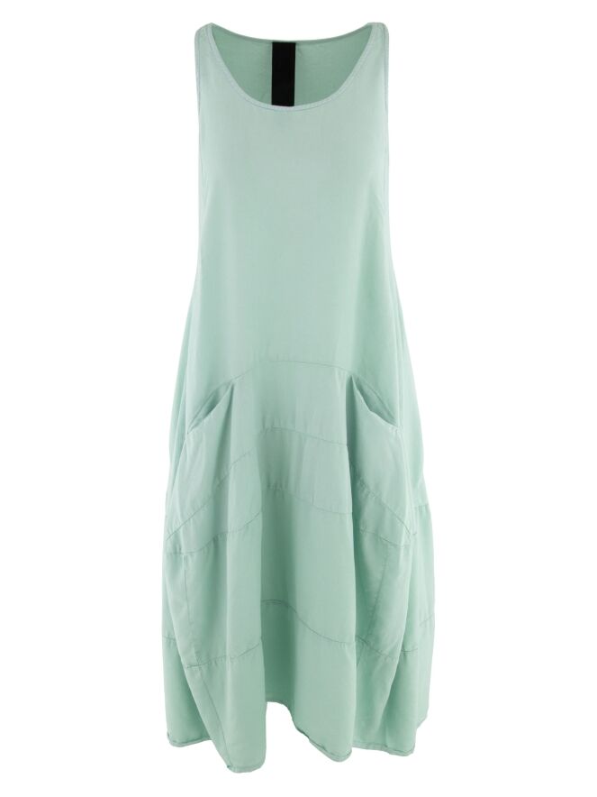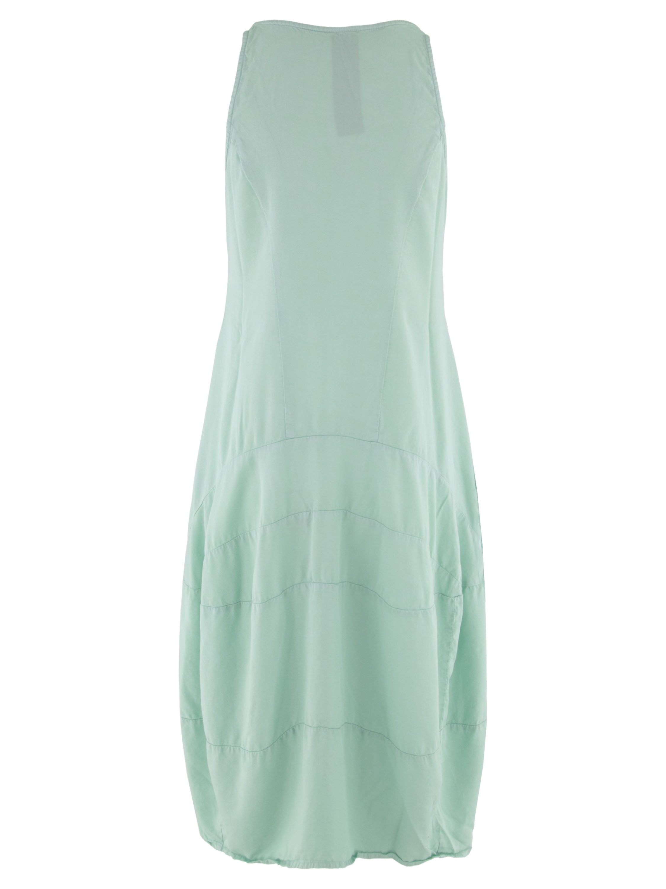 Mouwloze jurk van Rundholz Black Label in een frisse mintgroene tint. De jurk heeft een lichte A-lijn en is vanaf de taille voorzien van meerdere horizontale stiknaden, die samen een subtiele ballonvorm creëren. Ter hoogte van de taille zijn praktische steekzakken verwerkt. Deze exclusieve designerjurk kan op 30 graden worden gewassen.