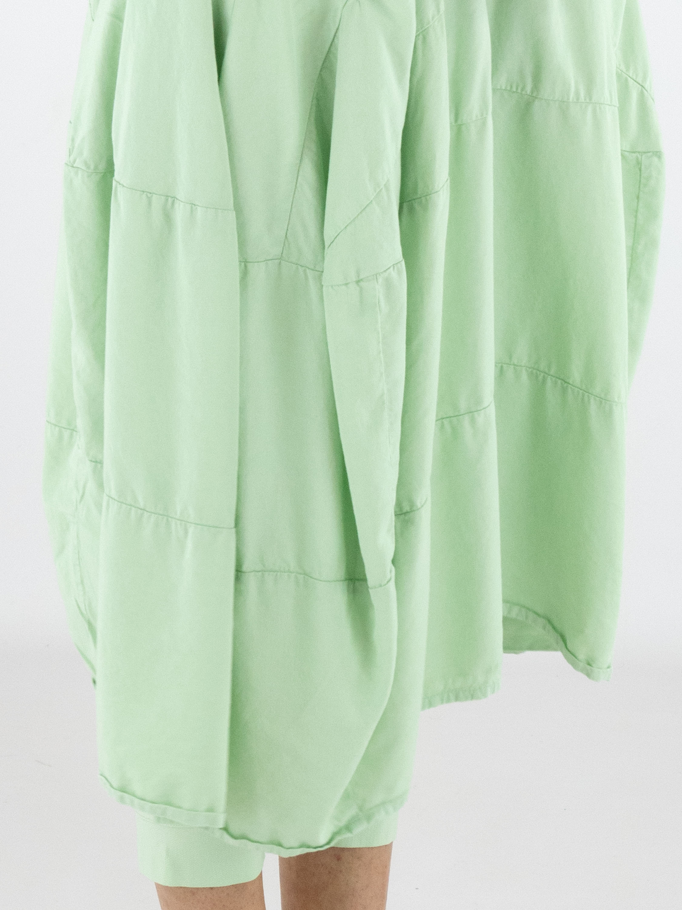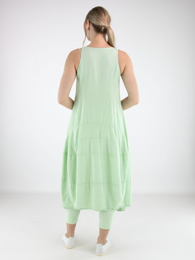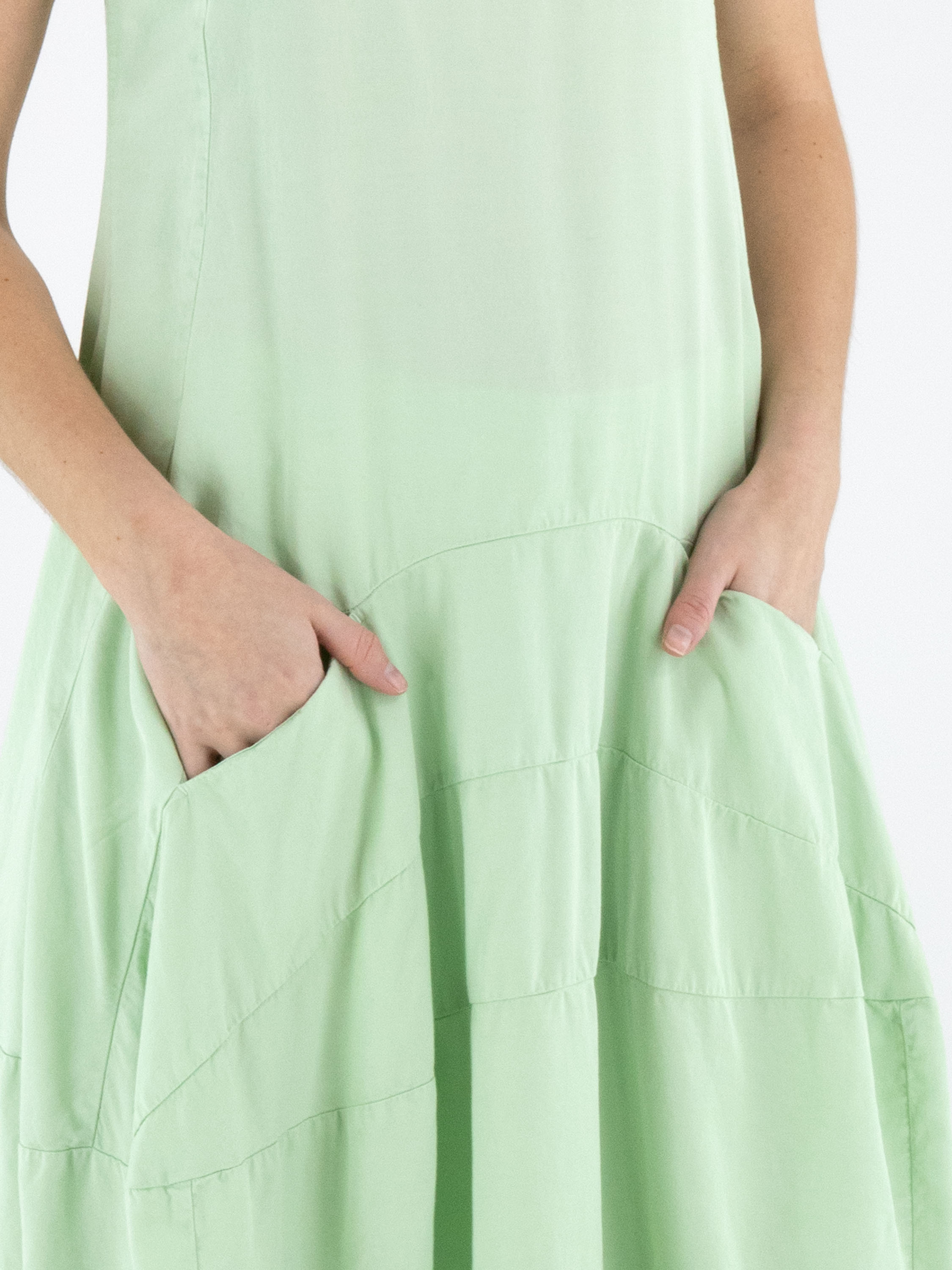 Mouwloze jurk van Rundholz Black Label in een frisse pistachegroene tint. De jurk heeft een lichte A-lijn en vanaf de taille zorgen meerdere horizontale stiknaden voor structuur en een subtiele ballonvorm. Ter hoogte van de taille zijn steekzakken verwerkt, wat het ontwerp een praktisch en eigentijds karakter geeft. Deze exclusieve designerjurk kan op 30 graden worden gewassen.