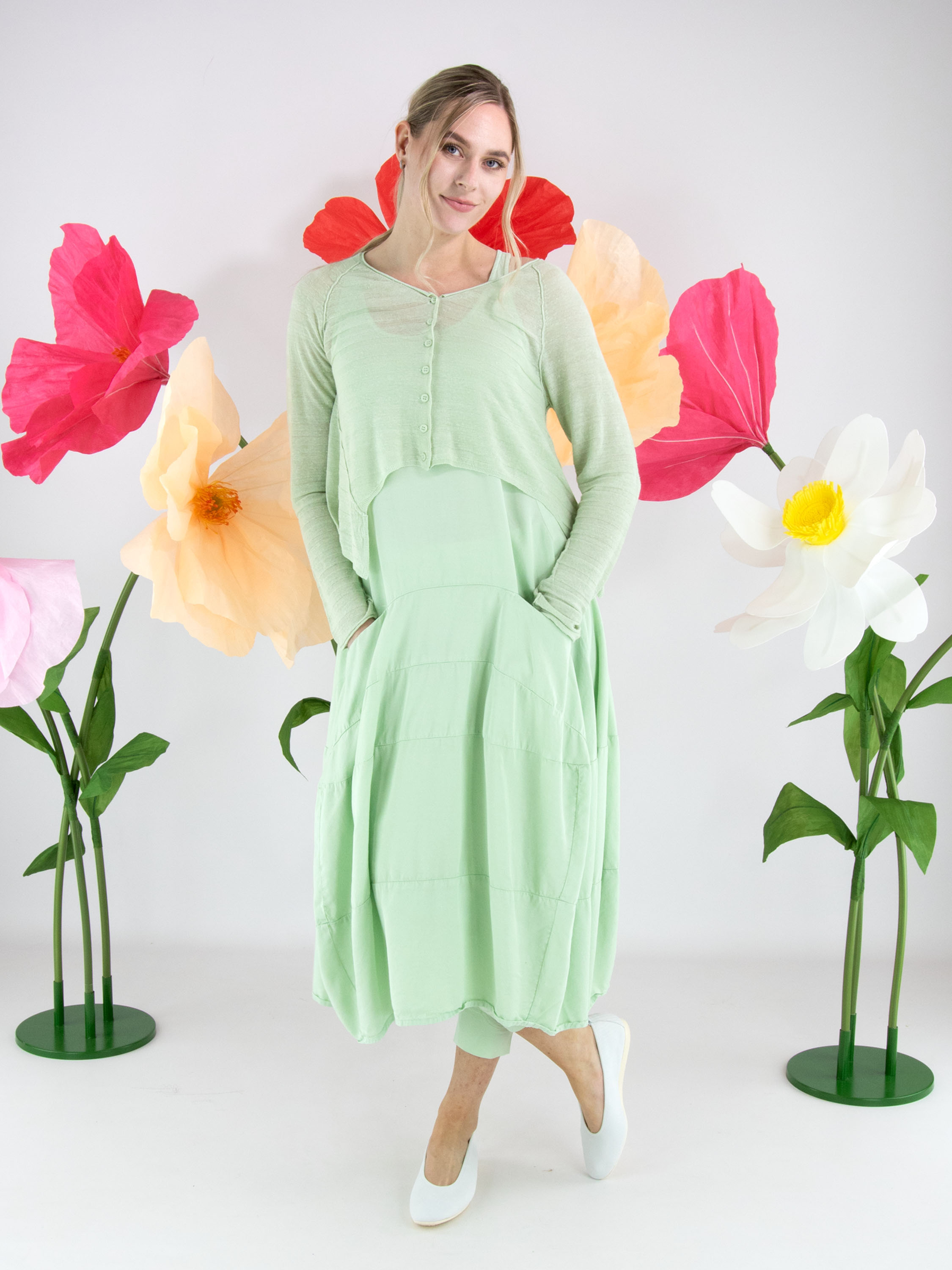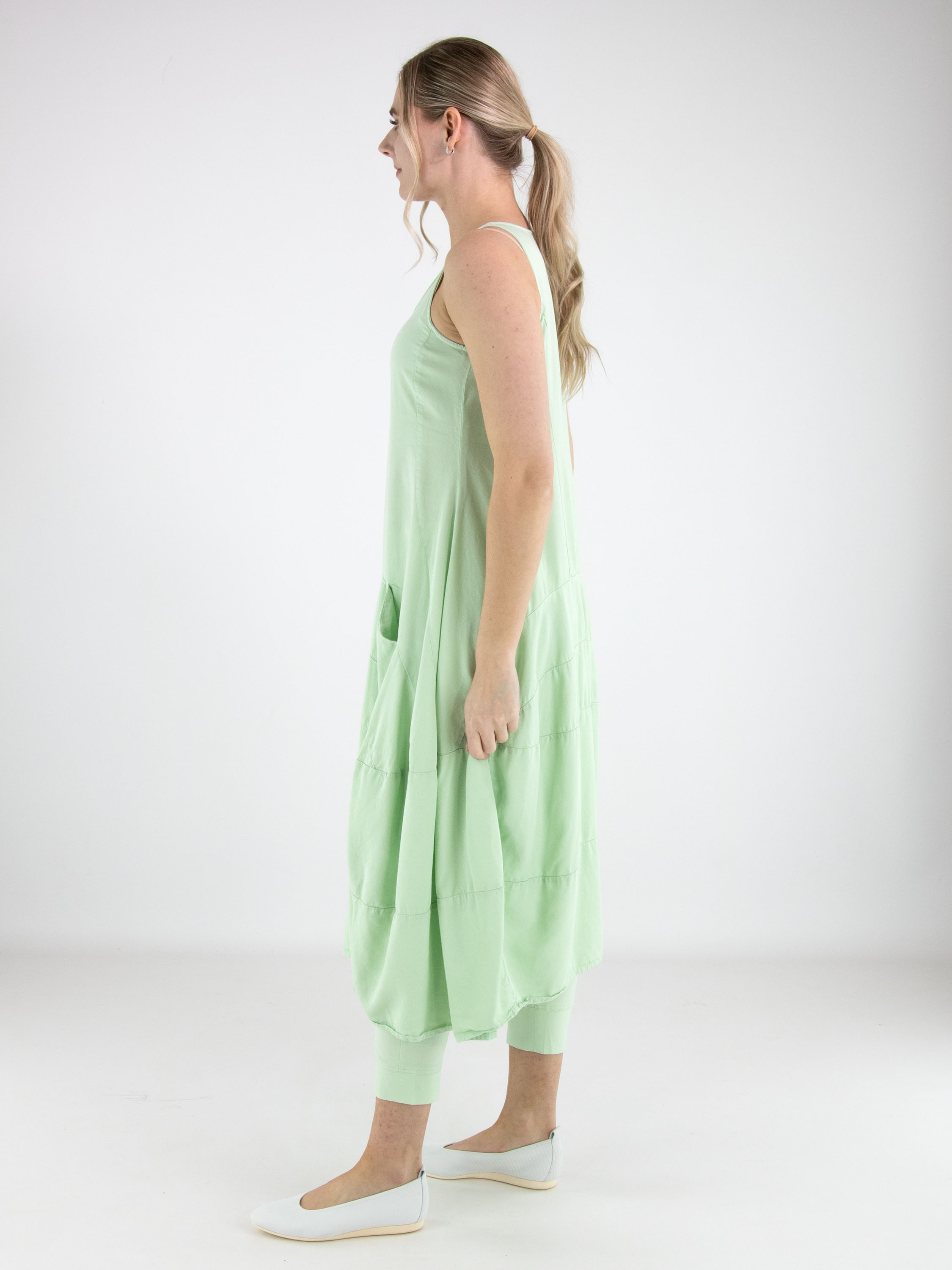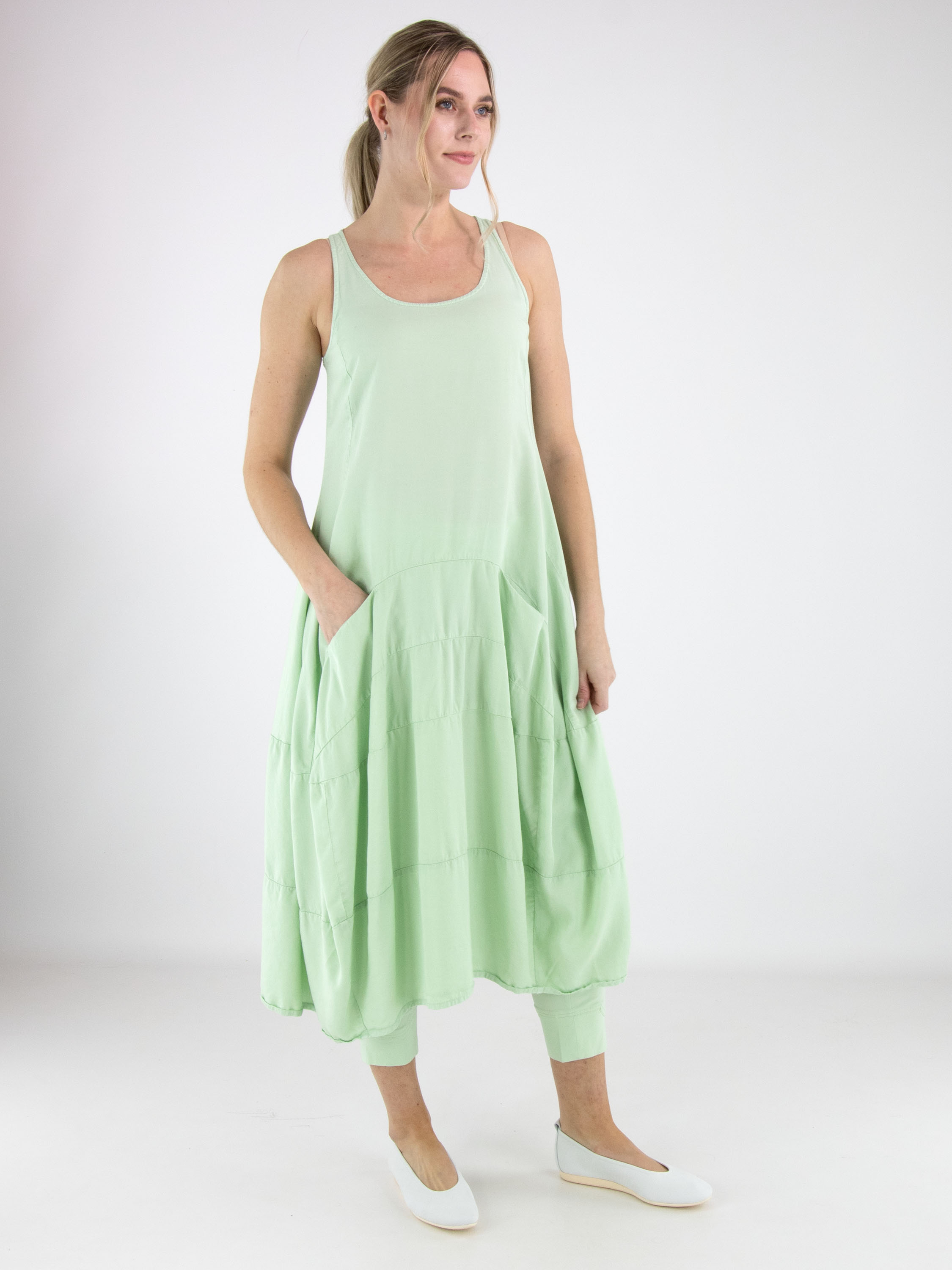 Mouwloze jurk van Rundholz Black Label in een frisse pistachegroene tint. De jurk heeft een lichte A-lijn en vanaf de taille zorgen meerdere horizontale stiknaden voor structuur en een subtiele ballonvorm. Ter hoogte van de taille zijn steekzakken verwerkt, wat het ontwerp een praktisch en eigentijds karakter geeft. Deze exclusieve designerjurk kan op 30 graden worden gewassen.