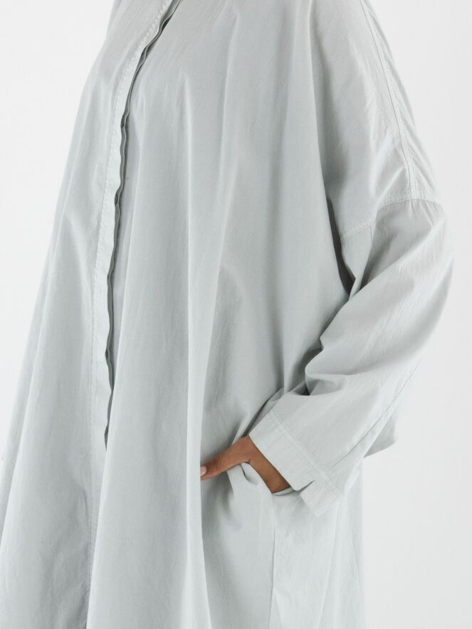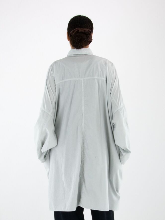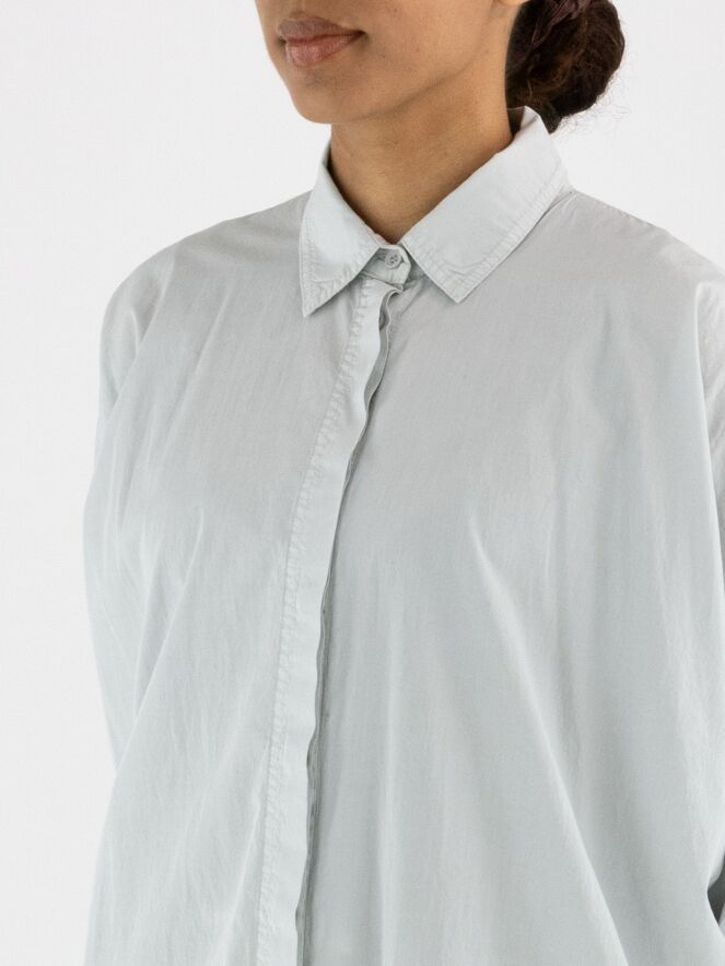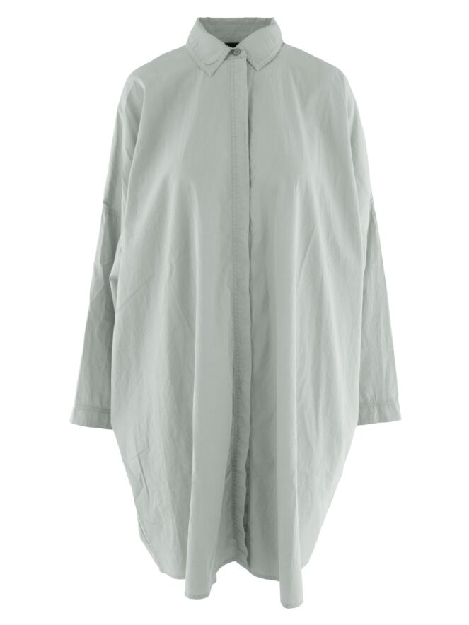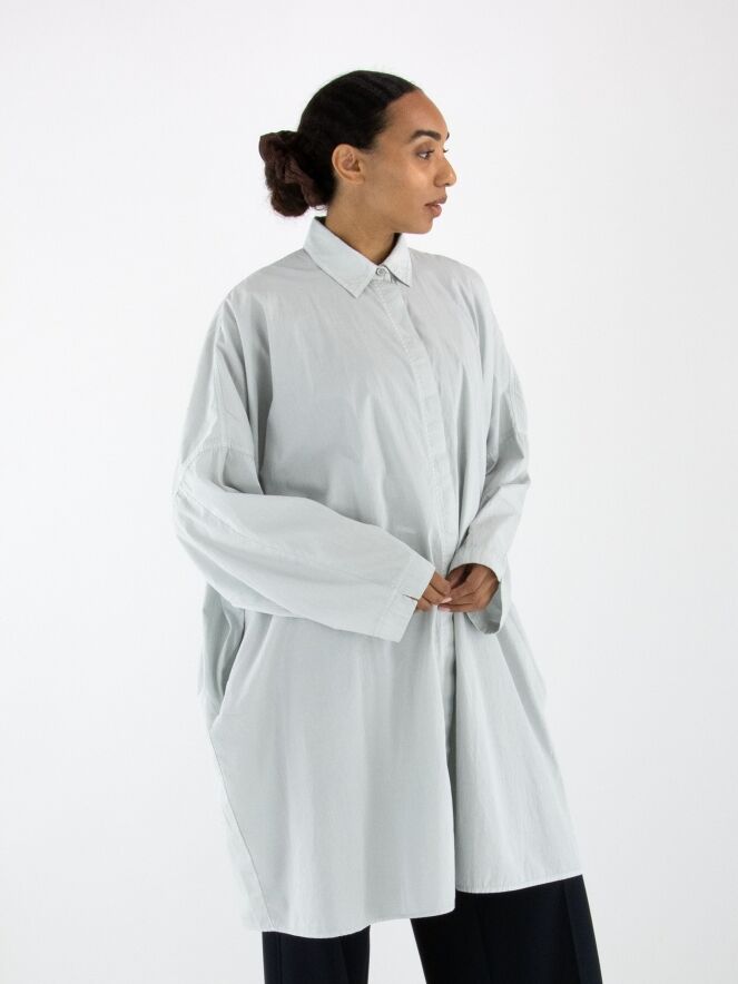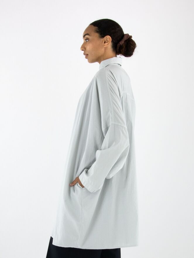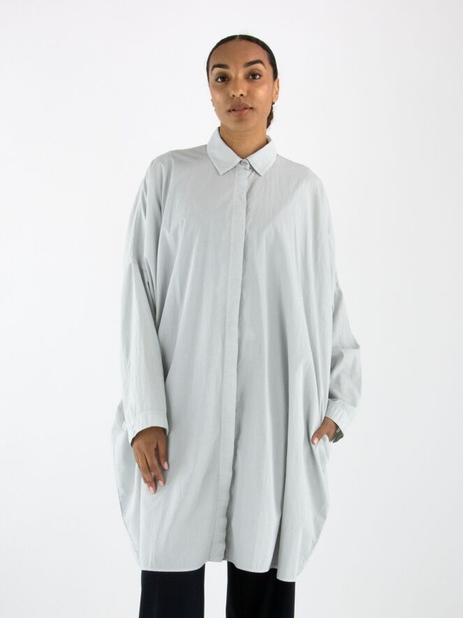 Een wijde, lange blouse van Rundholz Black Label in lichtgrijs. De blouse heeft een blinde knoopsluiting en mag op 30 graden worden gewassen.