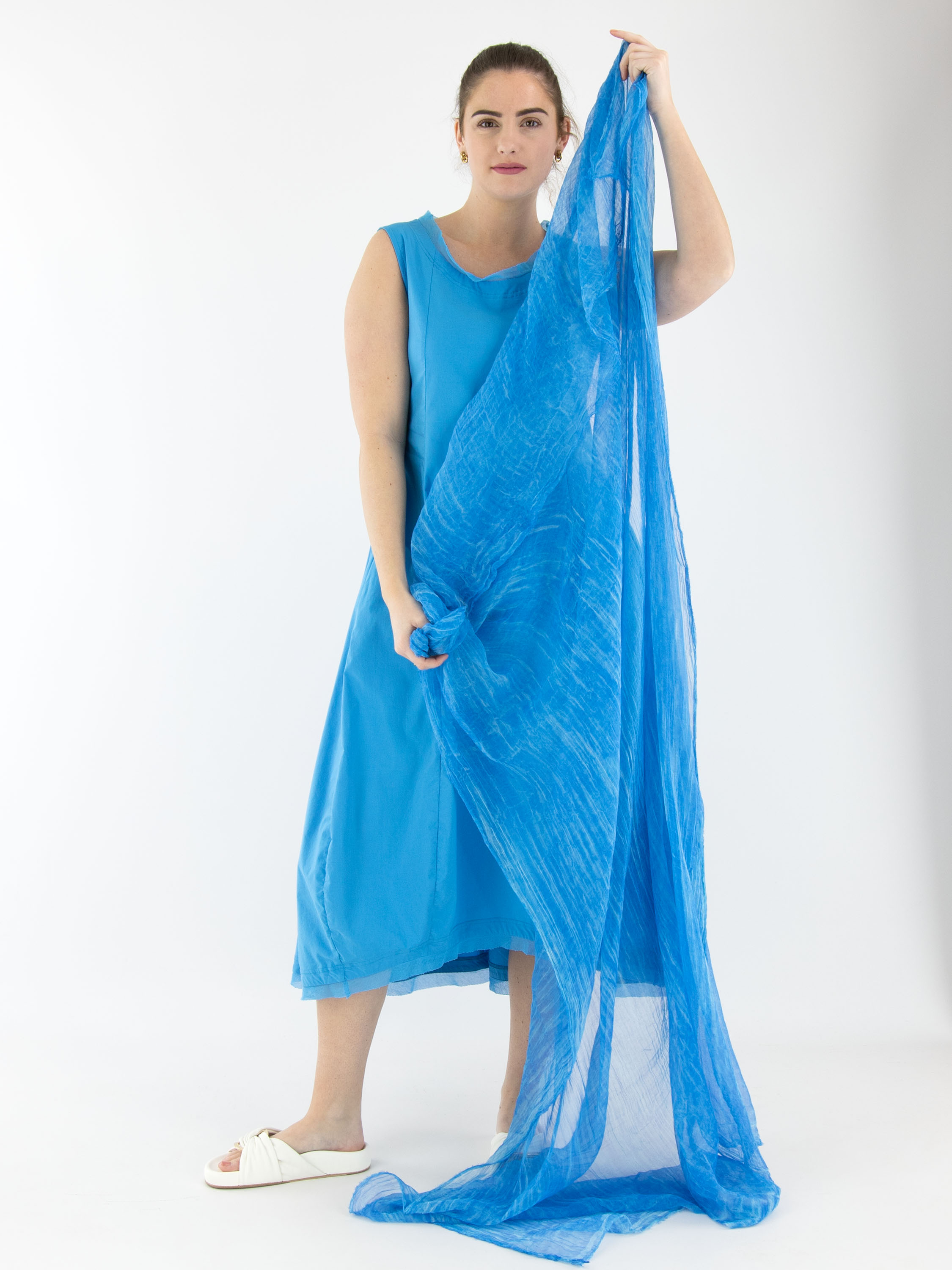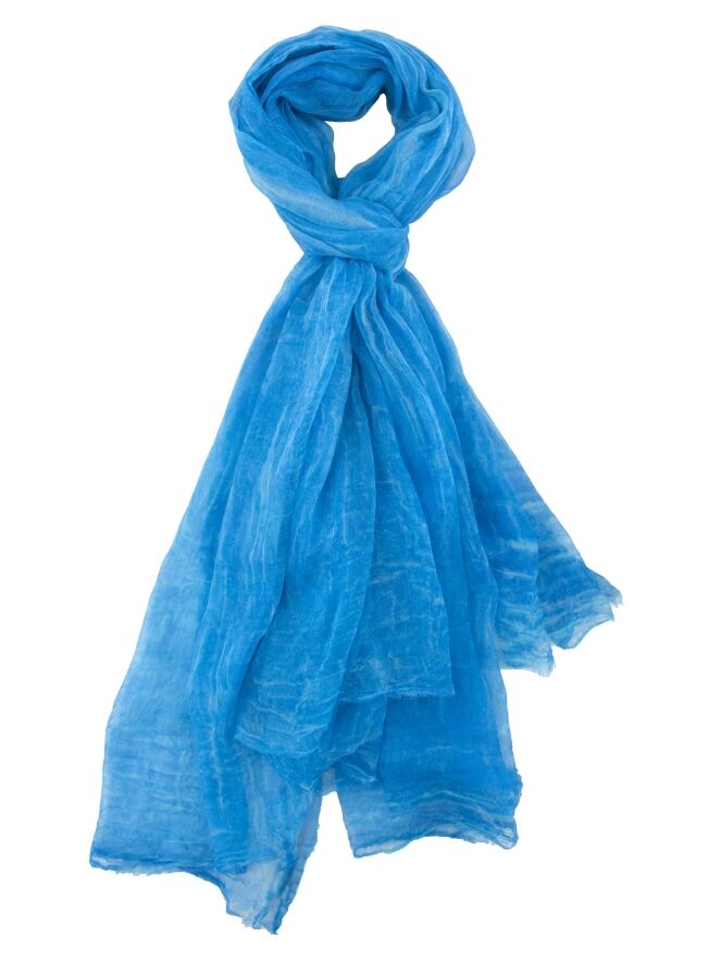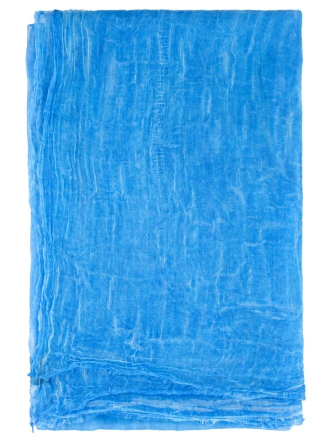 Een licht transparante gemêleerde shawl in meerdere tinten helderblauw. De randen van de shawl zijn fijn gerafeld. Deze shawl mag op de hand worden gewassen.