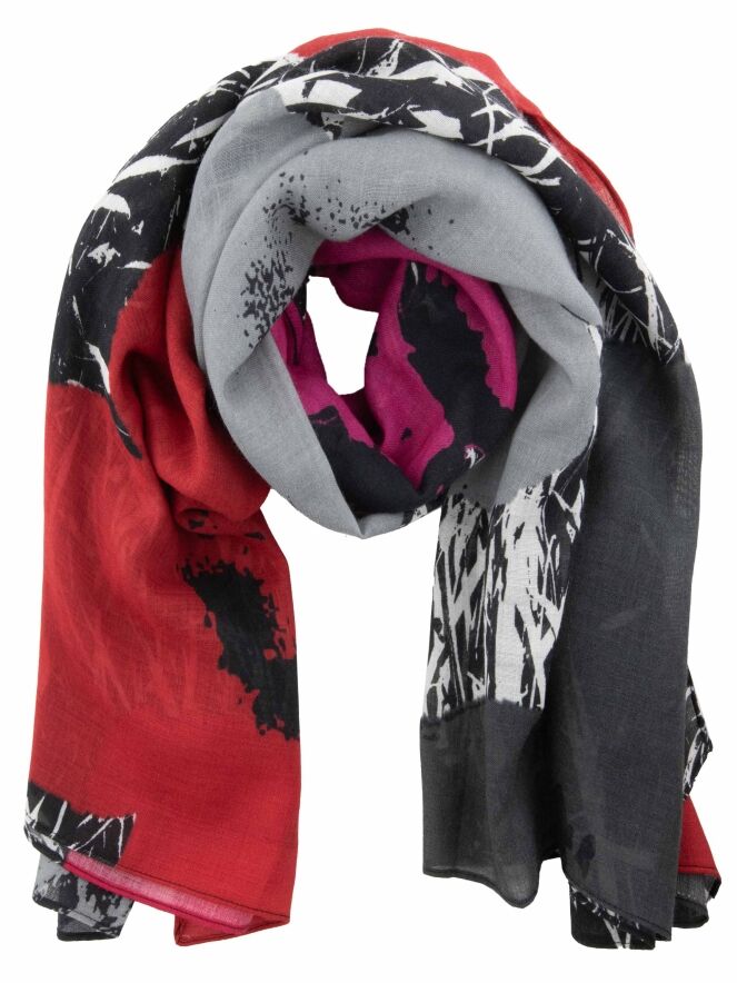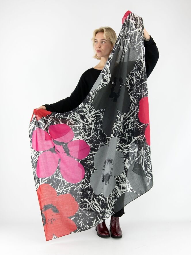 Licht transparante shawl van Rundholz Black Label met een bijzondere bloemenprint op een grafisch dessin van takken. De bloemen in grijs, roze en rood zorgen voor een stijlvol contrast en geven de shawl een artistieke, eigentijdse uitstraling. Deze luxe shawl kan met de hand worden gewassen.