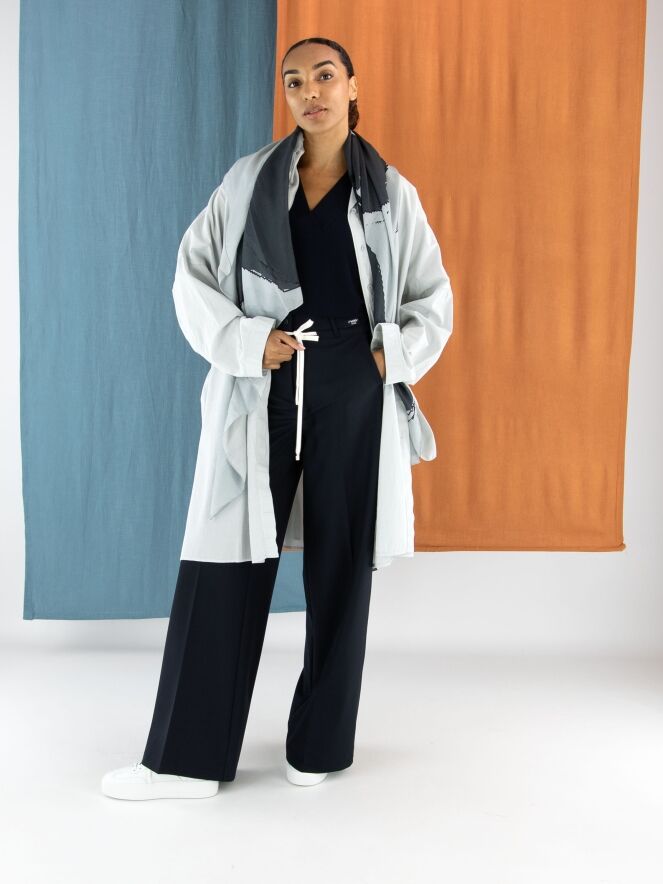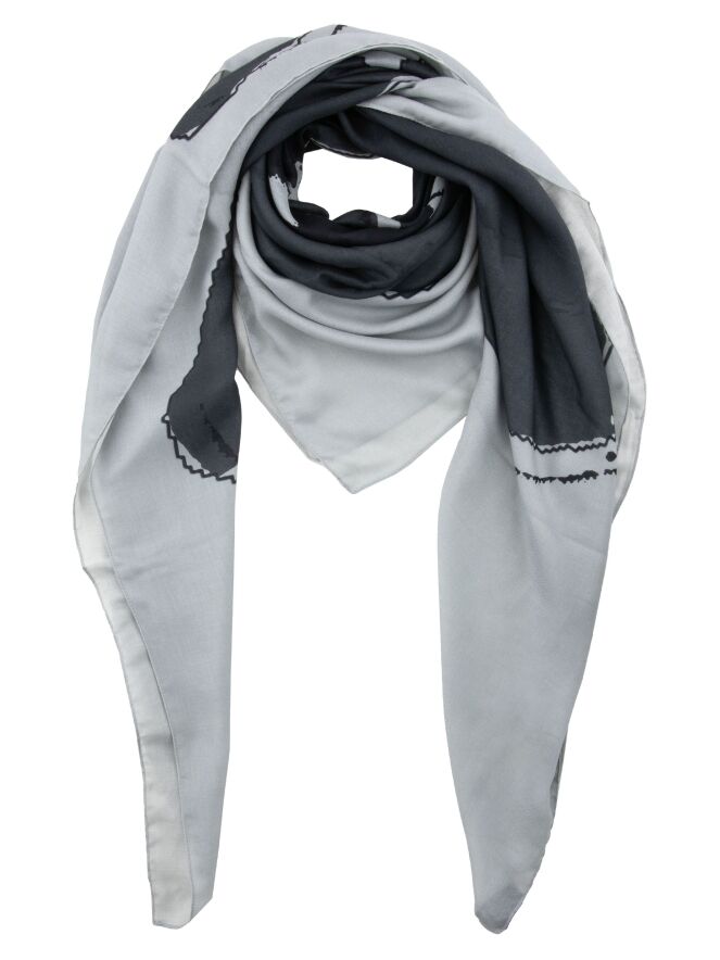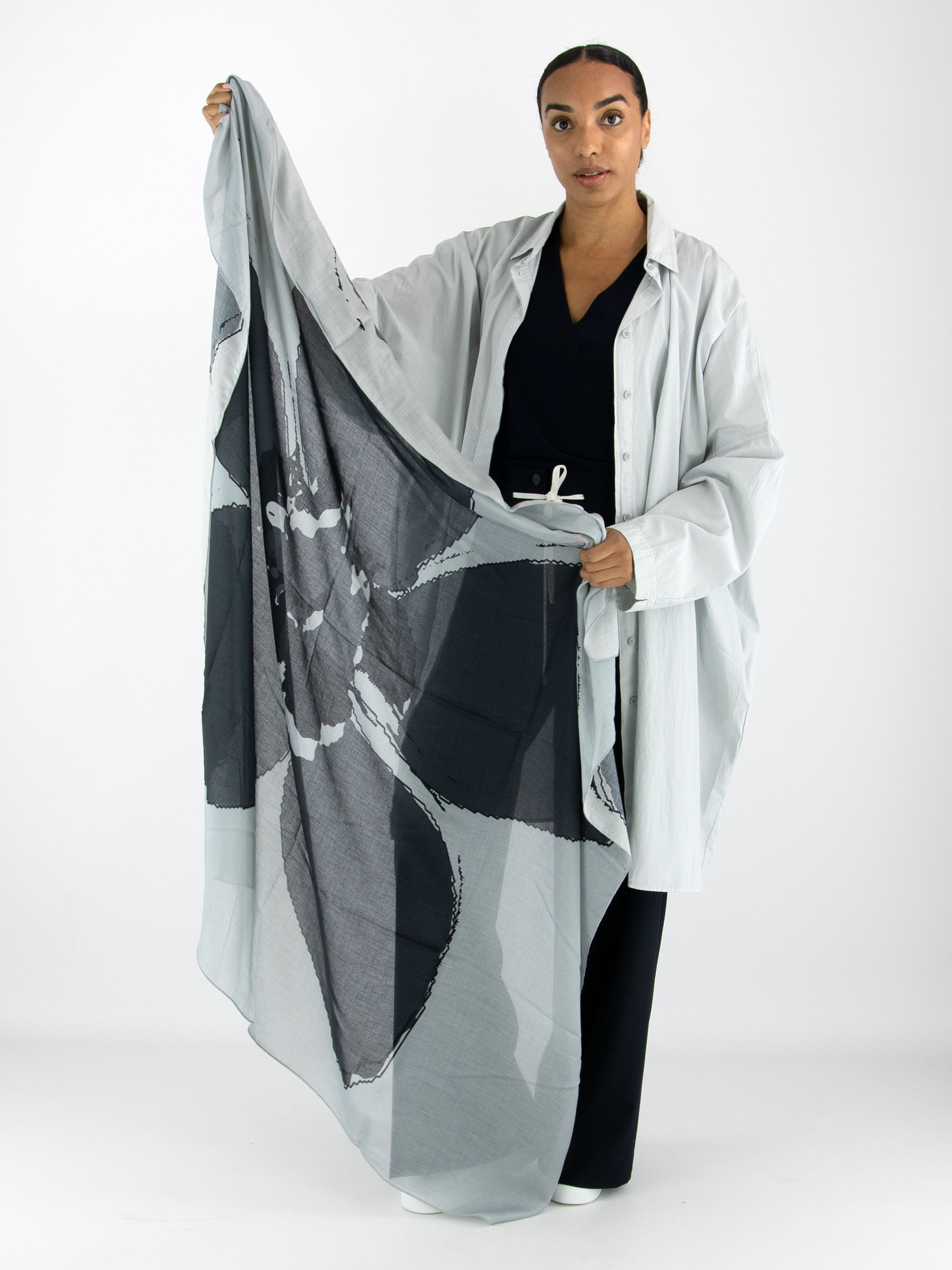 Een shawl van Rundholz Black Label met een print van een grote bloem in meerdere tinten grijs en zwart. De shawl is licht transparant en mag met de hand worden gewassen.