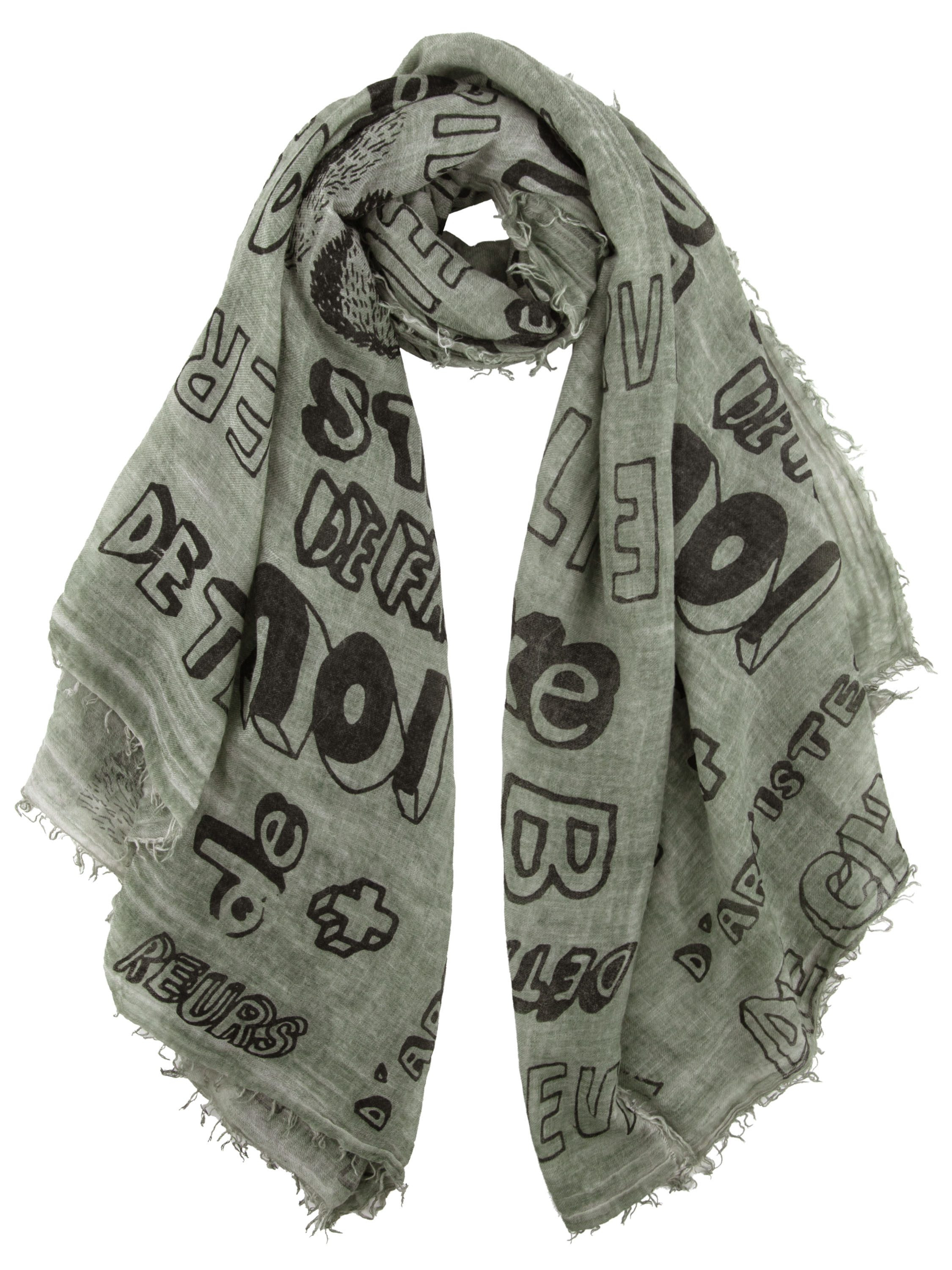 Een shawl van Rundholz Black Label in een tekstenprint met meerdere tinten olijfgroen en zwart. Langs de randen zijn franjes. Deze shawl mag met de hand worden gewassen.