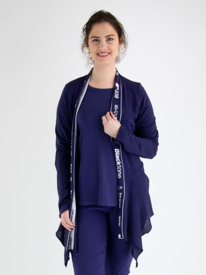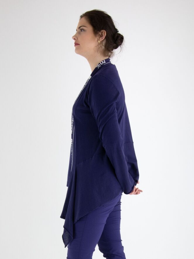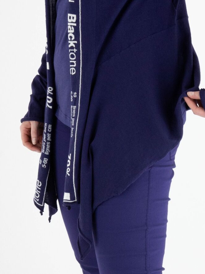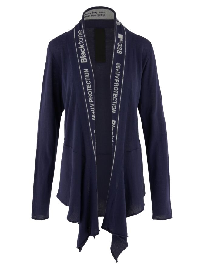 Een licht transparant vest van Rundholz Black label in de kleur indigo blauw. Het vest heeft geen sluiting en langs de rand van de kraag is een brede bies tot aan de onderkant van het vest in een indigoblauw witte letterprint. Het vest heeft lange mouwen en mag op de hand worden gewassen.