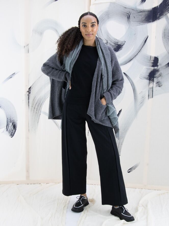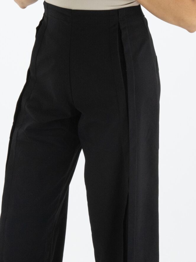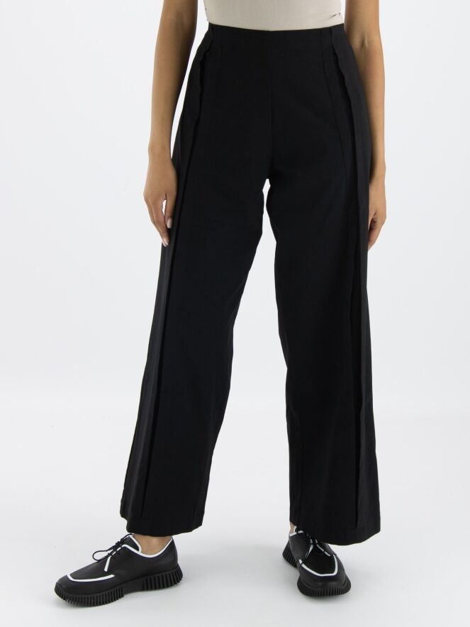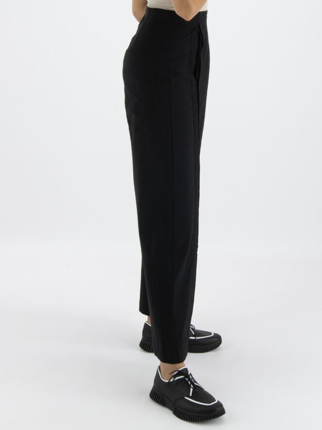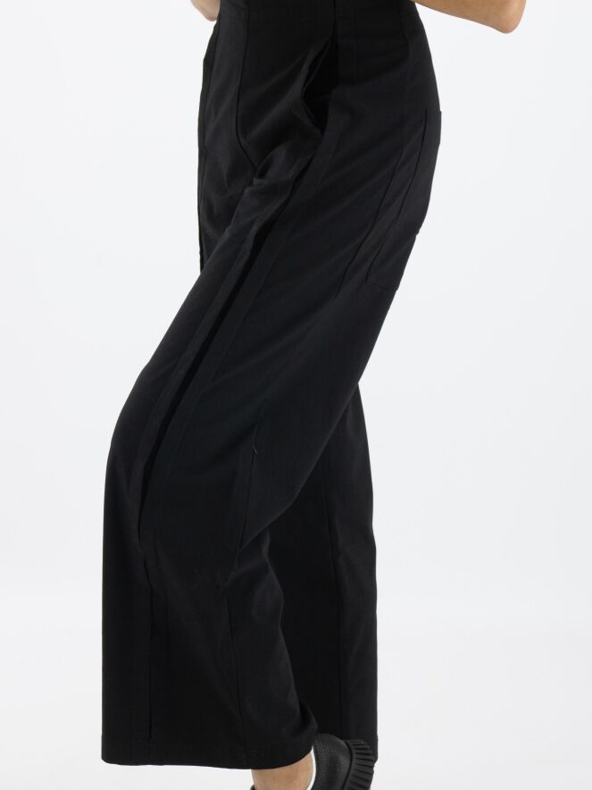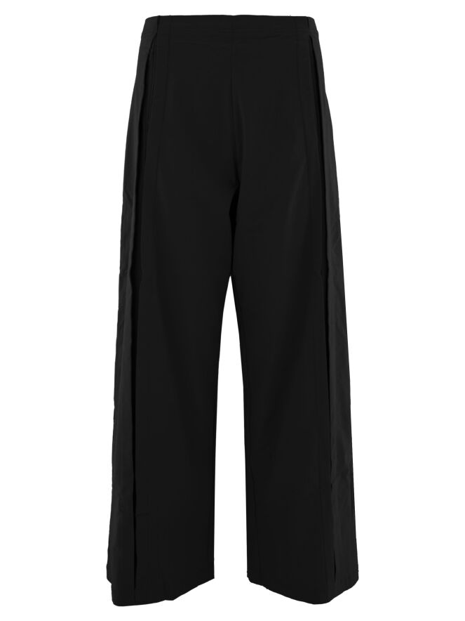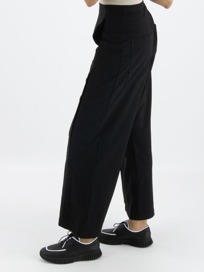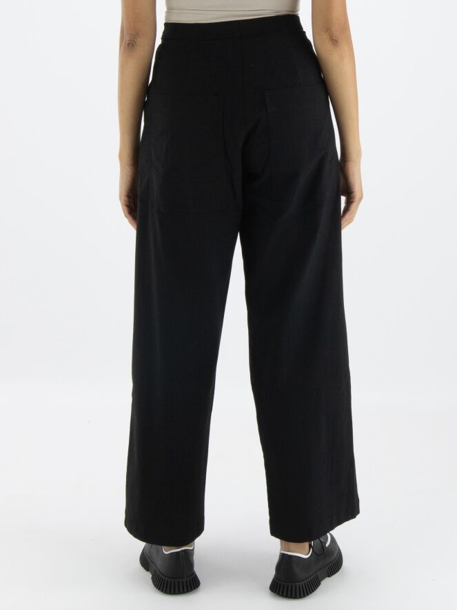 Een broek van Rundholz Black Label in de kleur zwart. Aan de voorzijde, aan de buitenzijde van het midden, zijn twee verticale omgekeerde plooien die openstaan en waarlangs onder de taille steekzakken zijn. In de taille is een elastische band. Aan de achterkant zijn grote, ruime zakken. Deze broek mag op 30 graden worden gewassen.