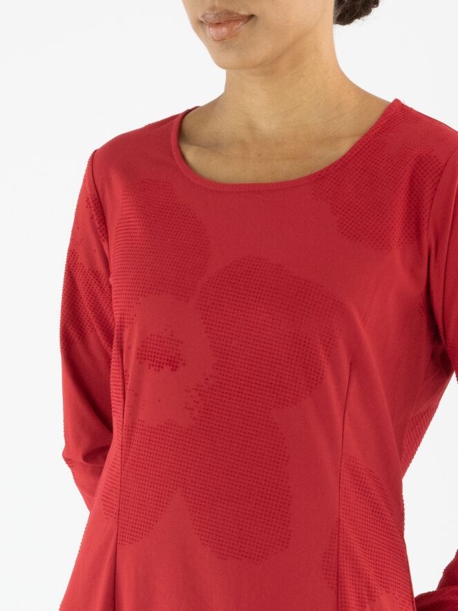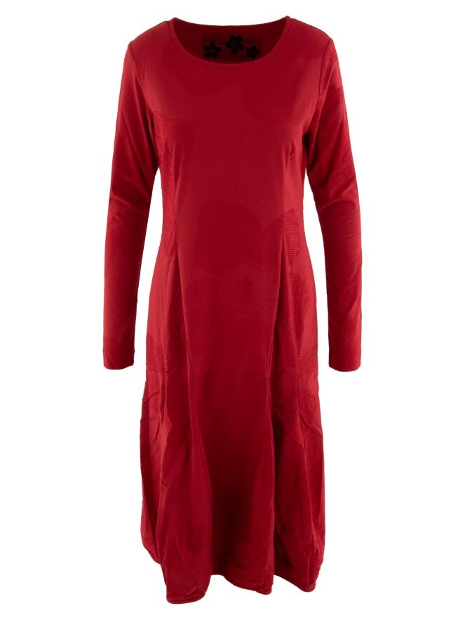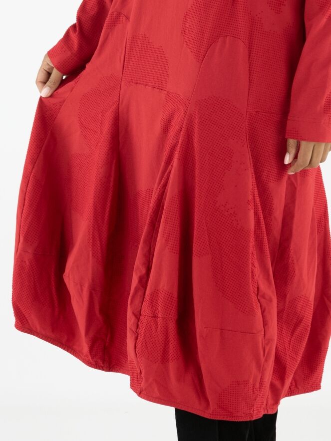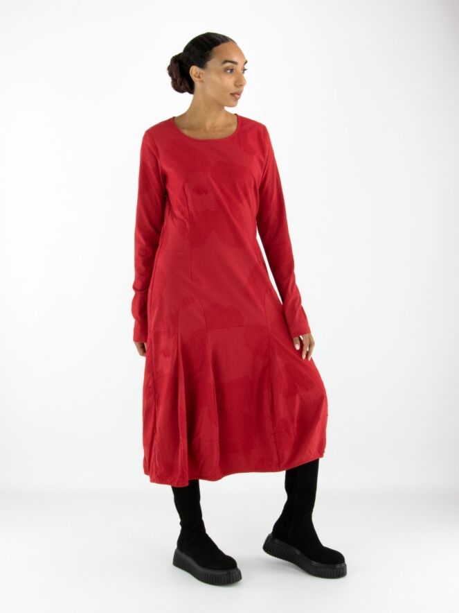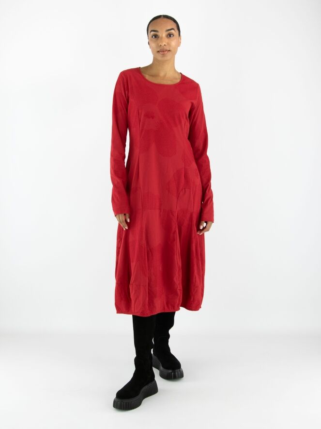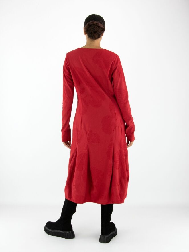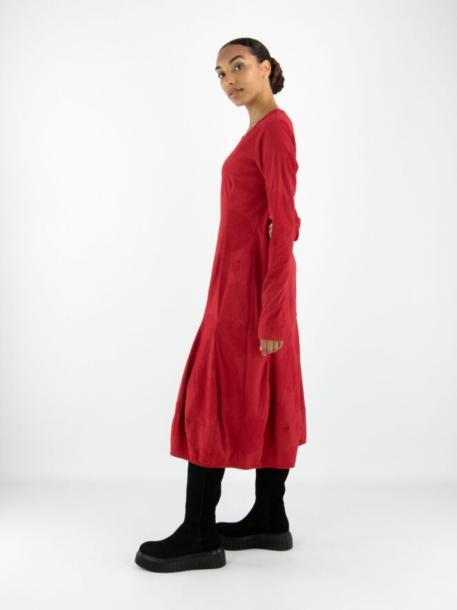 Een jurk van Rundholz Black Label in de kleur rood. De stof heeft een zeer fijn geribbelde structuur en is over de gehele jurk voorzien van delen met kleine velours stipjes. De jurk heeft een ronde hals en loopt vanaf de taille uit in een ballonvorm. Deze jurk mag op 30 graden worden gewassen.