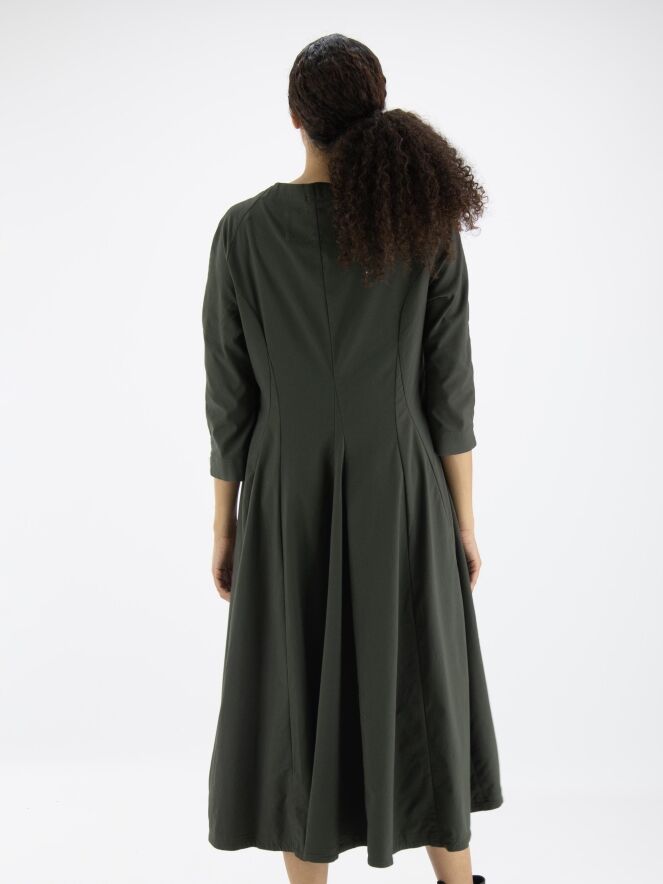 Een jurk van Rundholz Black Label in een khakikleur. Aan de voorzijde zijn twee verticale omgekeerde plooien die openstaan. De jurk heeft een lichte taillelijn en een ballonvorm vanuit de taille. De brede hals heeft vanaf de zijkanten naar de achterzijde een kleine verhoging. Aan het uiteinde van de halflange mouwen is een kort splitje. Deze jurk mag op 30 graden worden gewassen.