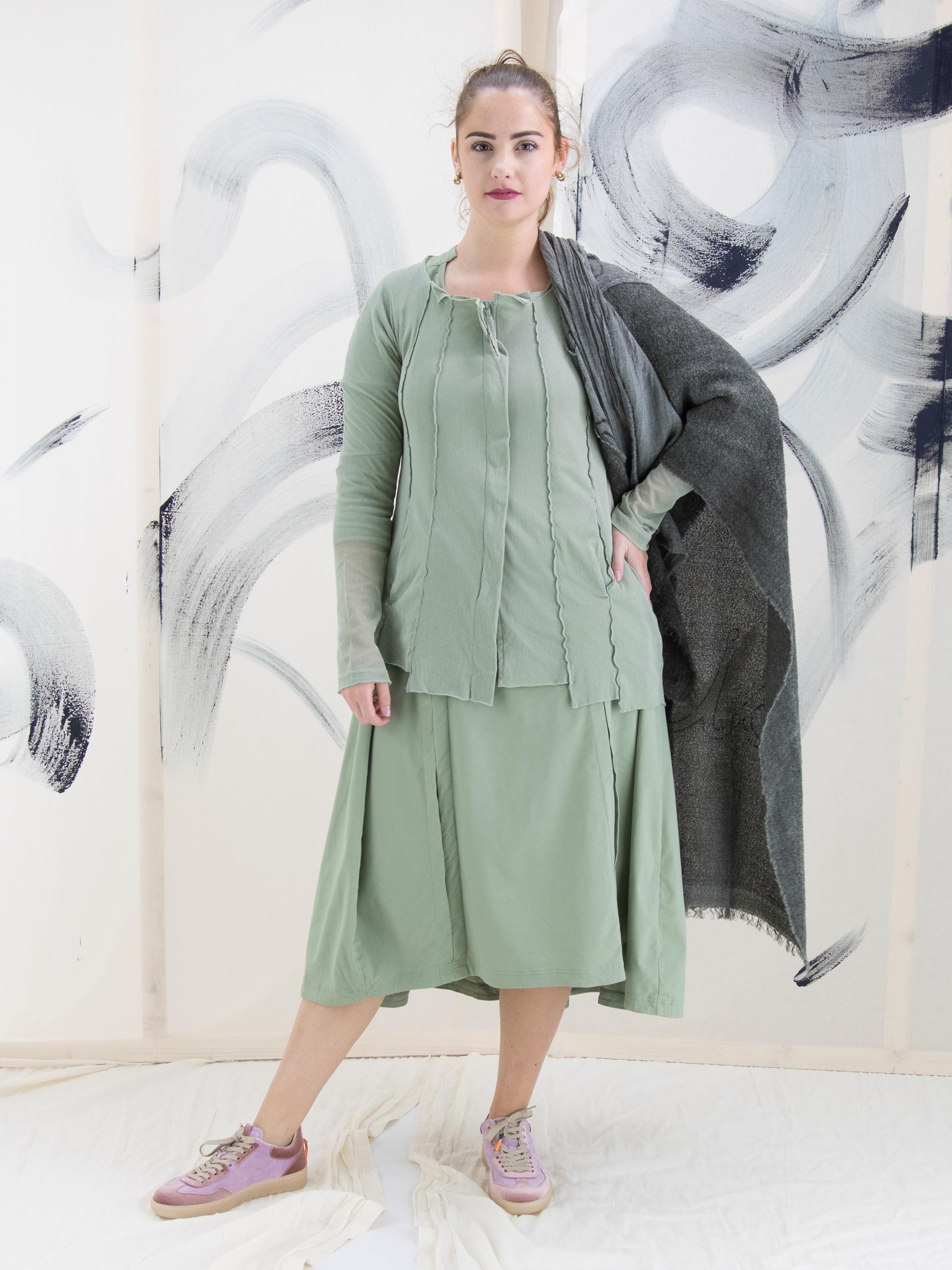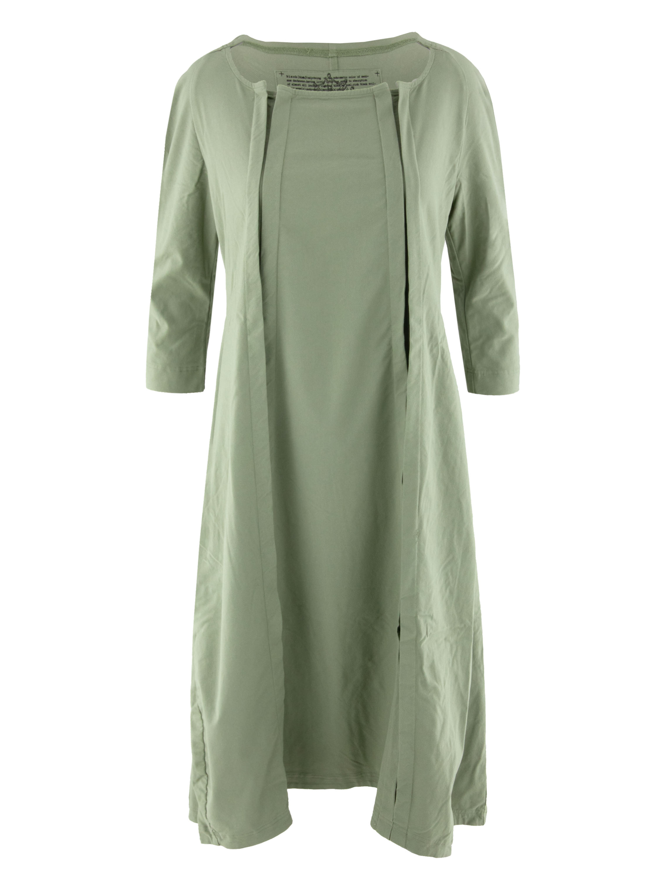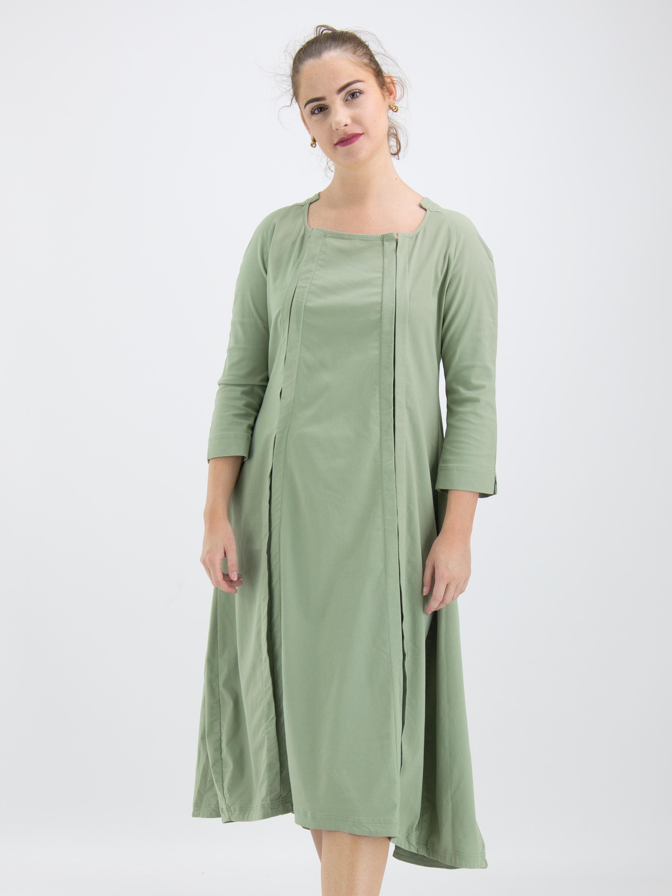 Een jurk van Rundholz Black Label in een zachte olijfkleur. Aan de voorzijde zijn twee verticale omgekeerde plooien die openstaan. De jurk heeft een lichte taillelijn en vanuit de taille een ballonvorm. De brede hals heeft vanaf de zijkanten naar de achterzijde een kleine verhoging. Aan het uiteinde van de halflange mouwen is een kort splitje. Deze jurk mag op 30 graden worden gewassen.