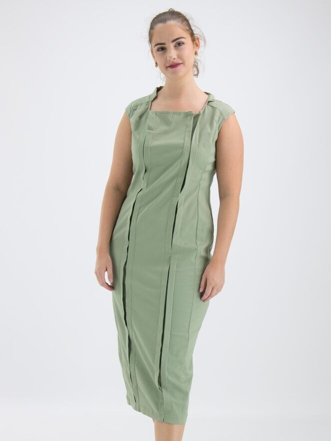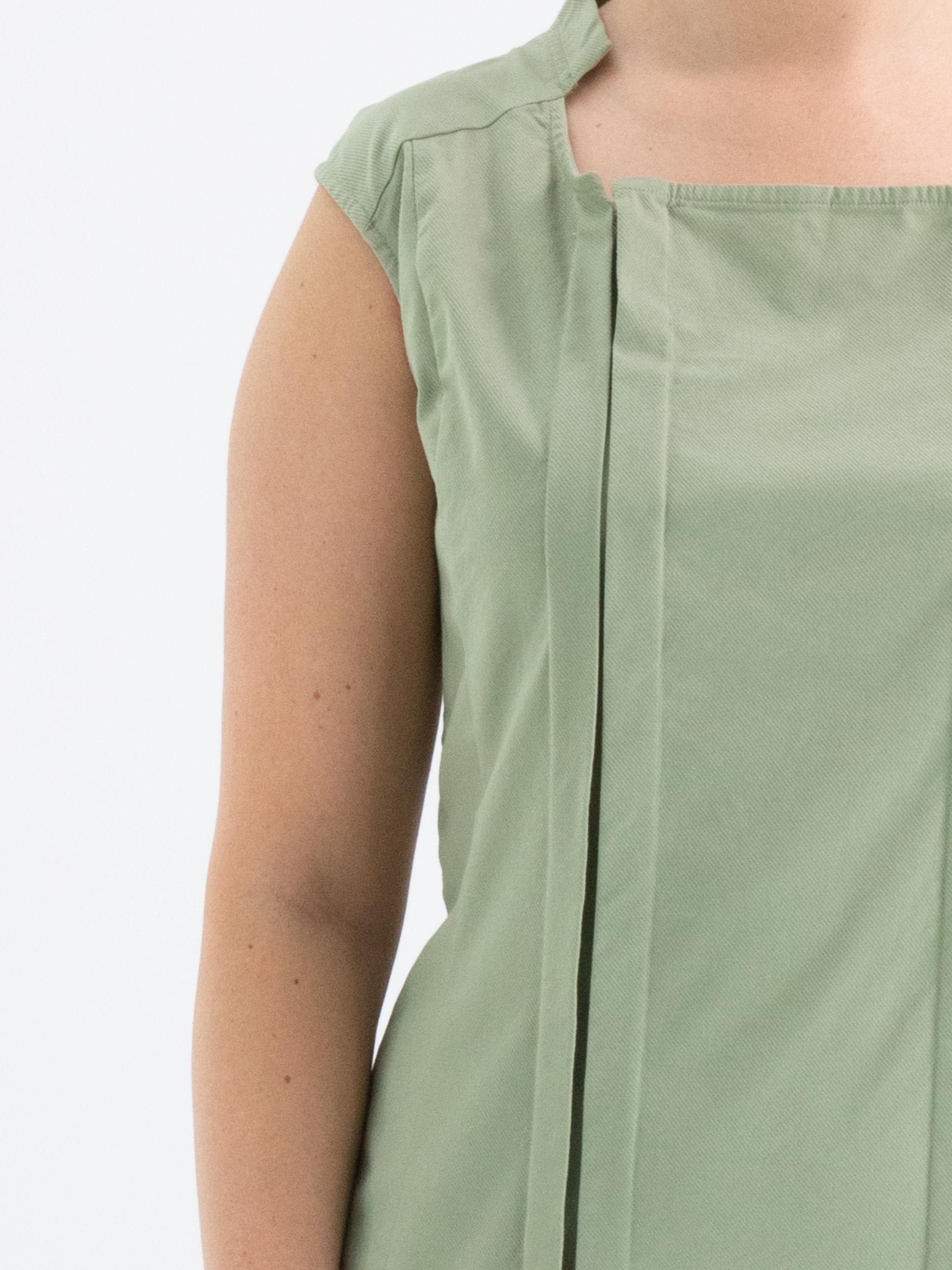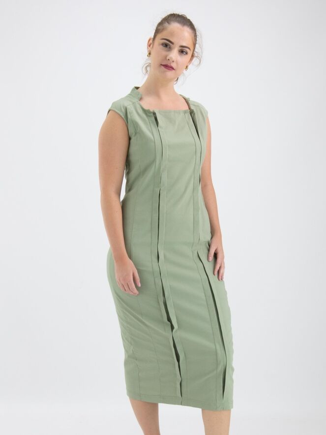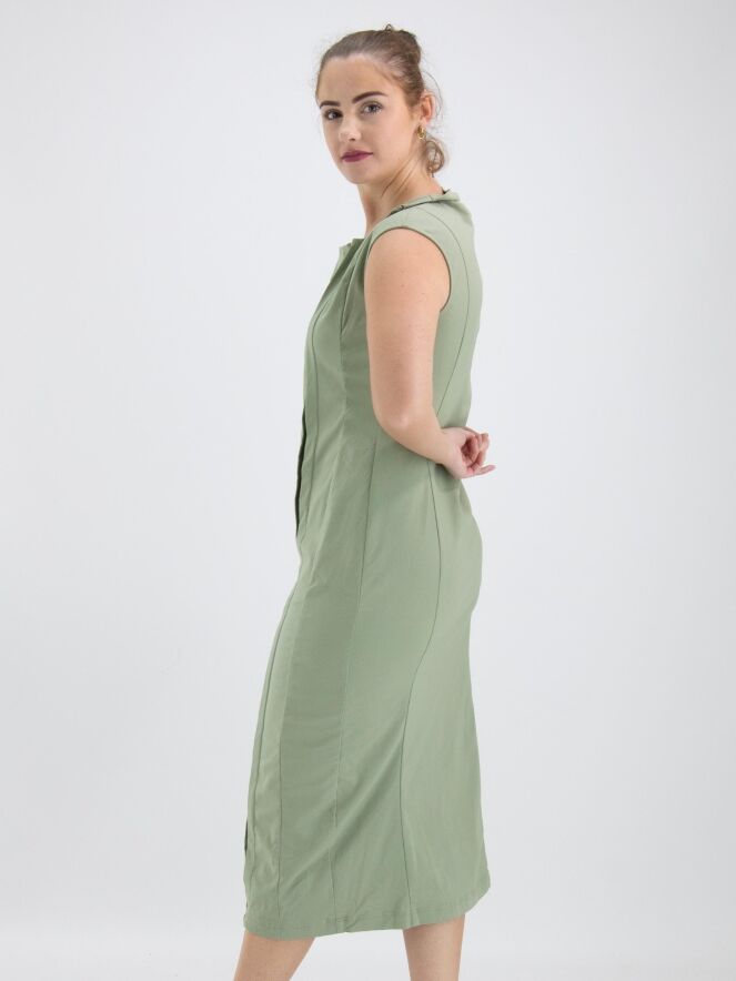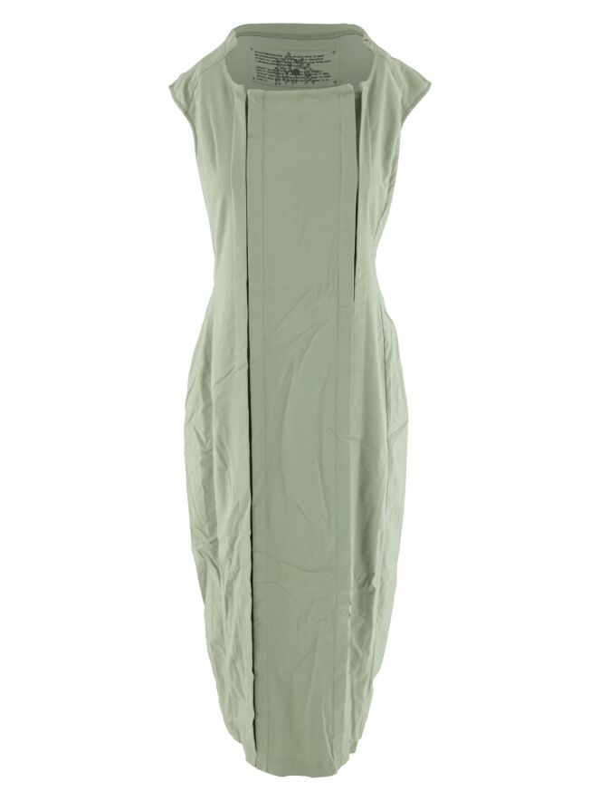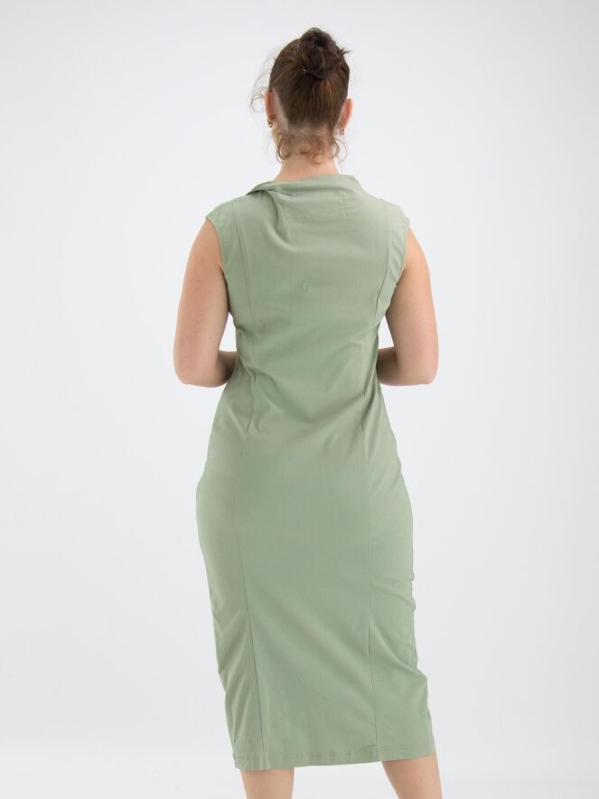 Een jurk van Rundholz Black Label in een zachte olijfkleur. Aan de voorzijde zijn twee verticale omgekeerde plooien die openstaan. De jurk heeft een lichte taillelijn. De brede hals heeft vanaf de zijkanten naar de achterzijde een kleine verhoging. Deze jurk mag op 30 graden worden gewassen.