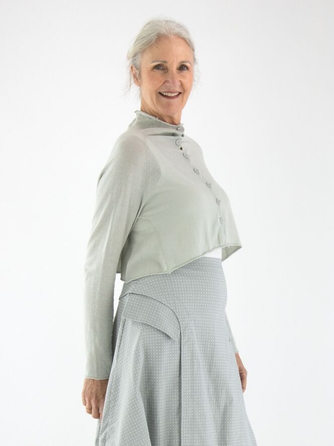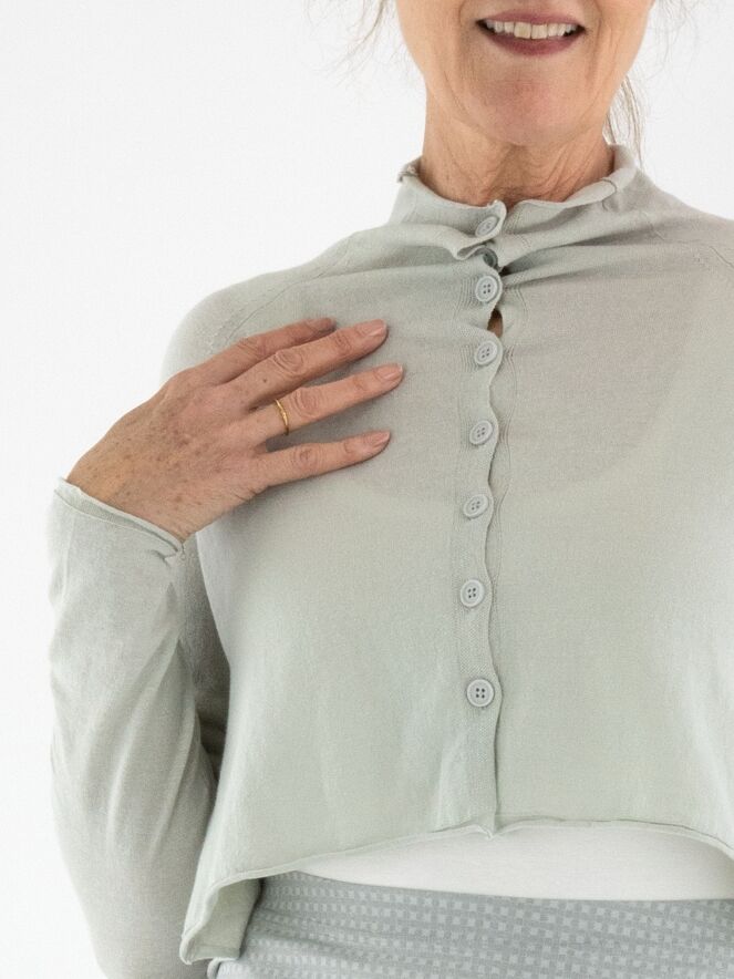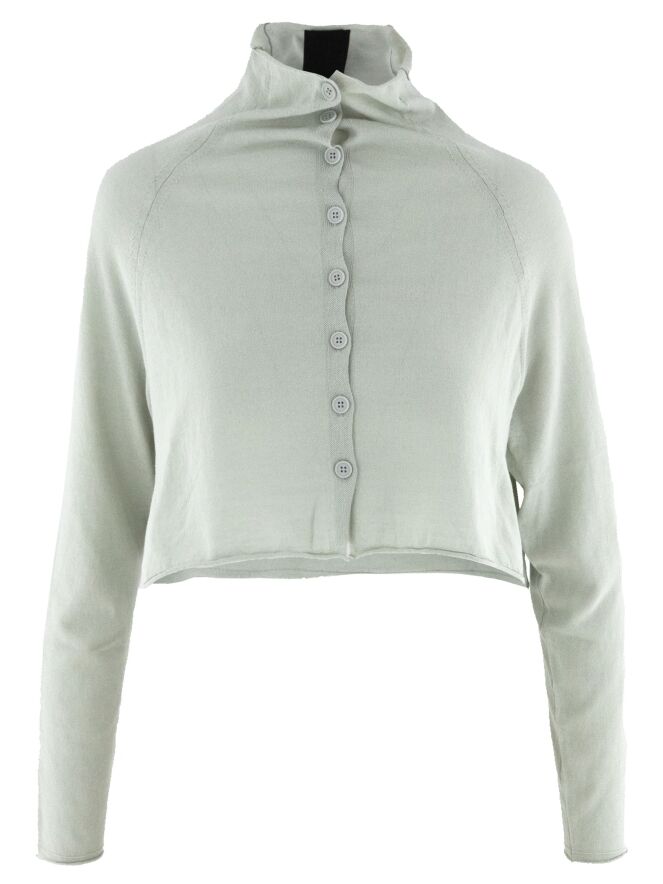 Een kort vest van Rundholz Black Label in een lichtgrijze kleur. Het vest heeft een turtle-hals. Op de achterkant is een ingeweven print van een vis in de golven in de kleur wit. Dit vest mag op de hand worden gewassen.