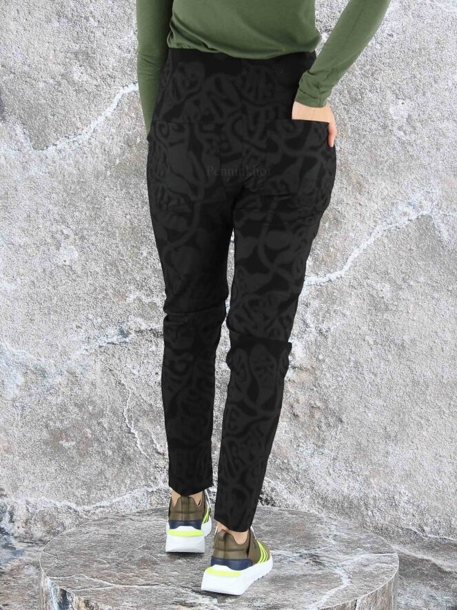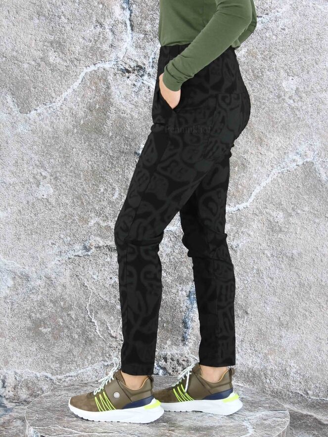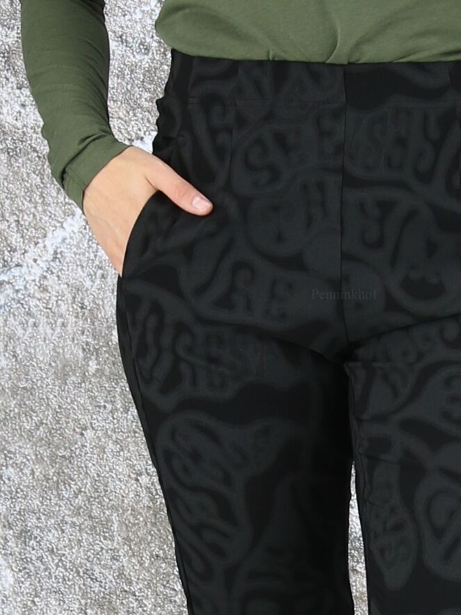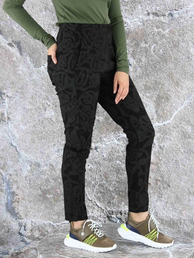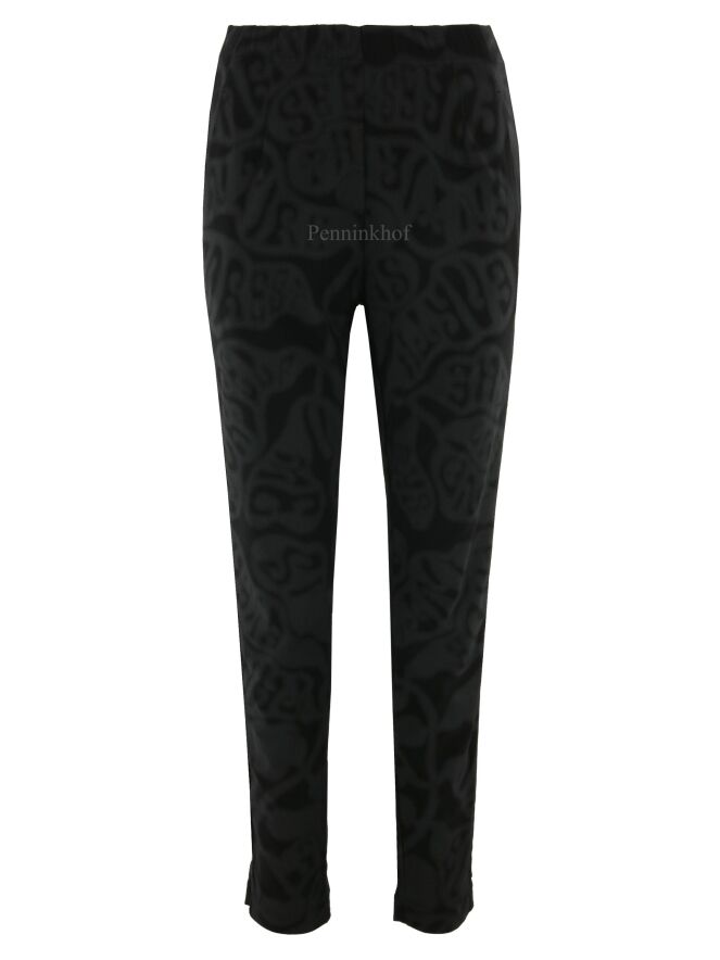 Een broek van Rundholz black label in een barokprint met de kleuren grijs en zwart. In de taille is een elastieken band. Deze broek heeft steekzakken en mag op 30 graden worden gewassen.