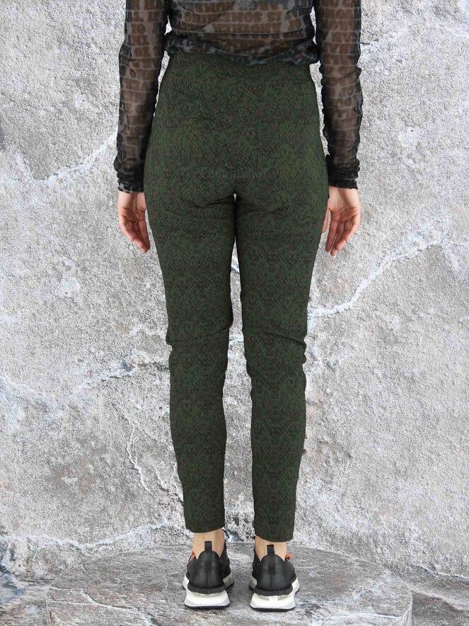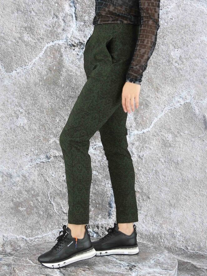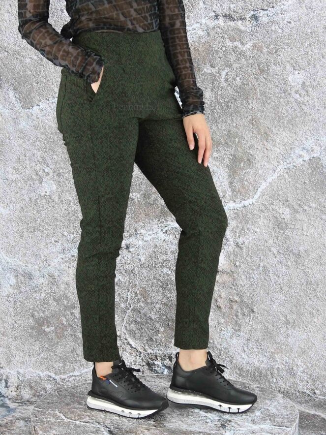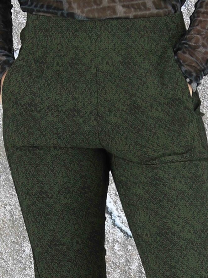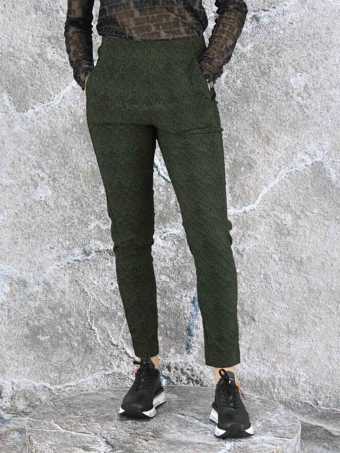 Een broek van Rundholz black label in een print met de kleuren groen en zwart. In de taille is een elastieken band. Deze broek heeft steekzakken en mag op 30 graden worden gewassen.