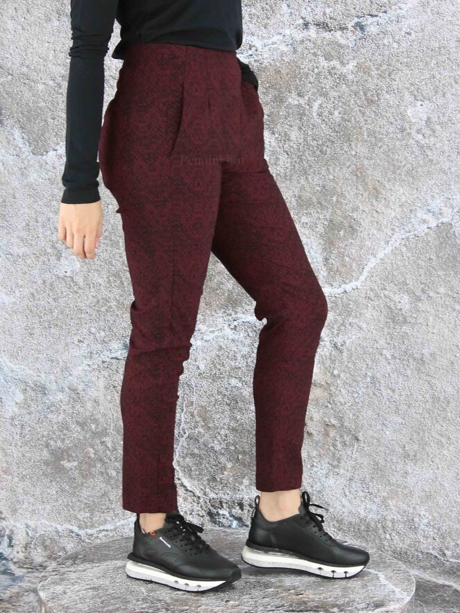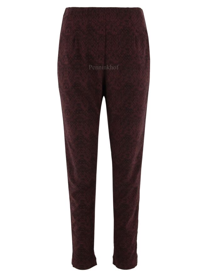 Een broek van Rundholz black label in een print met de kleuren bordeauxrood en zwart. In de taille is een elastieken band. Deze broek heeft steekzakken en mag op 30 graden worden gewassen.
