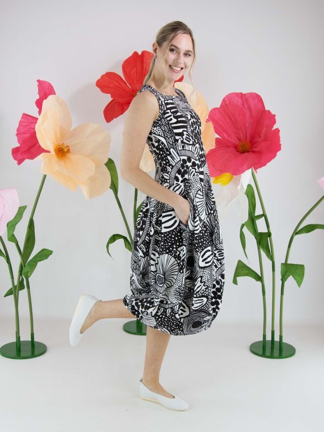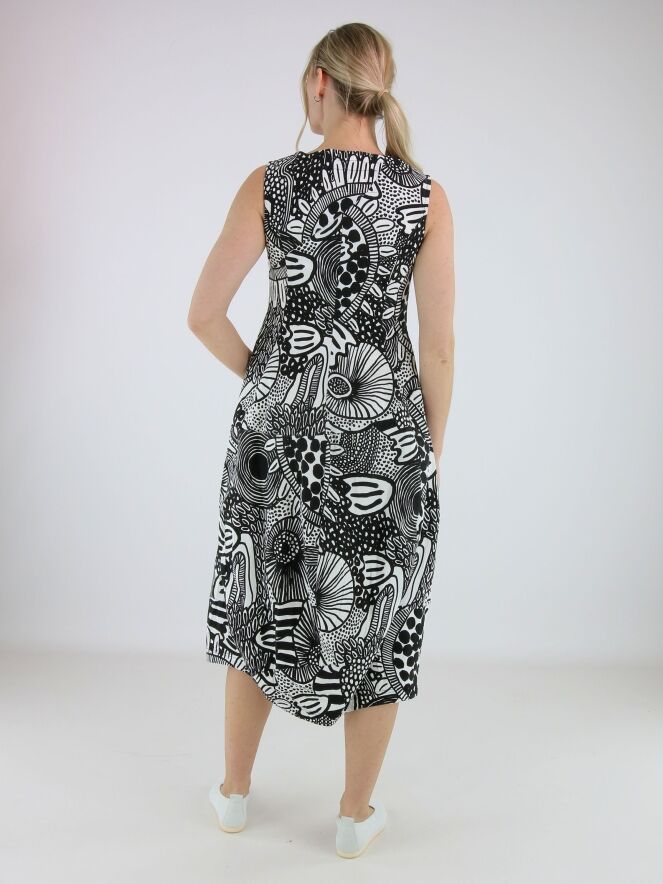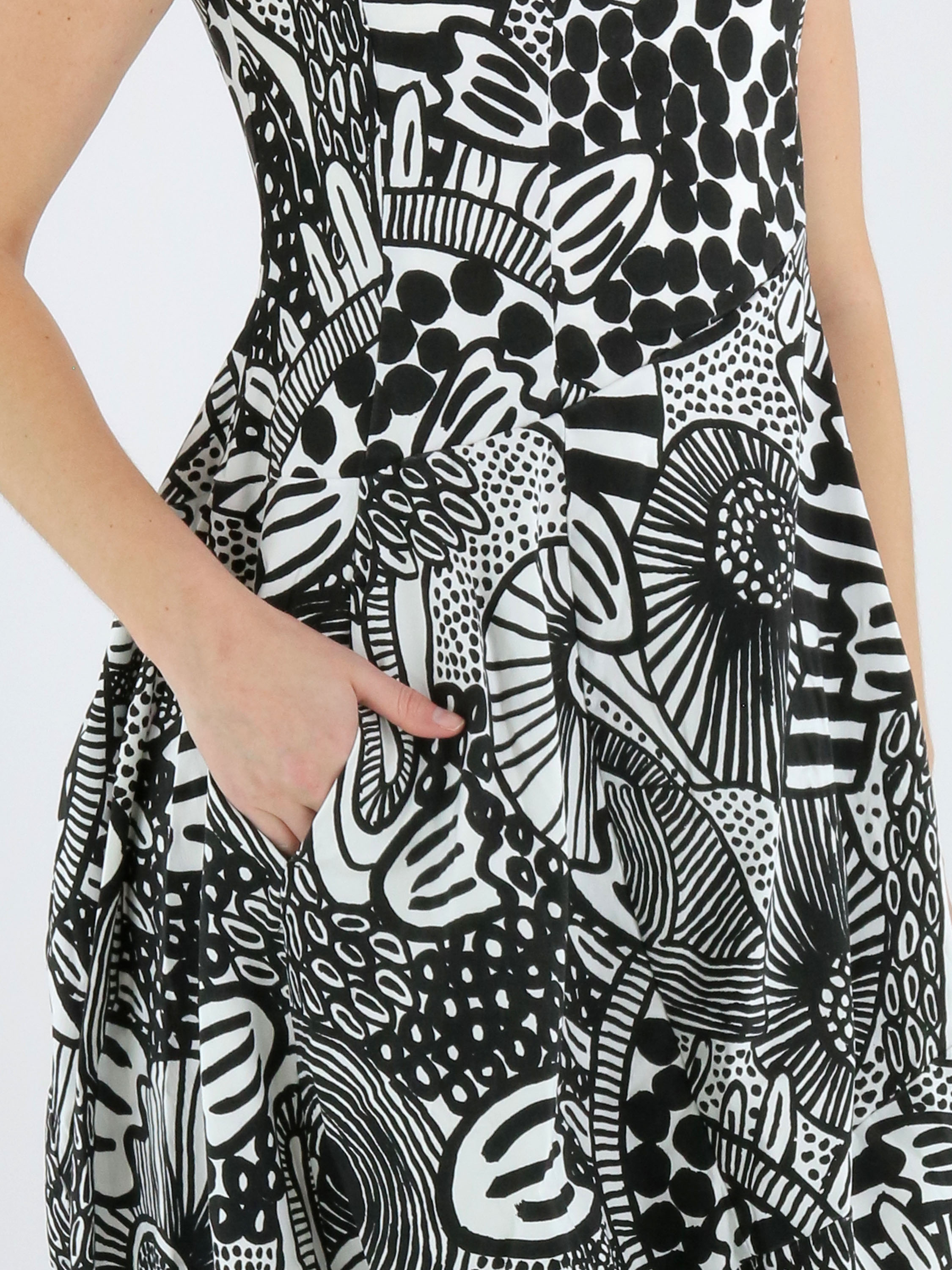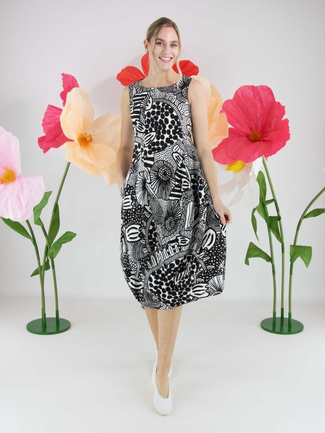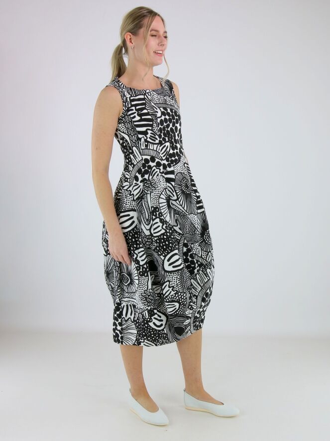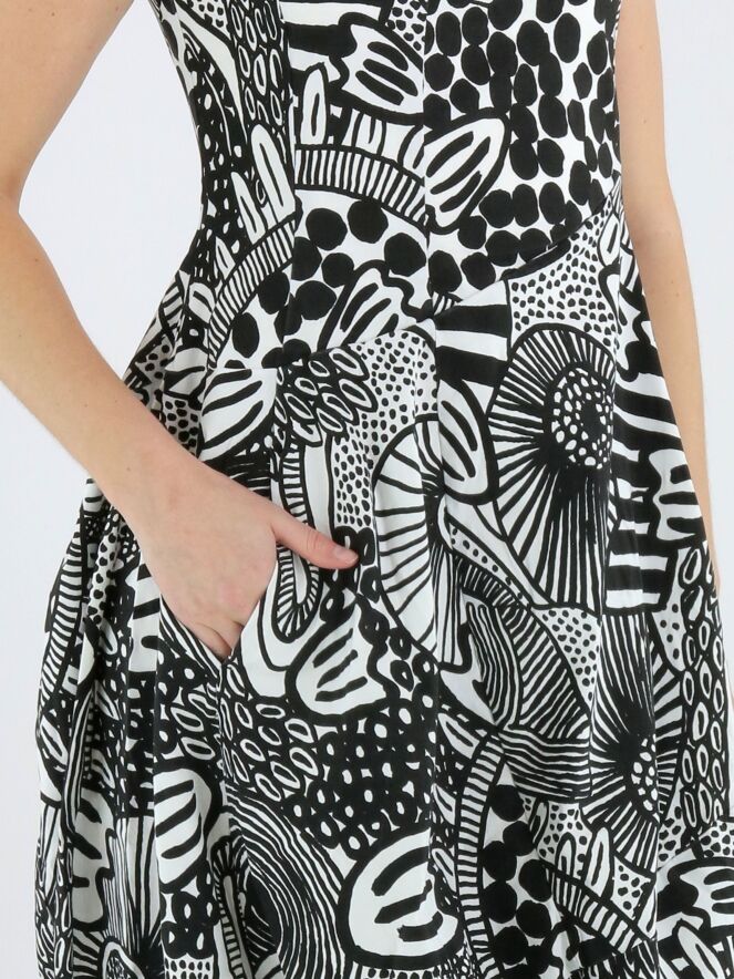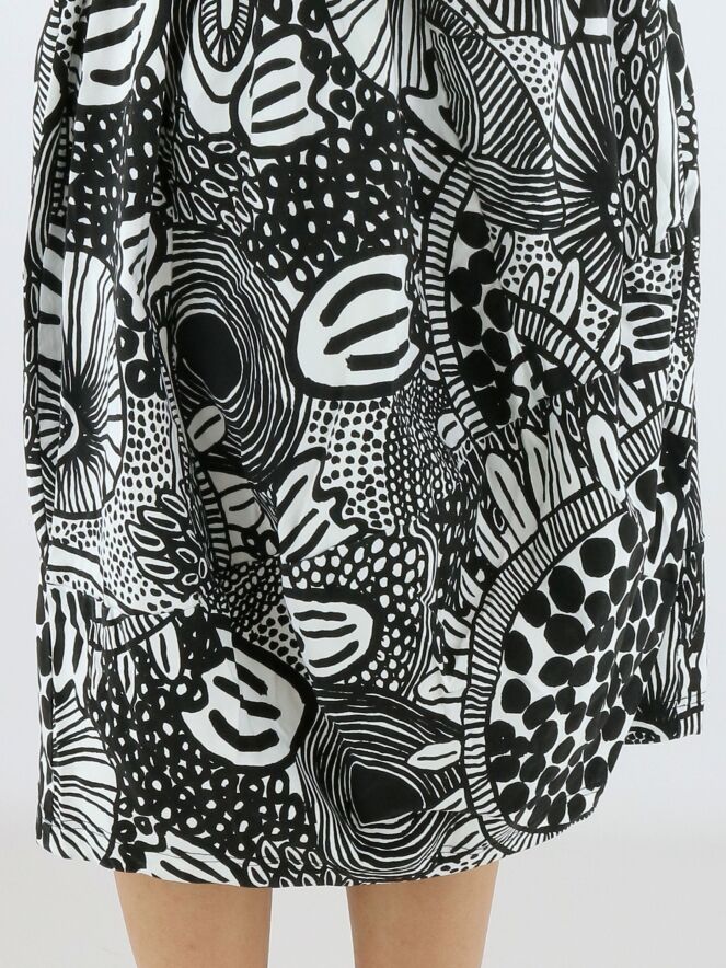 Jurk van Rundholz Black Label in een grafisch dessin in zwart en wit. De jurk heeft een ronde hals en ontwikkelt vanaf de taille een subtiele ballonvorm, wat zorgt voor een eigentijds en speels silhouet. Ter hoogte van de taille zijn steekzakken verwerkt. Deze jurk kan op 30 graden worden gewassen.