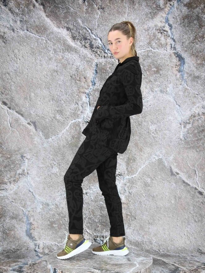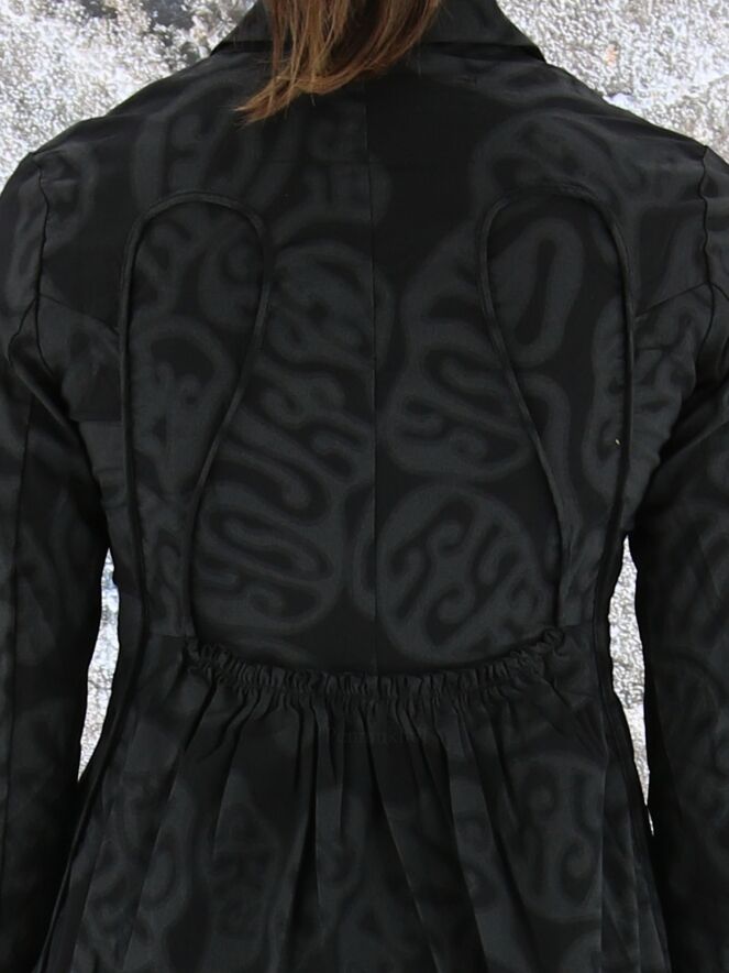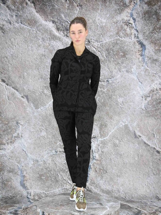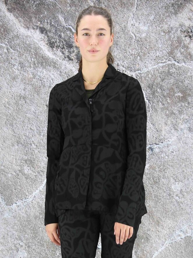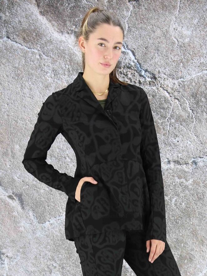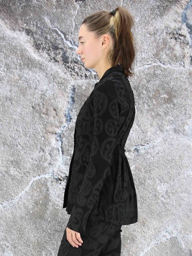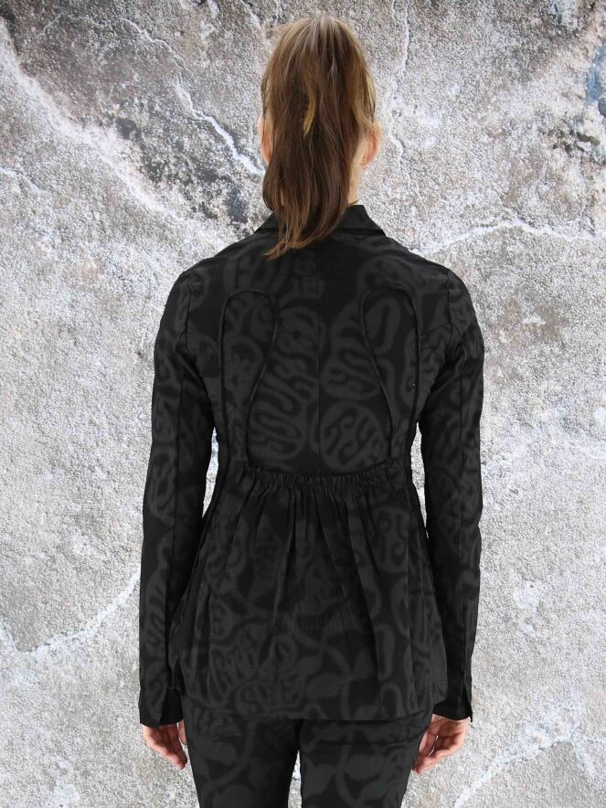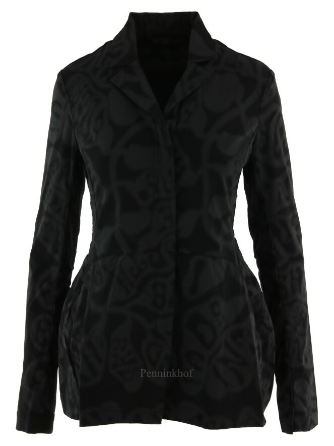 Een blazer van Rundholz black label in een barokprint met de kleuren grijs en zwart. In de taille is aan de achterkant een fijn geplooide elastieken band. De blazer heeft een verborgen ritssluiting. Deze blazer mag op 30 graden worden gewassen.