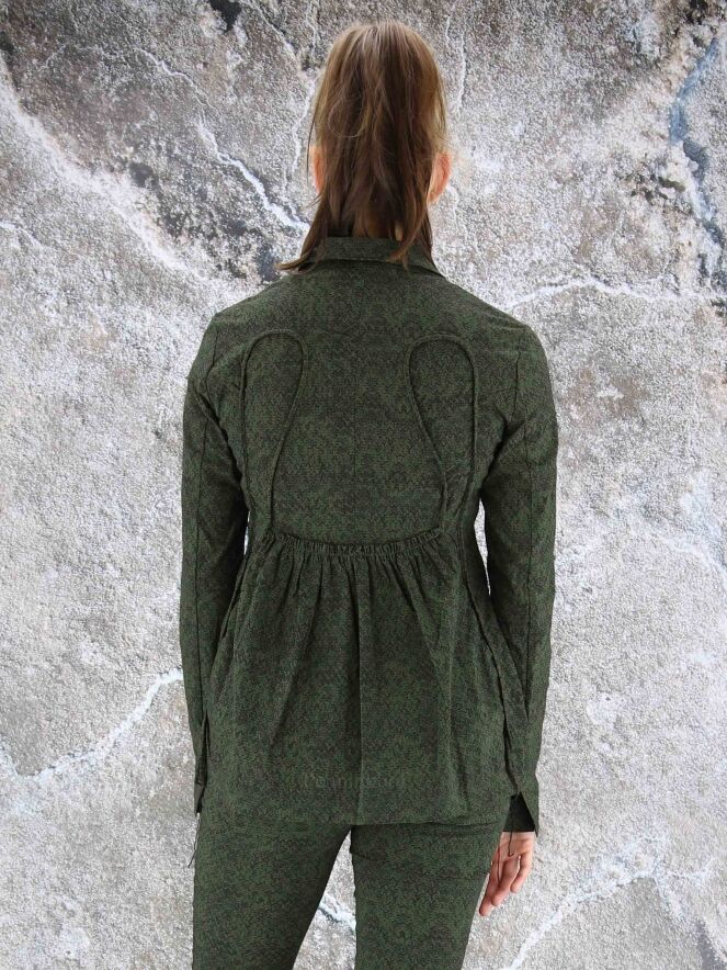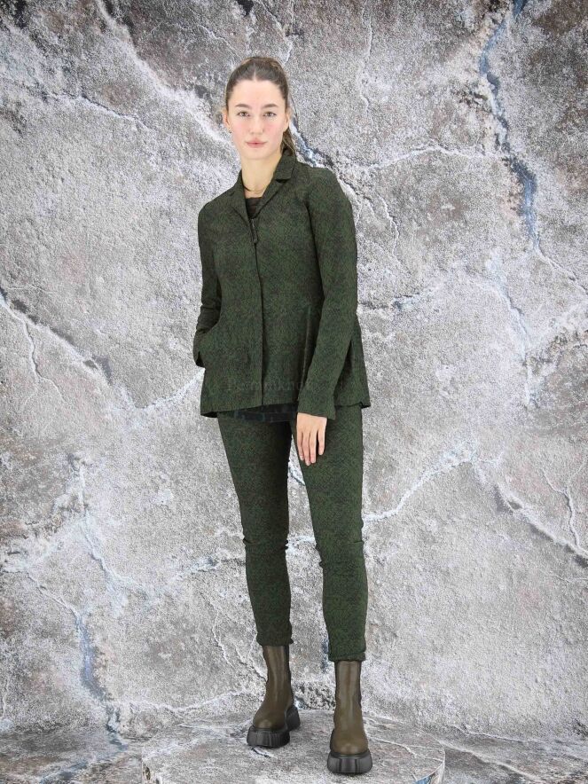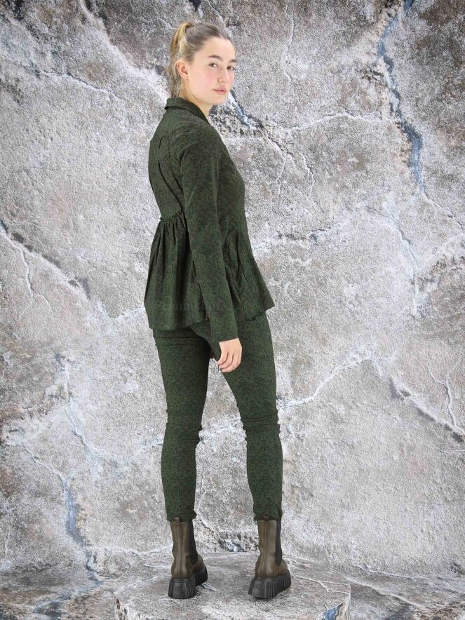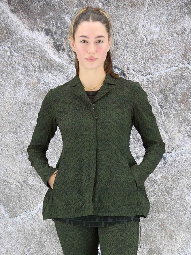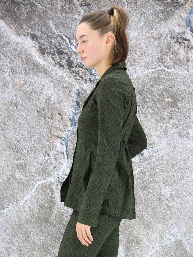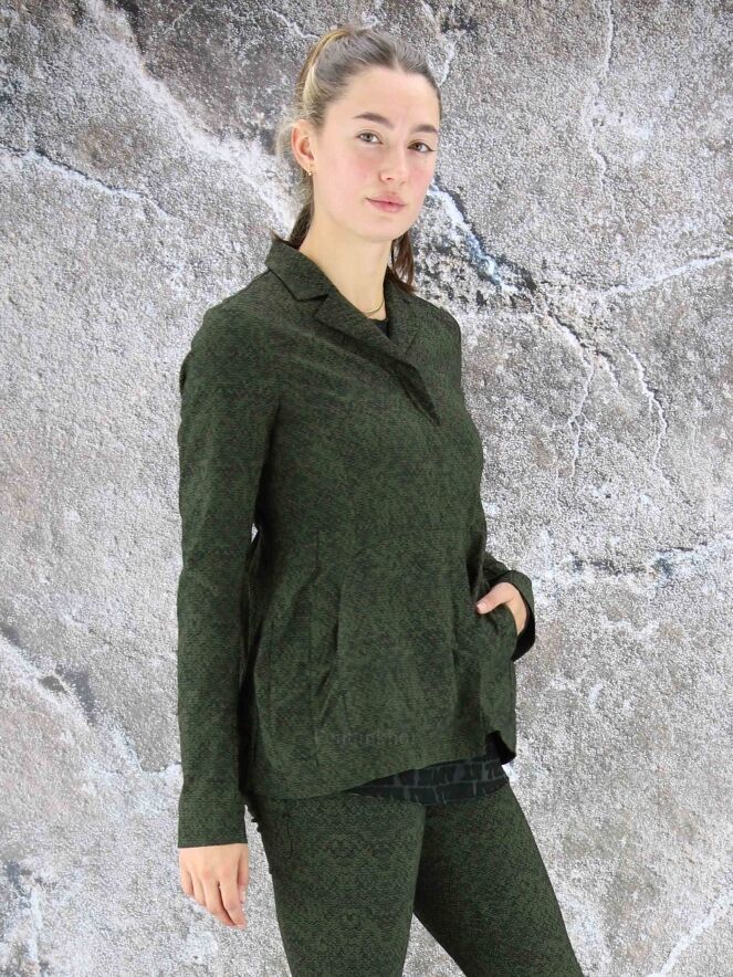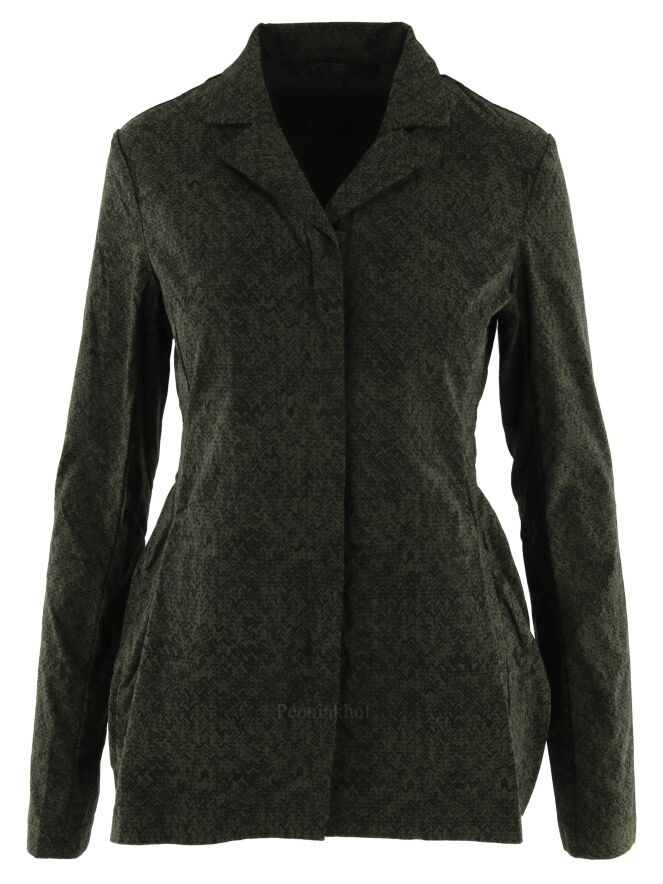 Een blazer van Rundholz black label in een print met de kleuren groen en zwart. In de taille is aan de achterkant een fijn geplooide elastieken band. De blazer heeft een verborgen ritssluiting. Deze blazer mag op 30 graden worden gewassen.