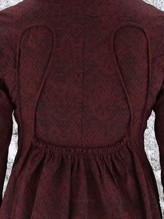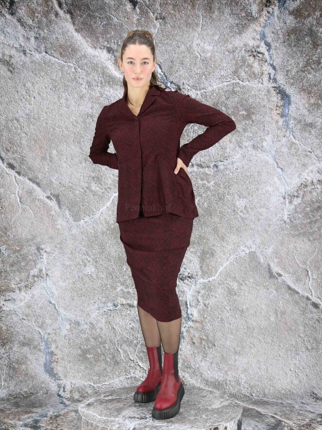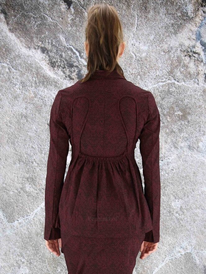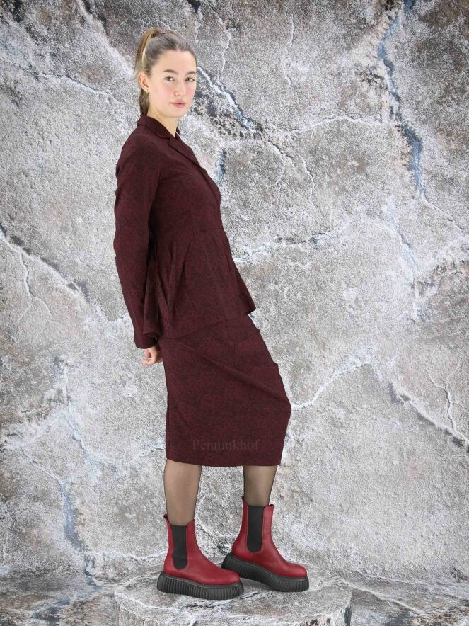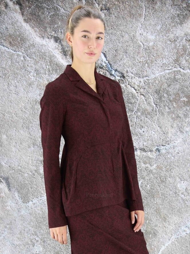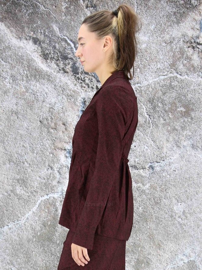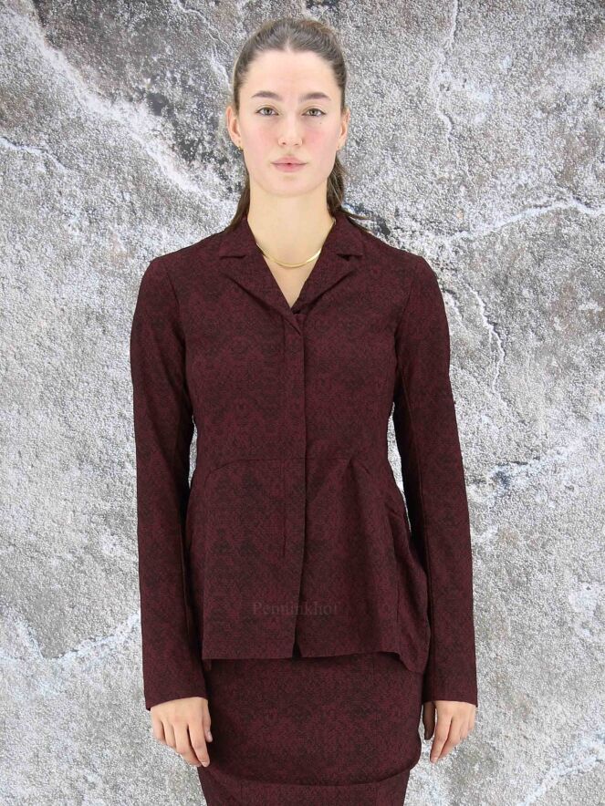Een blazer van Rundholz black label in een print met de kleuren bordeaux rood en zwart. In de taille is aan de achterkant een fijn geplooide elastieken band. De blazer heeft een verborgen ritssluiting. Deze blazer mag op 30 graden worden gewassen.