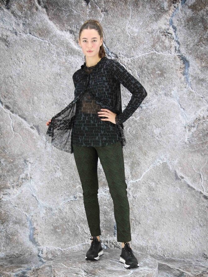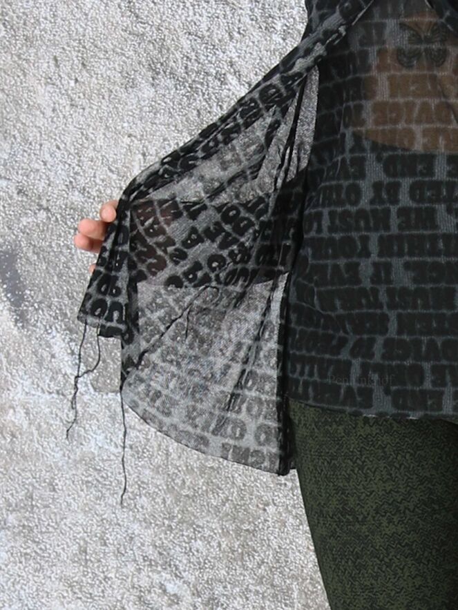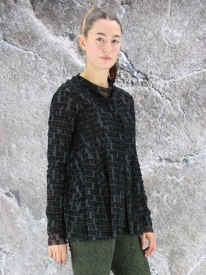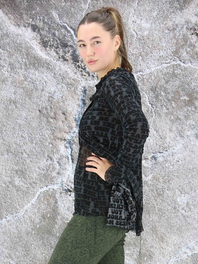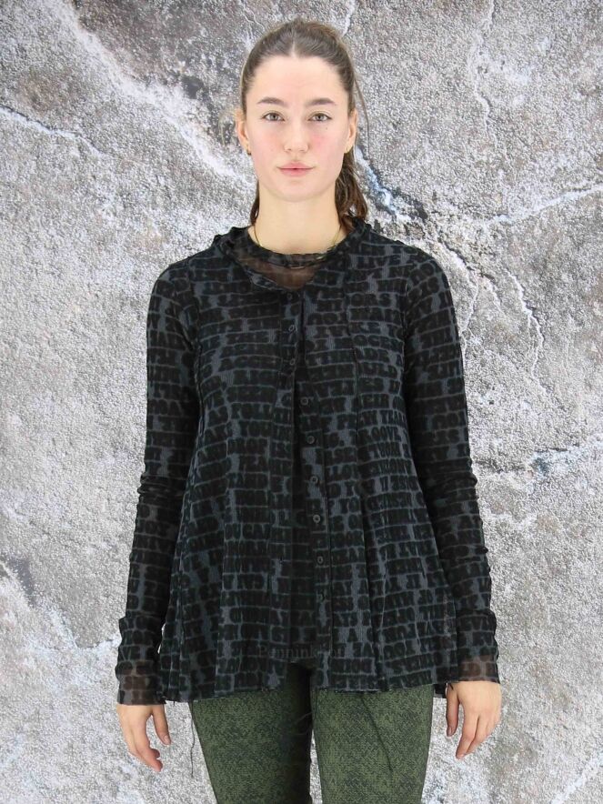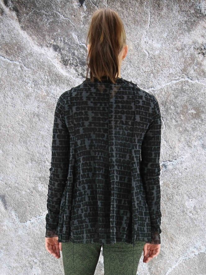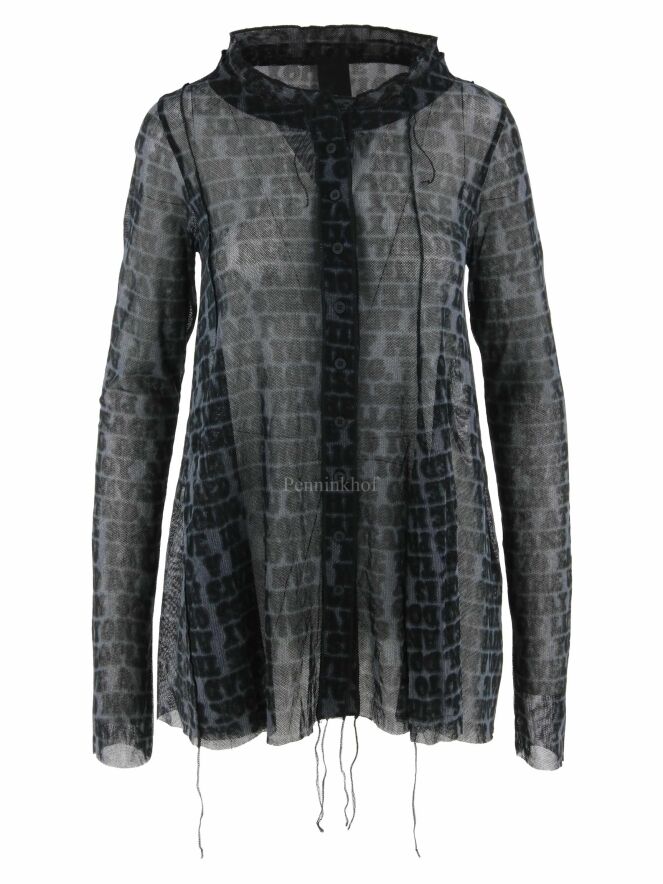 Een transparant vest van Rundholz black label in een letterprint met de kleuren petrolblauw, zwart en grijs. Het shirt heeft een ronde hals met een bies van een dubbele stof en lange mouwen. Het vest heeft een A - Lijn en mag op 30 graden worden gewassen.