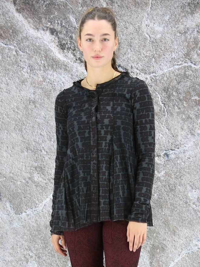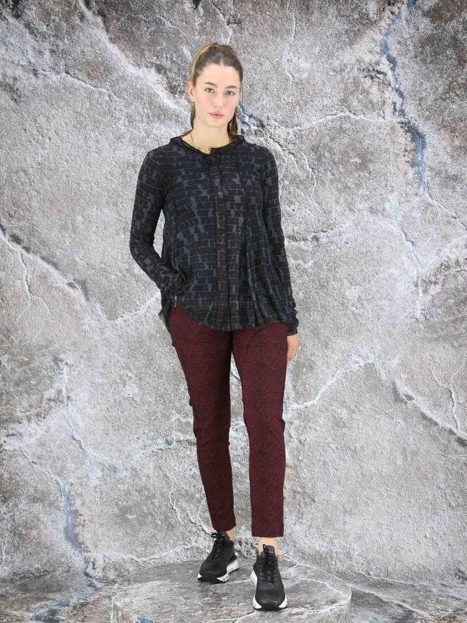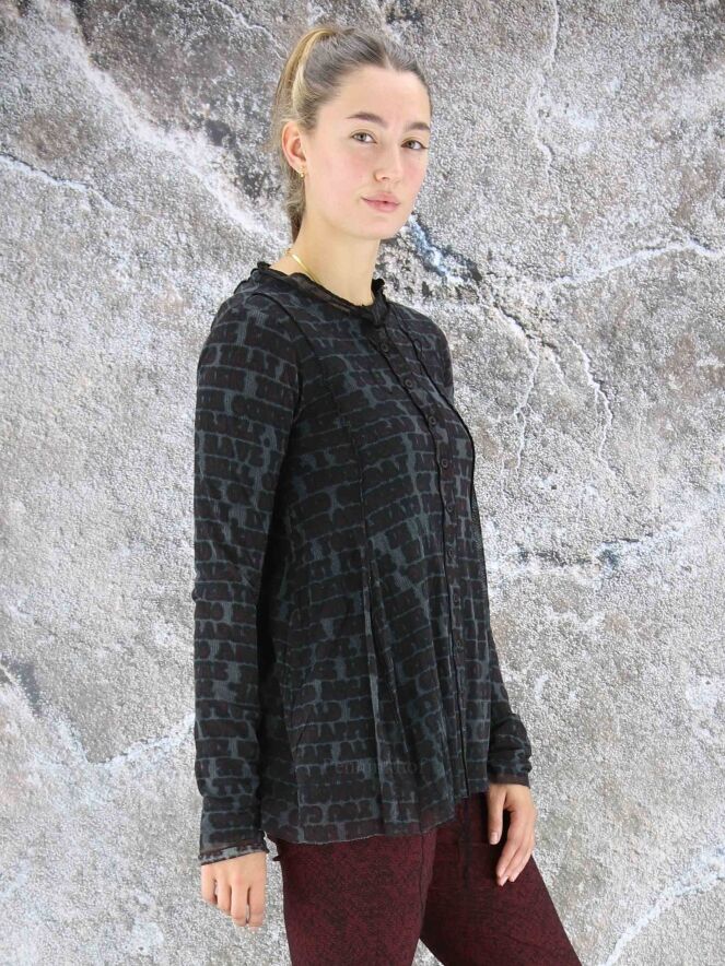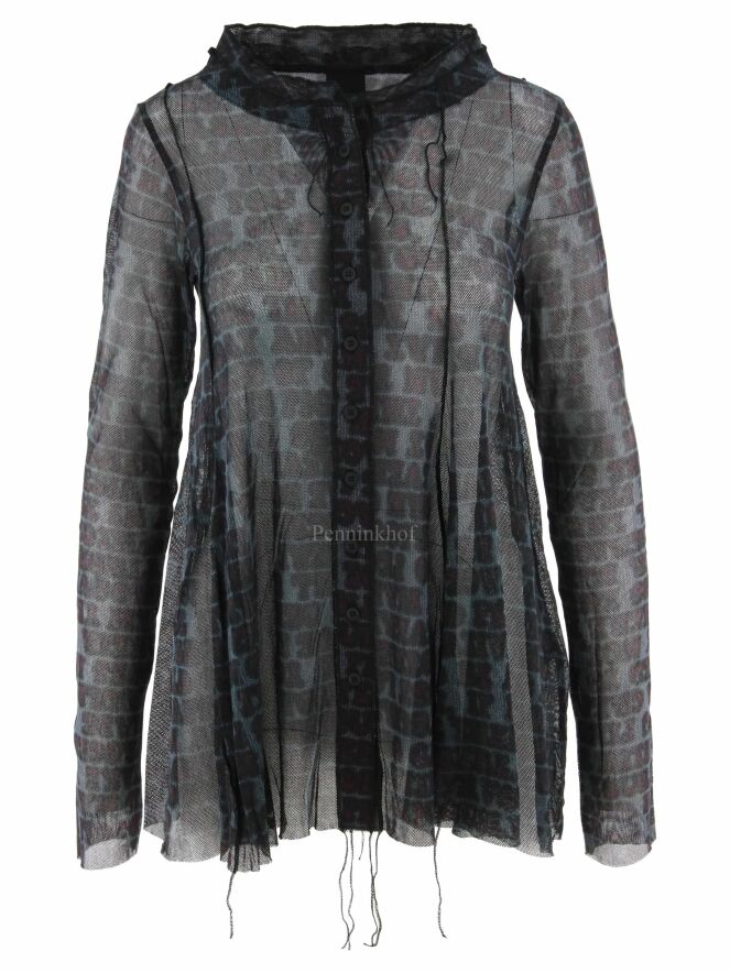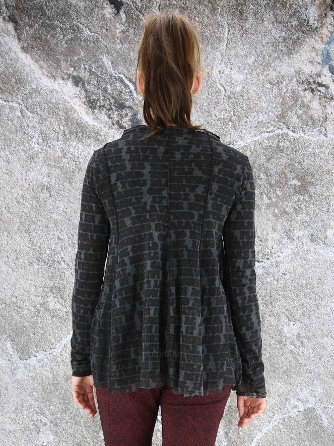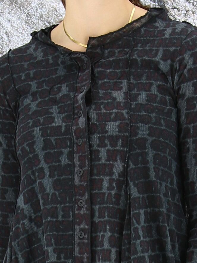 Een transparant vest van Rundholz black label in een letterprint met de kleuren bordeauxrood, zwart en grijs. Het shirt heeft een ronde hals met een bies van een dubbele stof en lange mouwen. Het vest heeft een A - Lijn en mag op 30 graden worden gewassen.