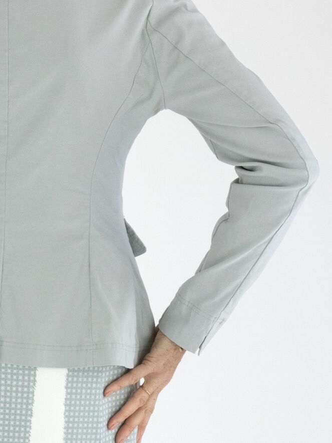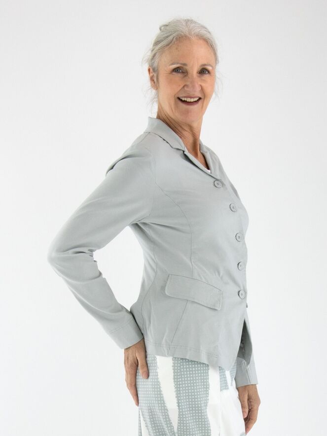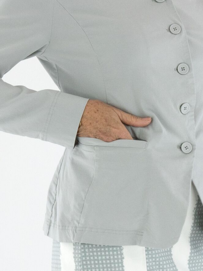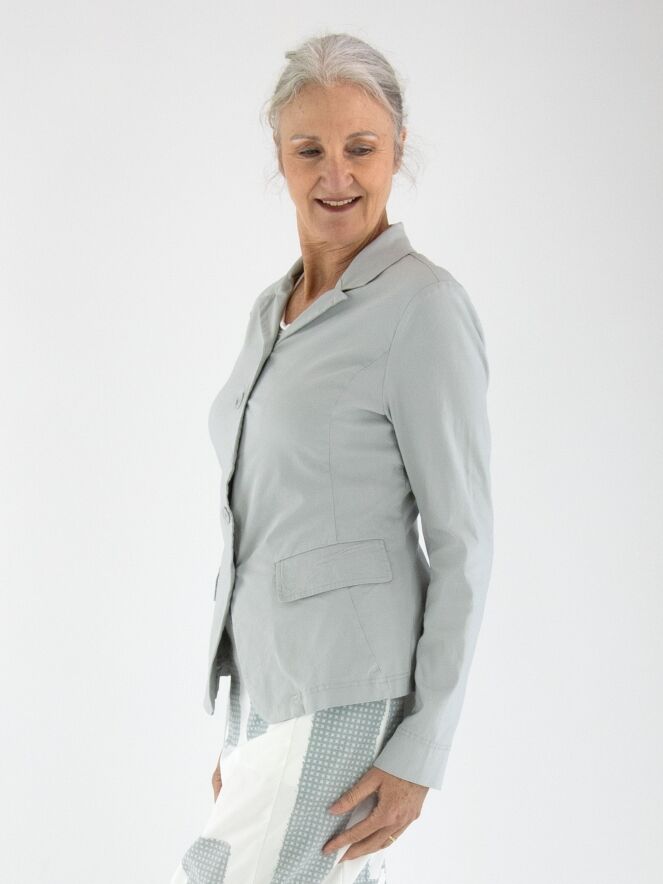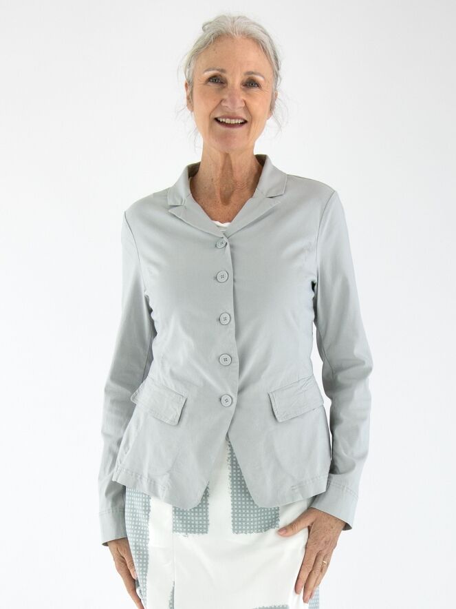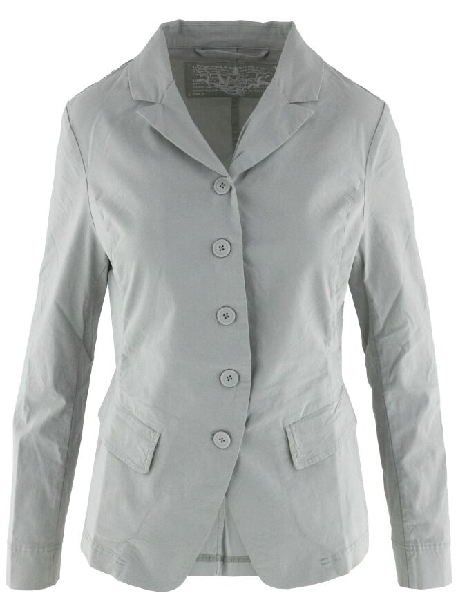 Een blazer van Rundholz Black Label in een lichtgrijze kleur. De blazer heeft een sluiting met vijf knopen en is ongevoerd. De onderrand is rond gesneden. Deze blazer kan op 30 graden gewassen worden.