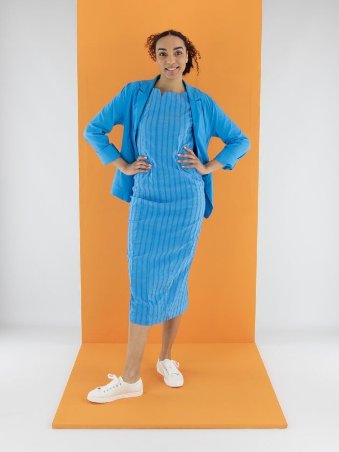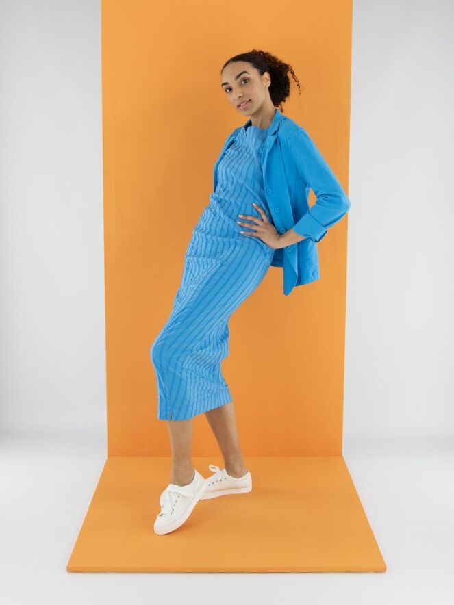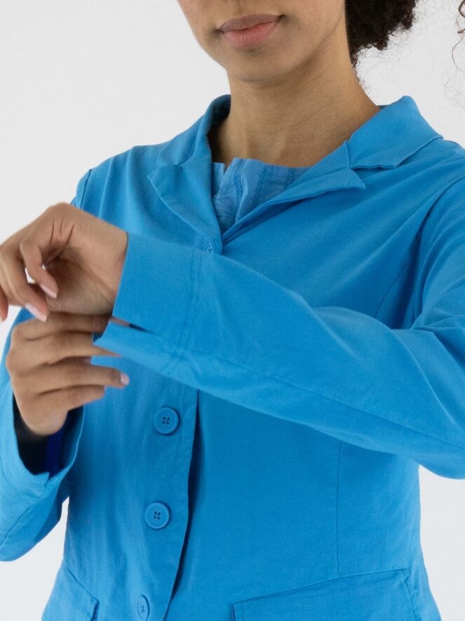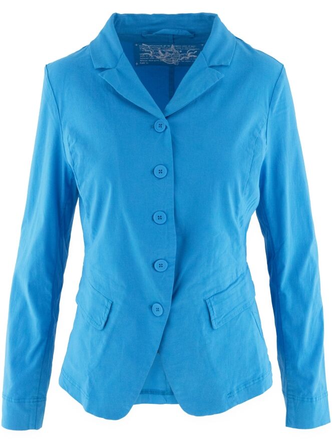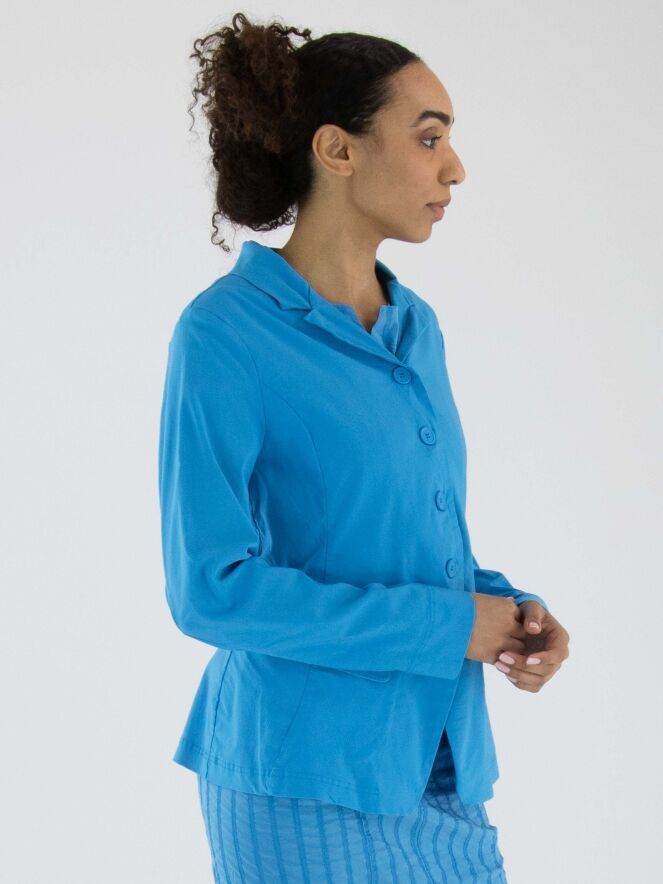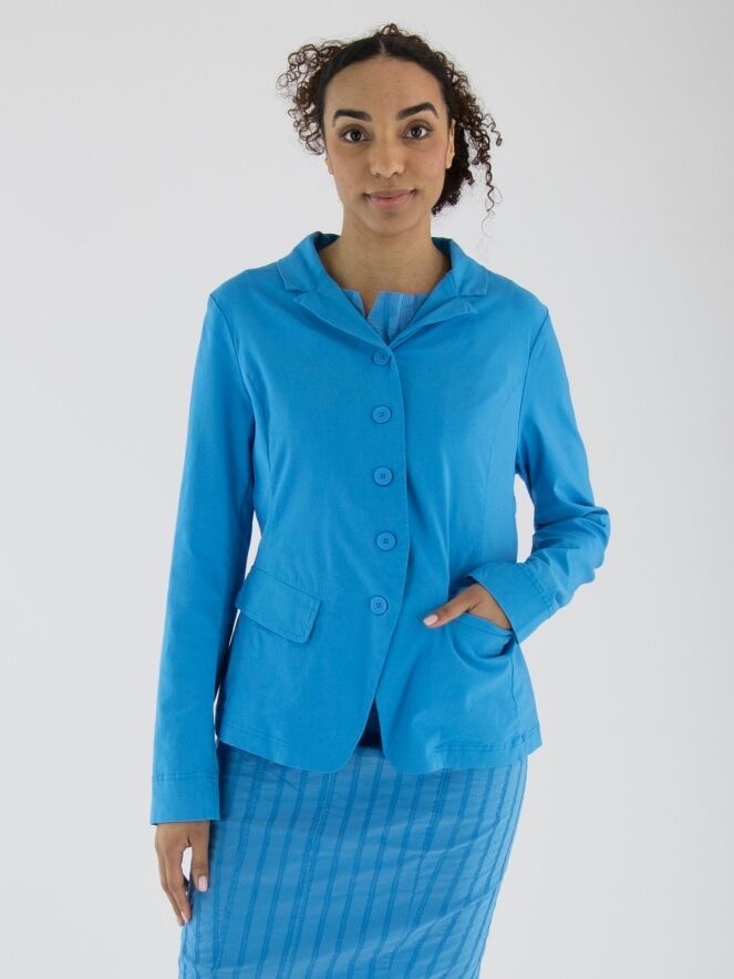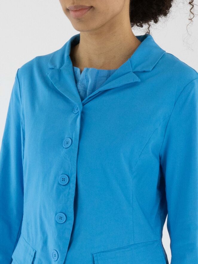 Een blazer van Rundholz Black Label in een heldere blauwe kleur. De blazer heeft een sluiting met vijf knopen en is ongevoerd. De onderrand is rond gesneden. Deze blazer mag op 30 graden worden gewassen.