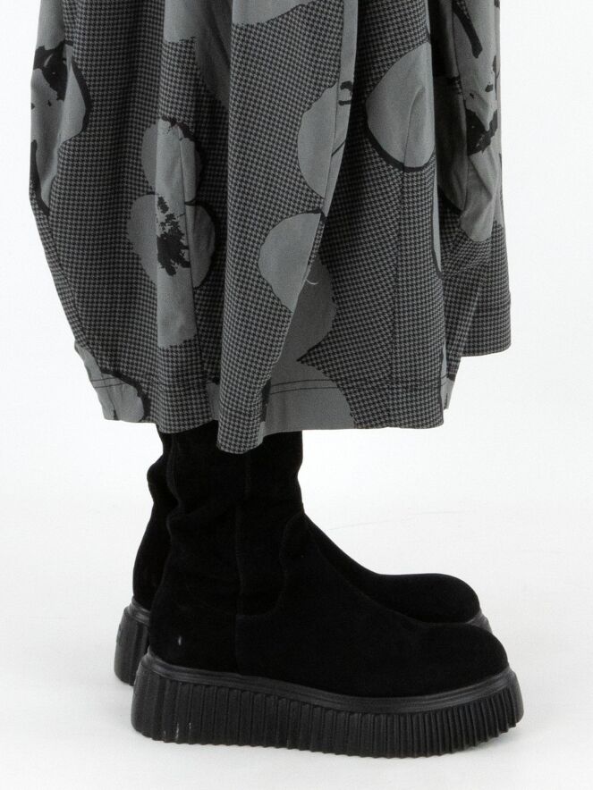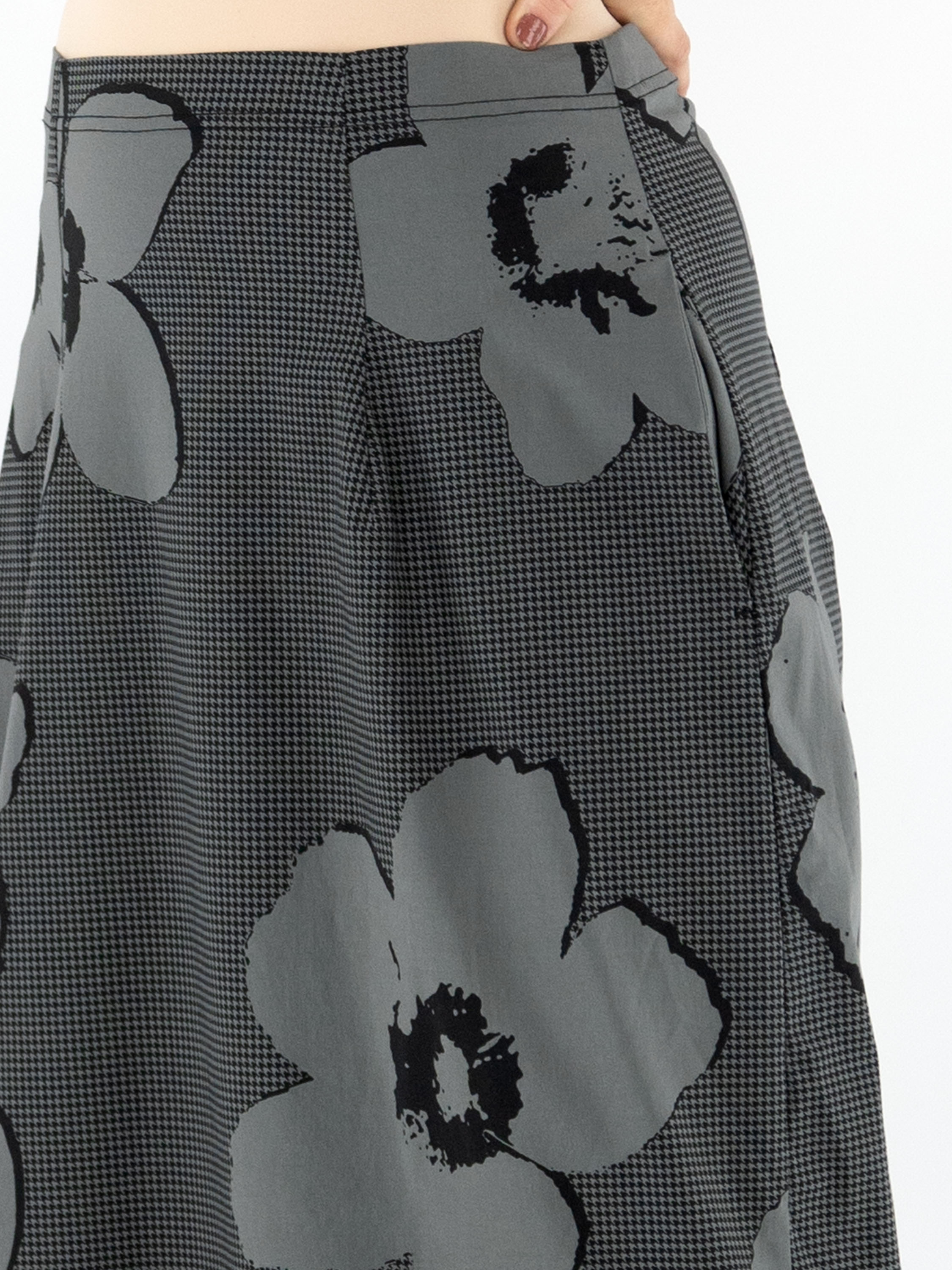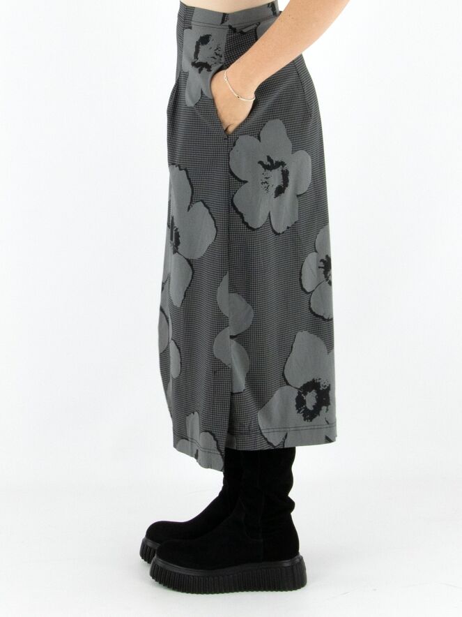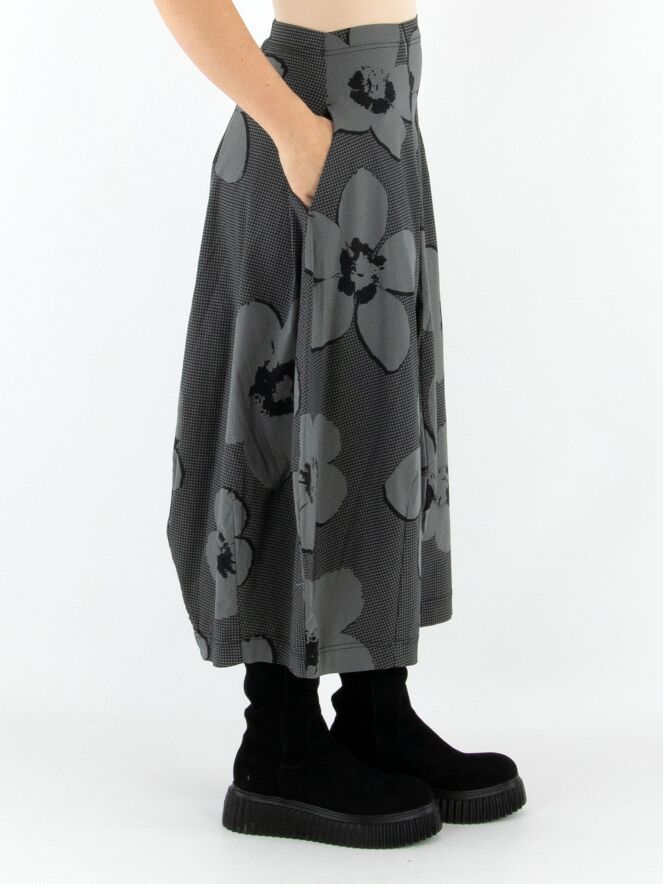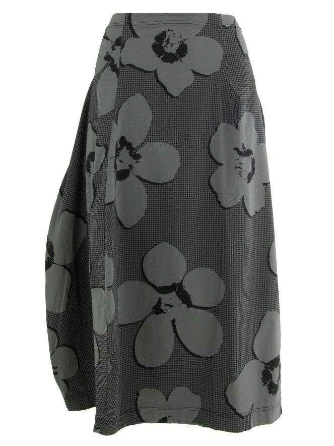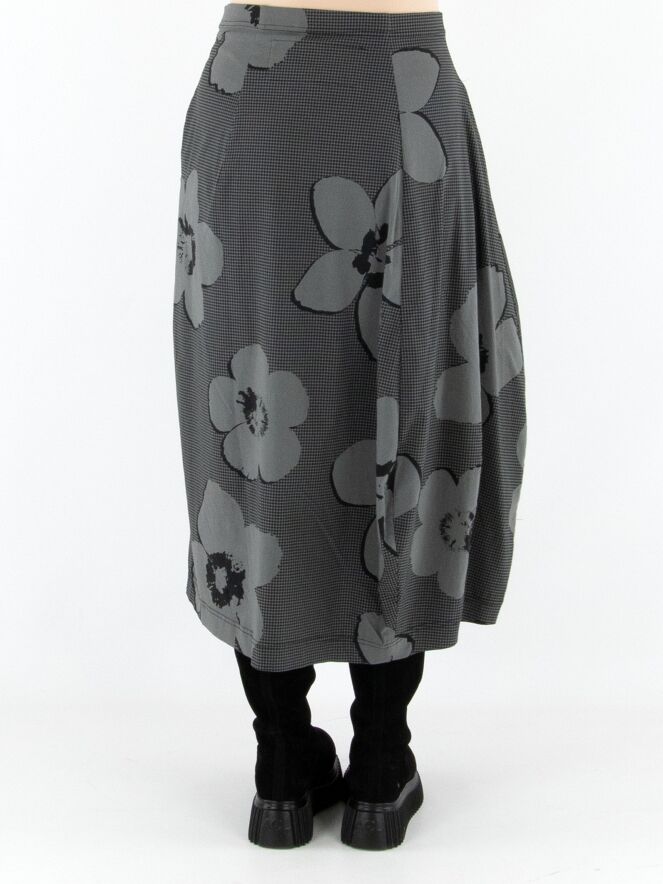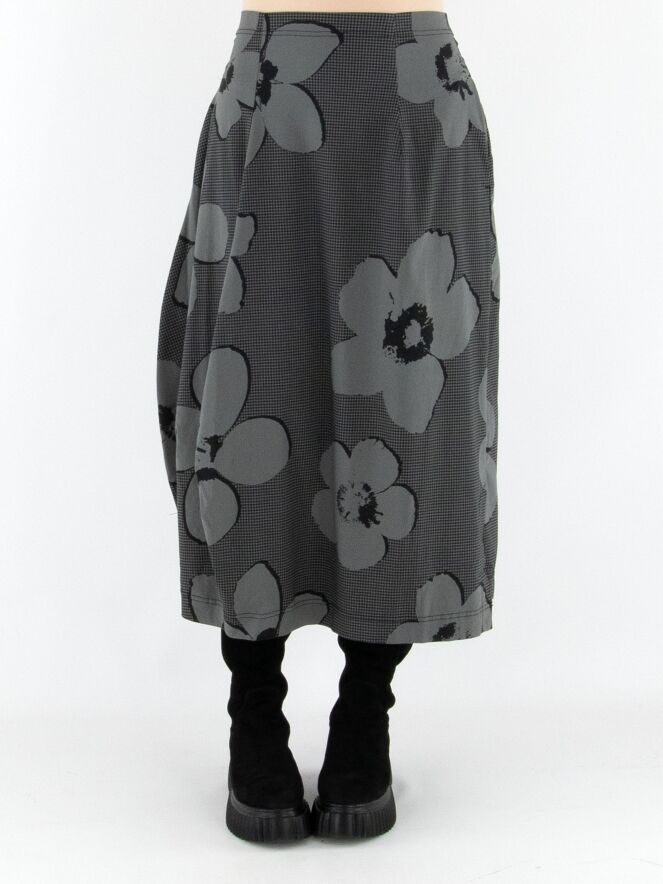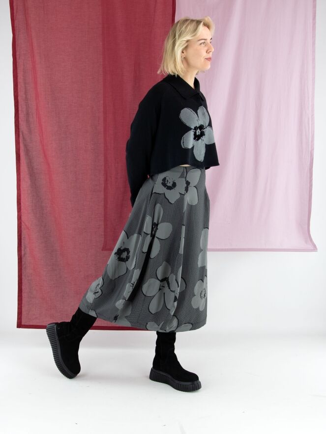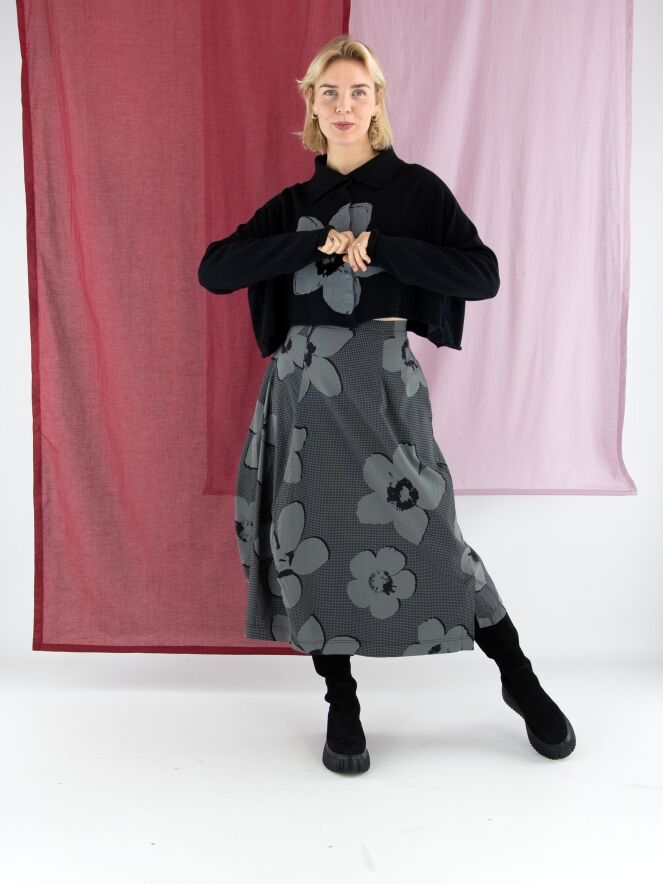 Een rok van Rundholz Black Label in een pied-de-coq print, overlapt met grote bloemen in grijs- en zwarttinten. De tailleband is elastisch en direct eronder zijn praktische steekzakken verwerkt. De rok heeft een speelse ballonvorm die zorgt voor een avant-gardistische uitstraling. Deze rok kan op 30 graden worden gewassen.