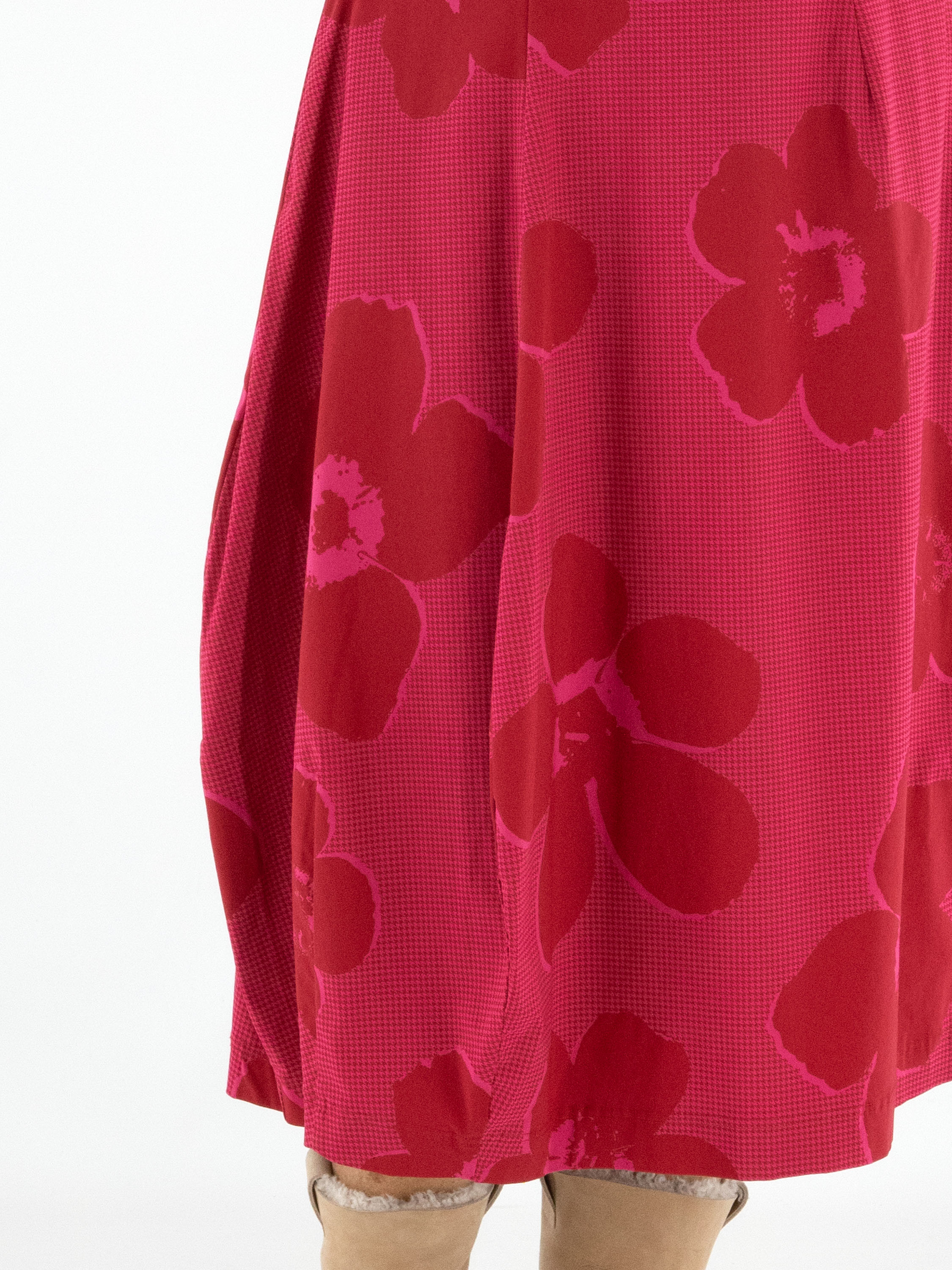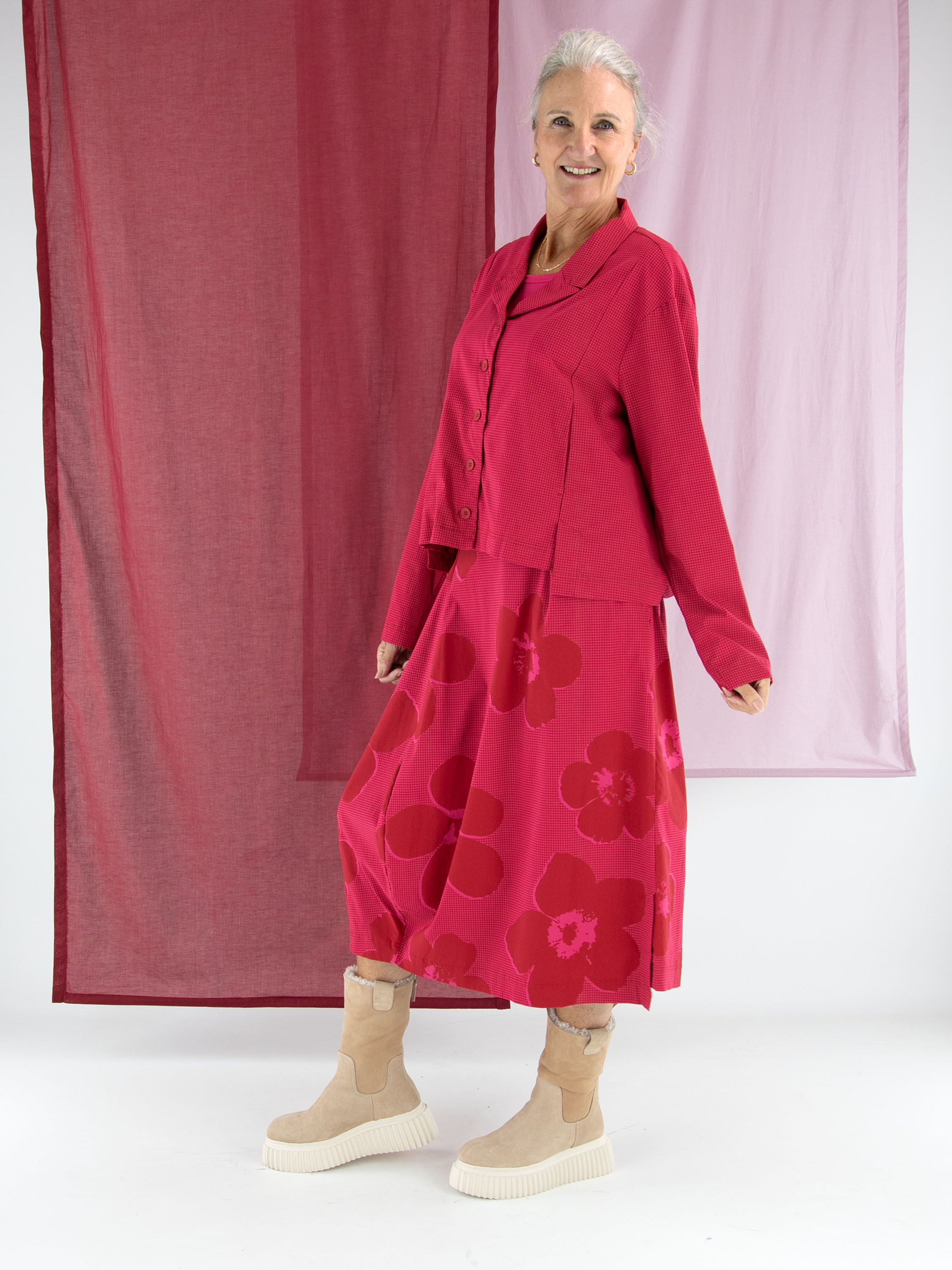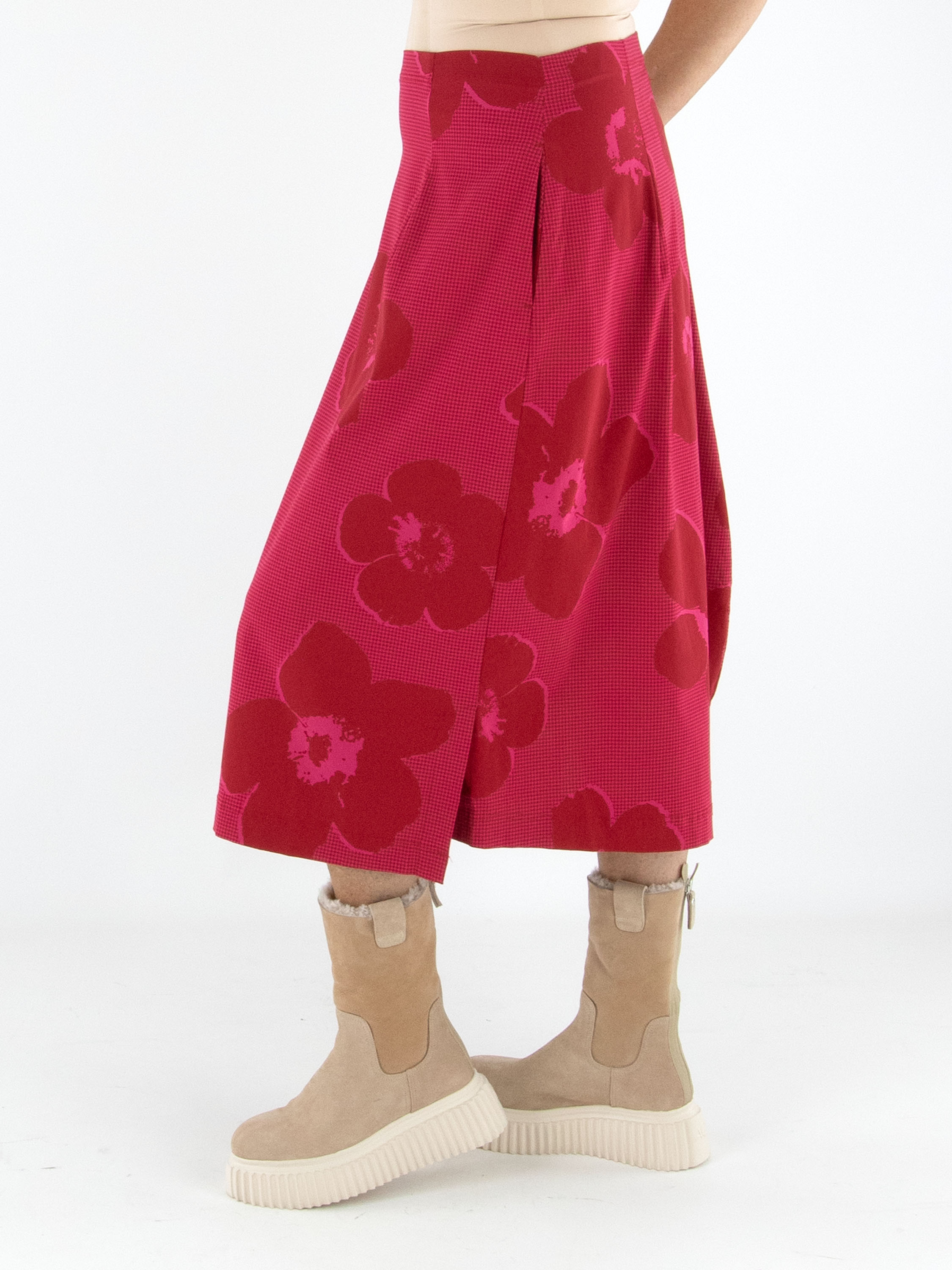 Een rok van Rundholz Black Label in een pied-de-coq print, overlapt met grote bloemen in rood en pink. De elastische tailleband zorgt voor een comfortabele pasvorm. Net onder de tailleband zijn handige steekzakken verwerkt. De rok heeft een moderne ballonvorm en kan op 30 graden worden gewassen.