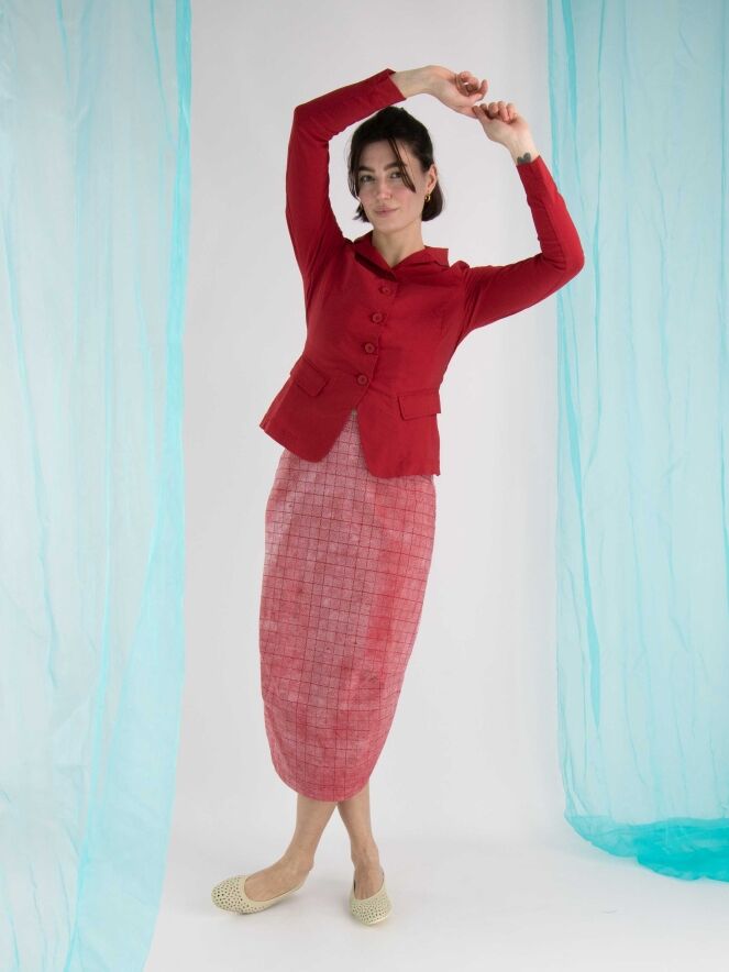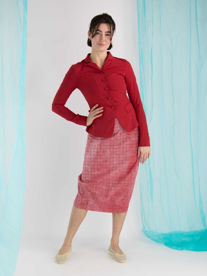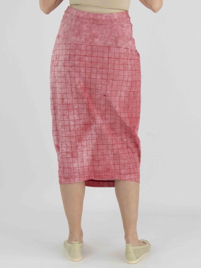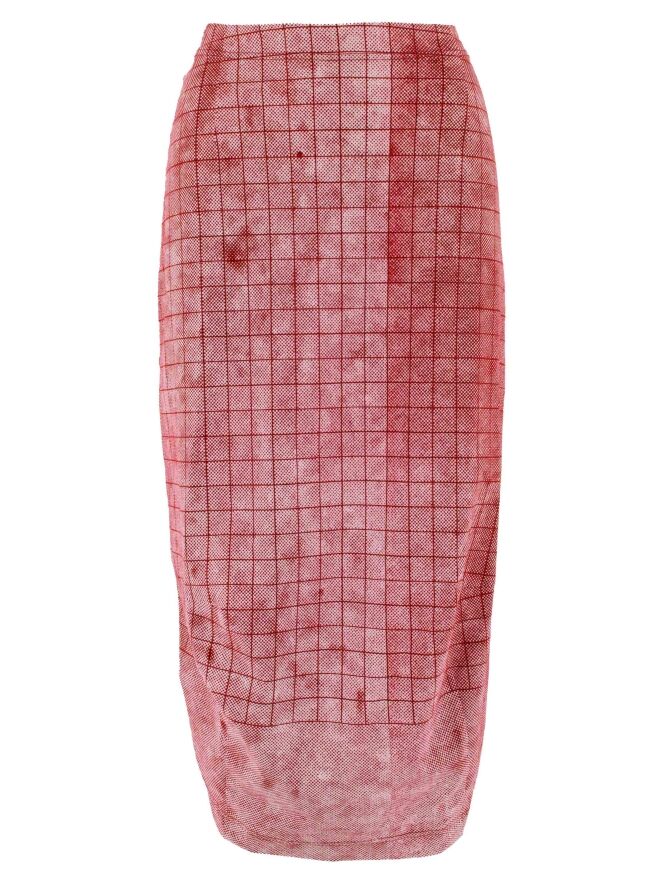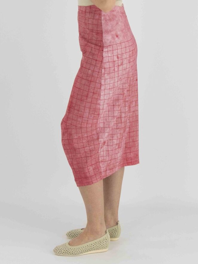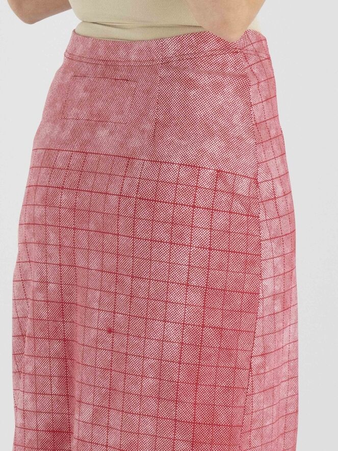 Een rok van Rundholz black label in een gevarieerde grafische ruitprint met de kleur rood en wit. In de taille is een smalle elastieken band. Deze rok mag op 30 graden worden gewassen.