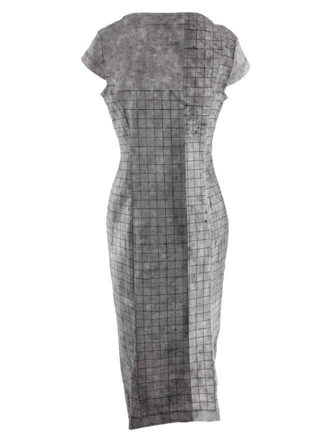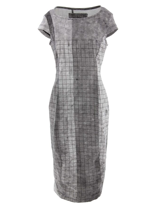 Een jurk van Rundholz black label in een gevarieerde grafische ruitprint met de kleur zwart en wit. De jurk heeft een brede hals en een kopmouwtje. Deze jurk mag op 30 graden worden gewassen.