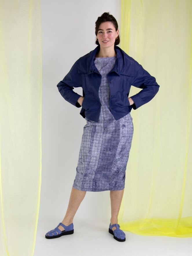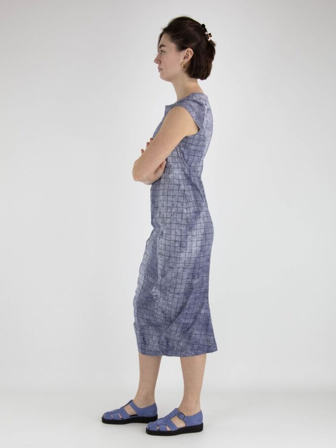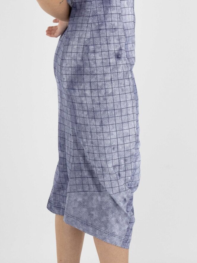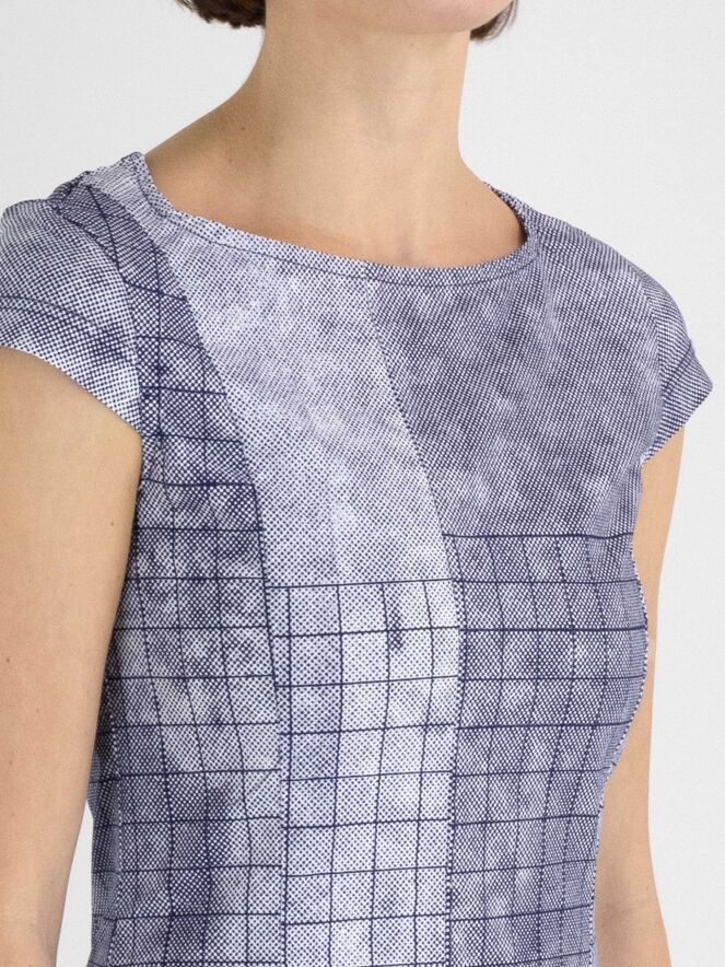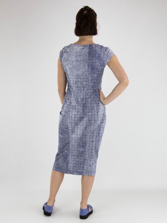 Een jurk van Rundholz black label in een gevarieerde grafische ruitprint met de kleur indigoblauw en wit. De jurk heeft een brede hals en een kopmouwtje. Deze jurk mag op 30 graden worden gewassen.