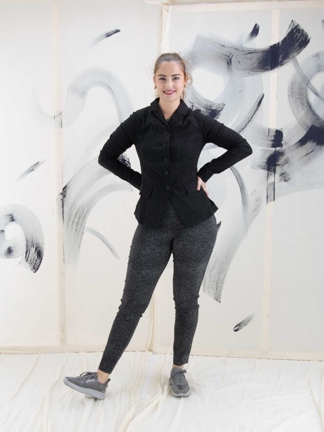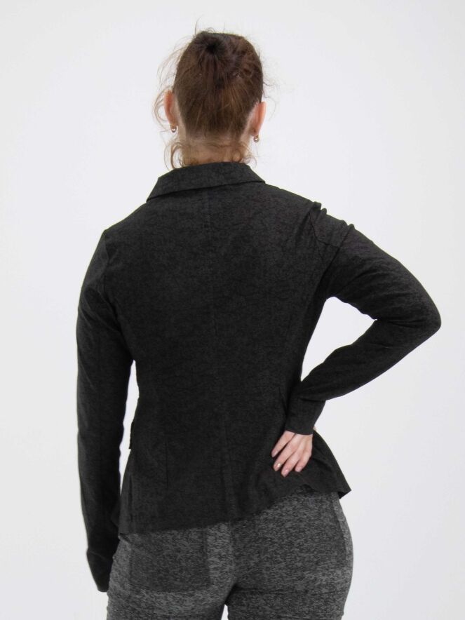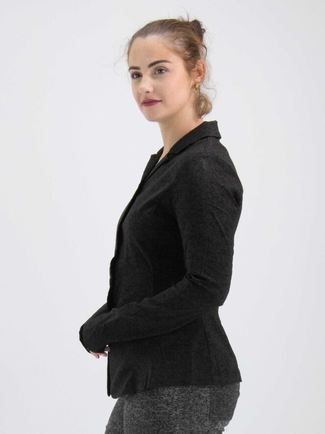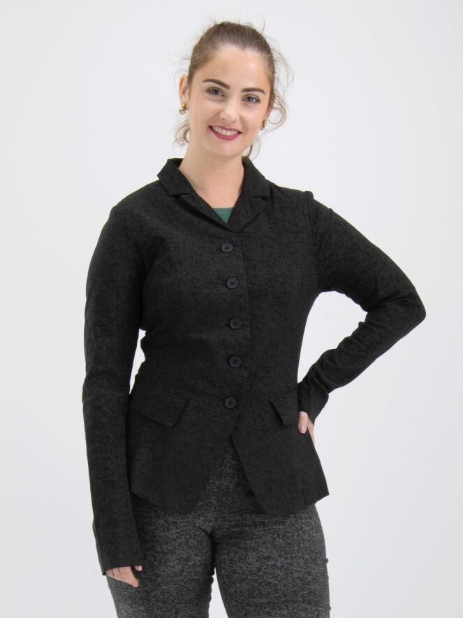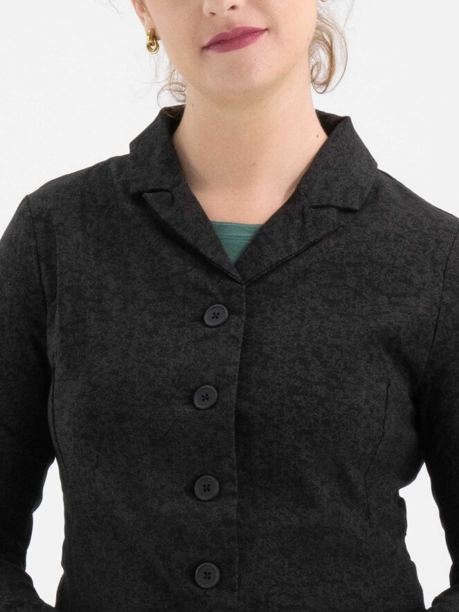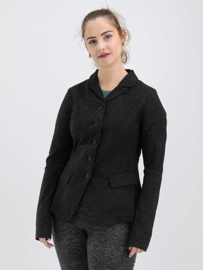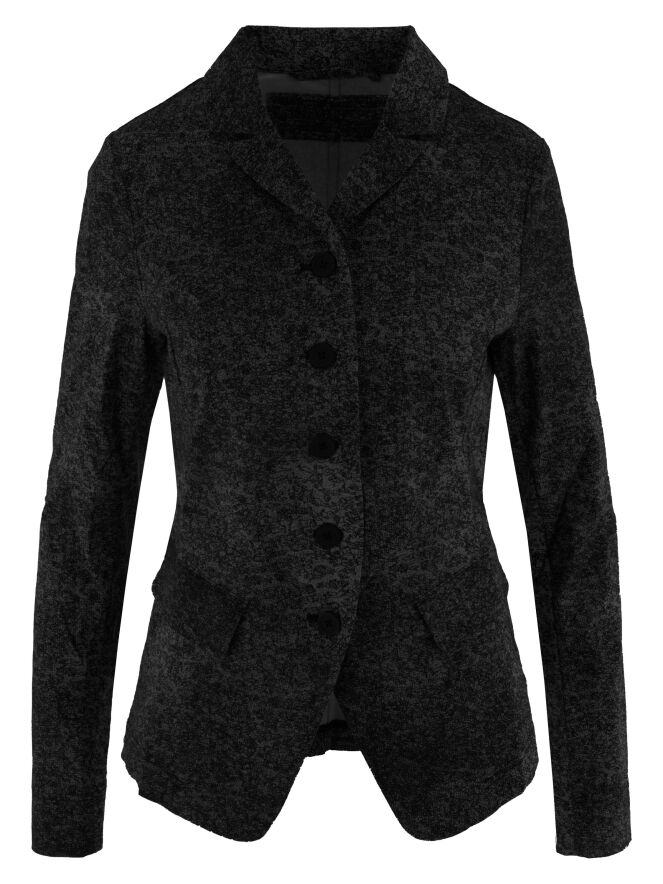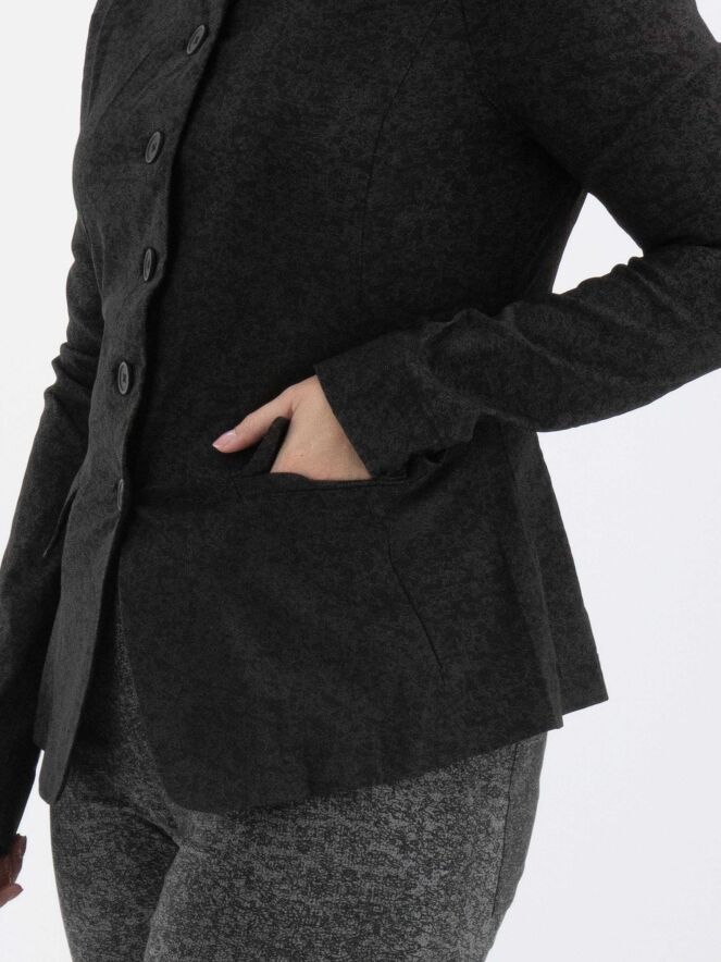 Een blazer van Rundholz Black Label in een grafische print met de kleuren zwart en antraciet. Aan de achterkant zijn er vanuit de taille enkele bandplooien. De blazer heeft een vijfknoopssluiting en mag op 30 graden worden gewassen.