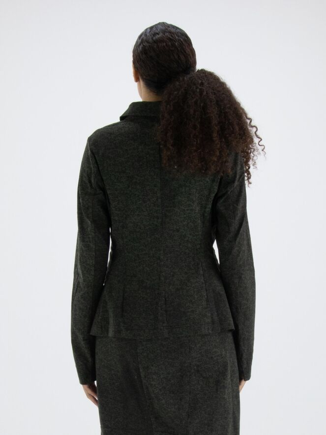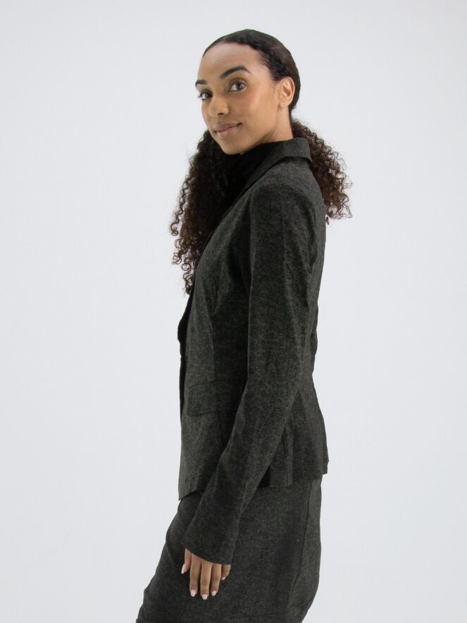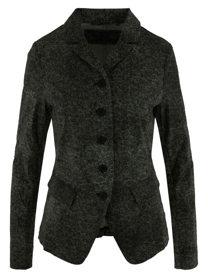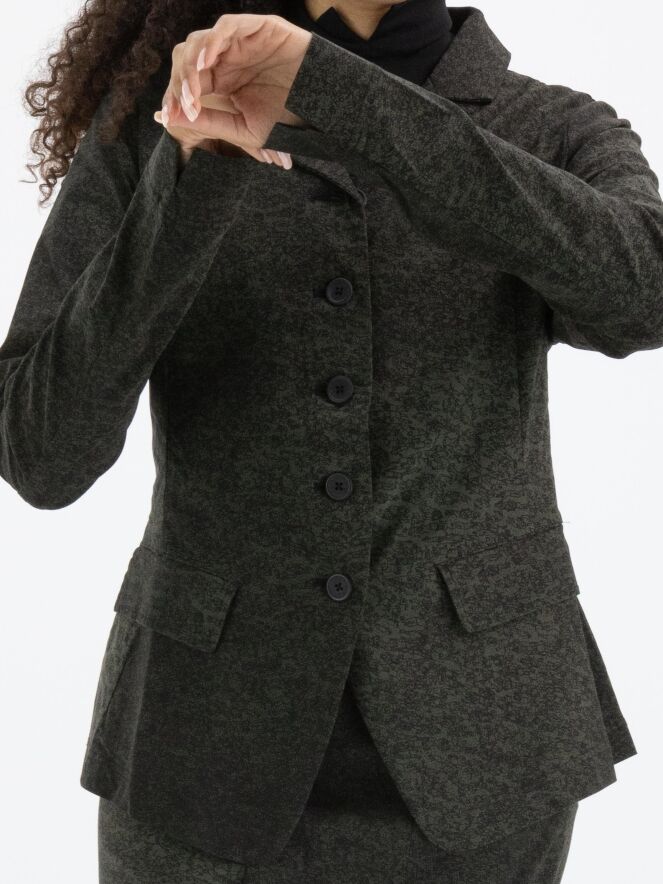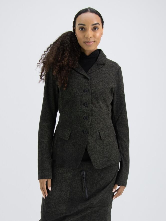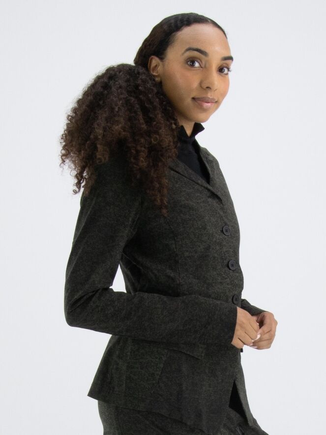 Een blazer van Rundholz Black Label in een grafische print met de kleuren zwart en khaki. Aan de achterkant zijn er vanuit de taille enkele bandplooien. De blazer heeft een vijfknoopssluiting en mag op 30 graden worden gewassen.
