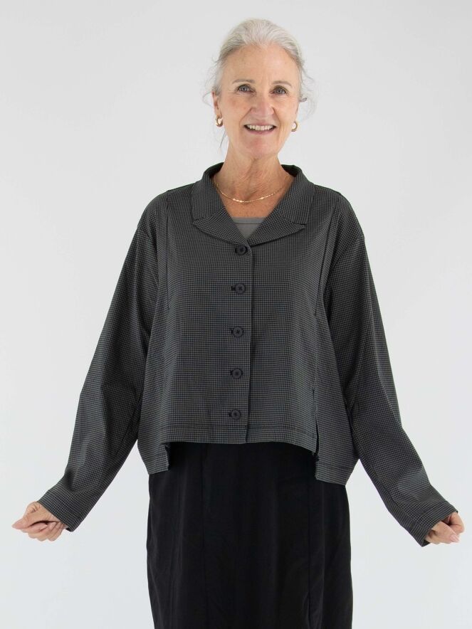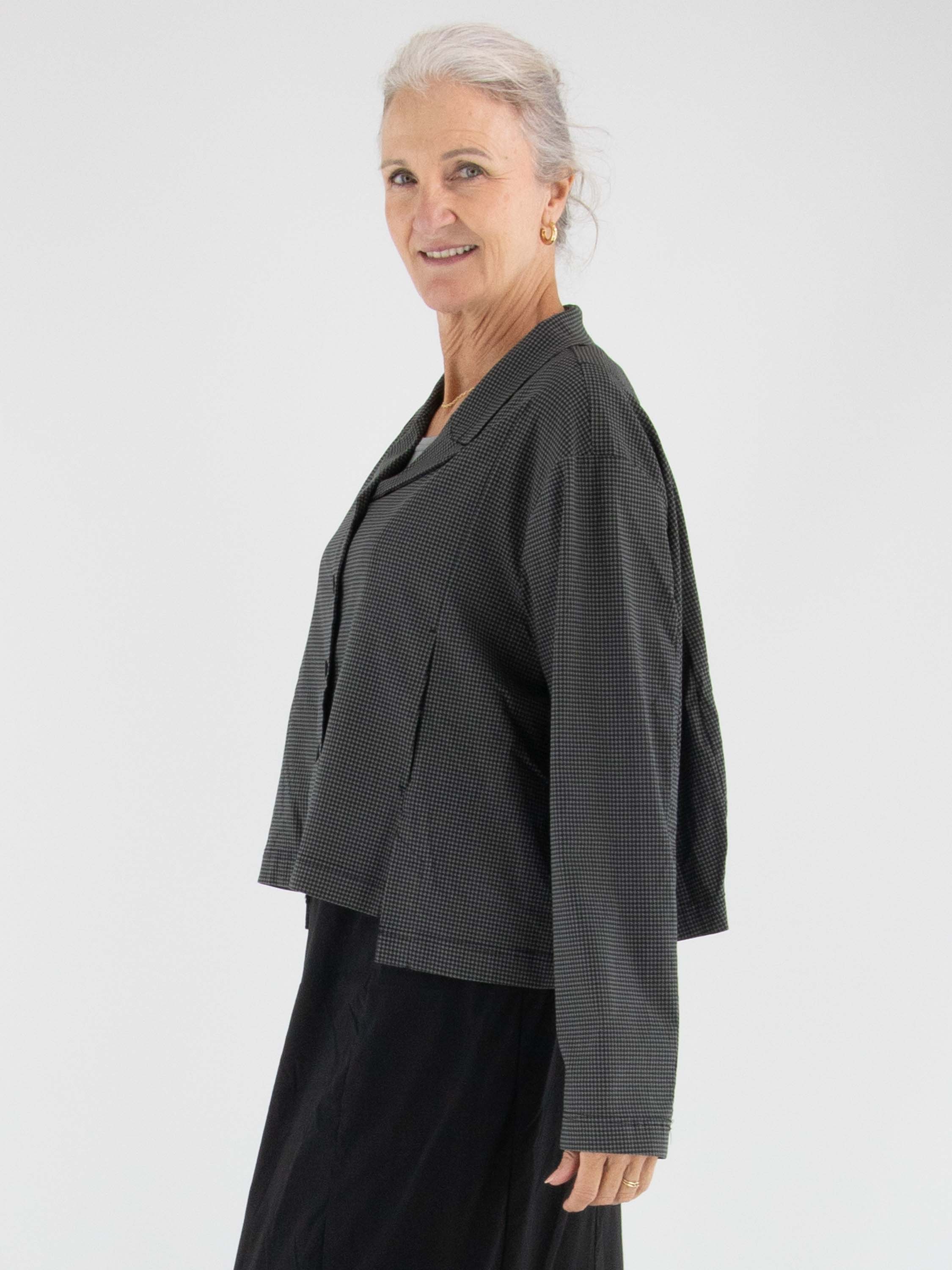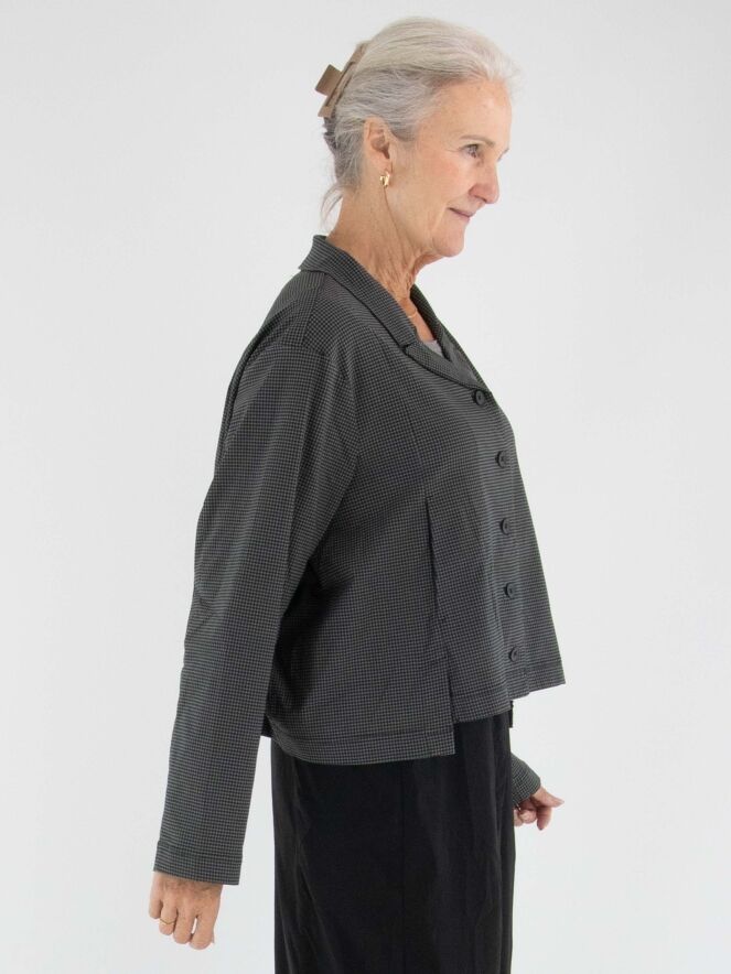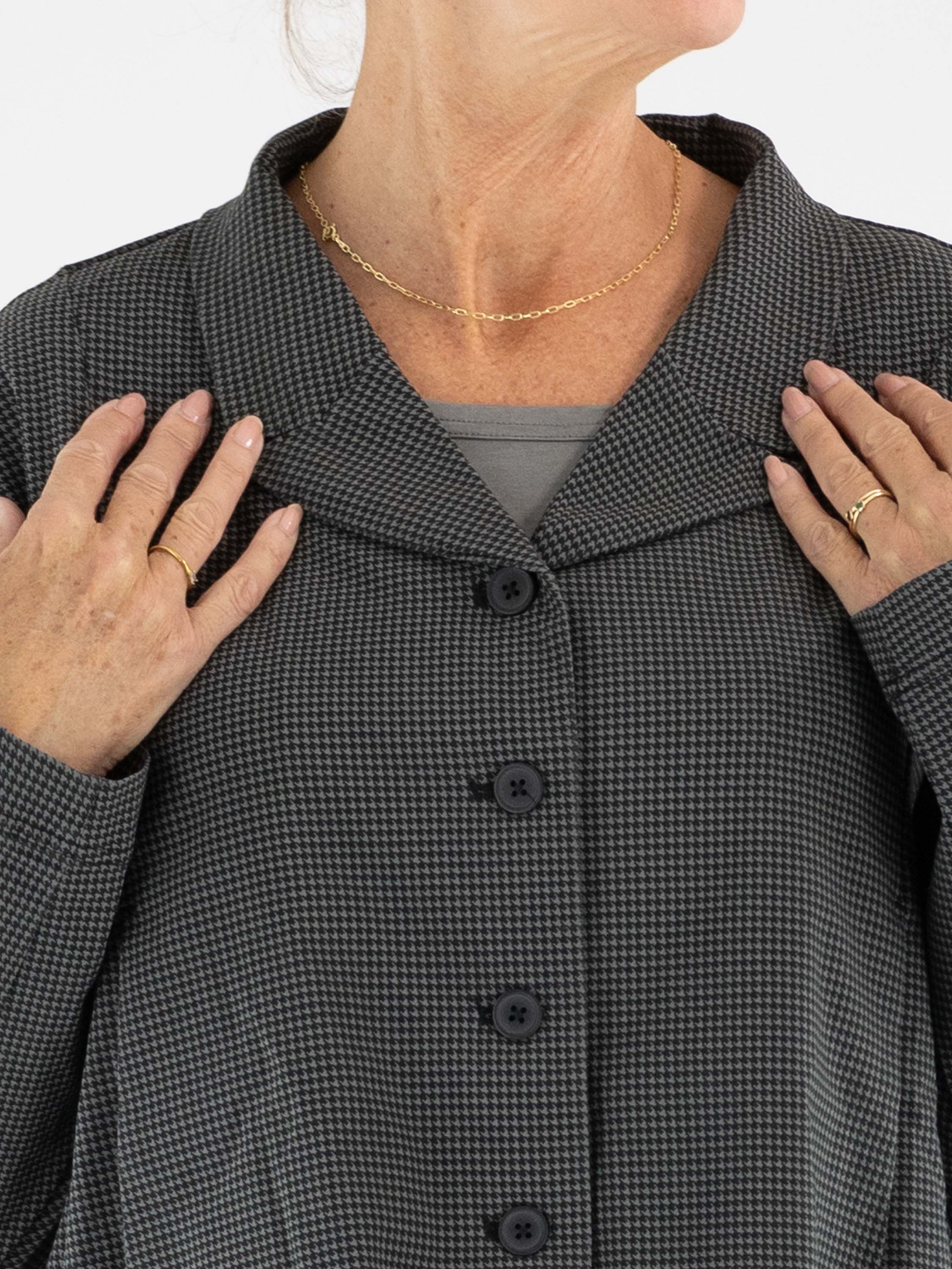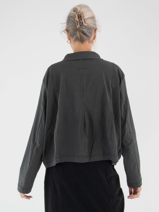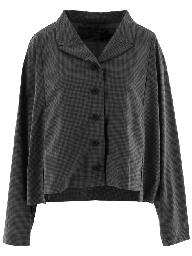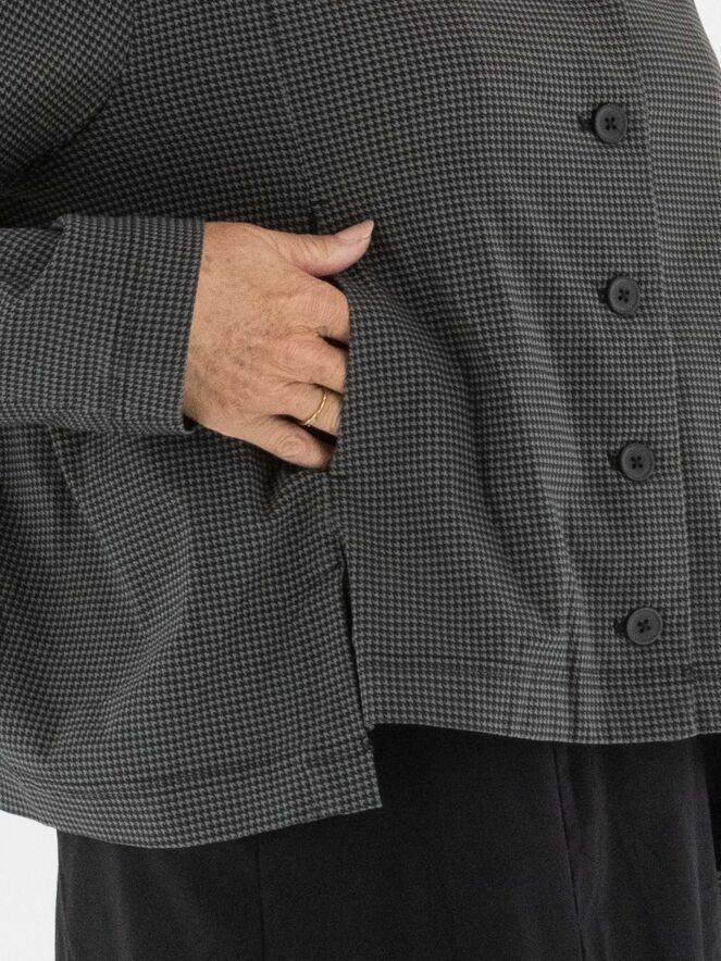 Een ruime blazer van Rundholz Black Label in een pied-de-coq print in grijs- en zwarttinten. De blazer sluit met vijf knopen en is voorzien van steekzakken op taillehoogte. Dit ontwerp combineert een klassieke print met de kenmerkende, eigentijdse stijl van Rundholz. De blazer kan op 30 graden worden gewassen.