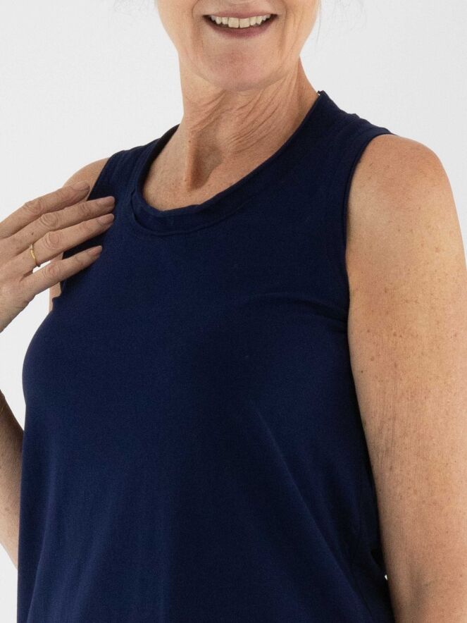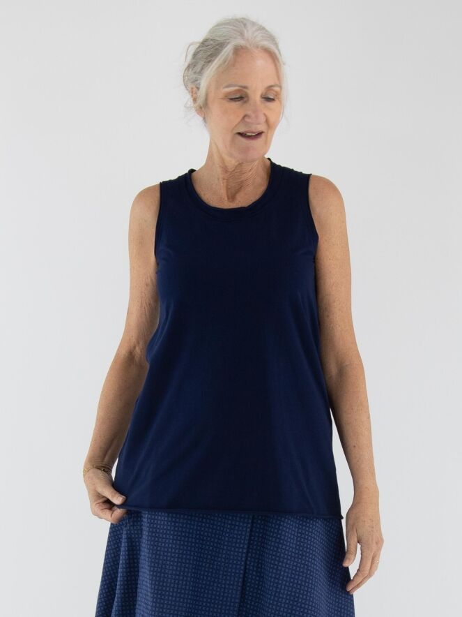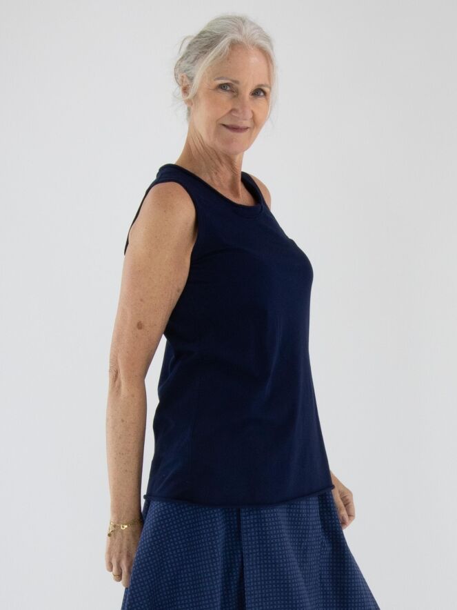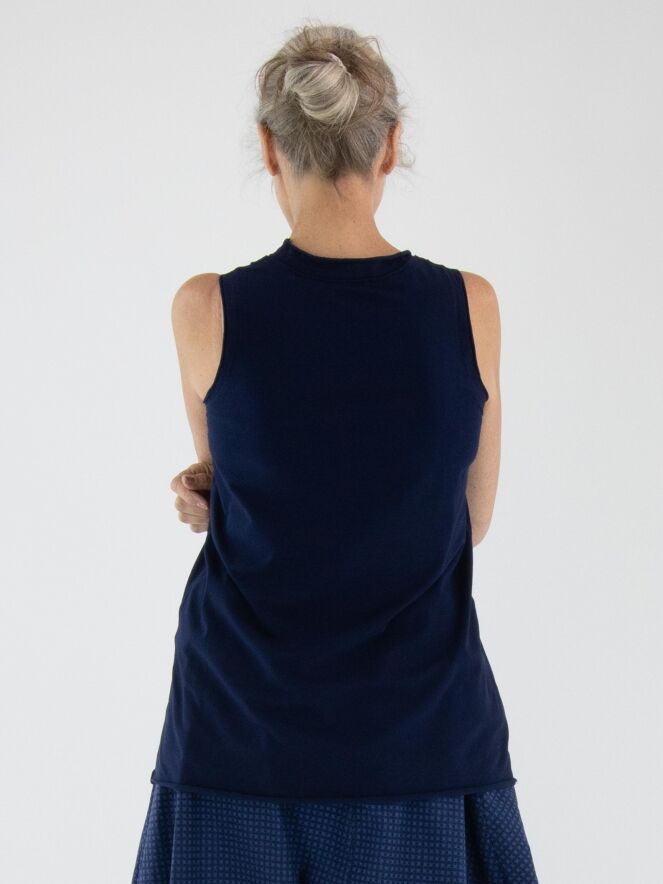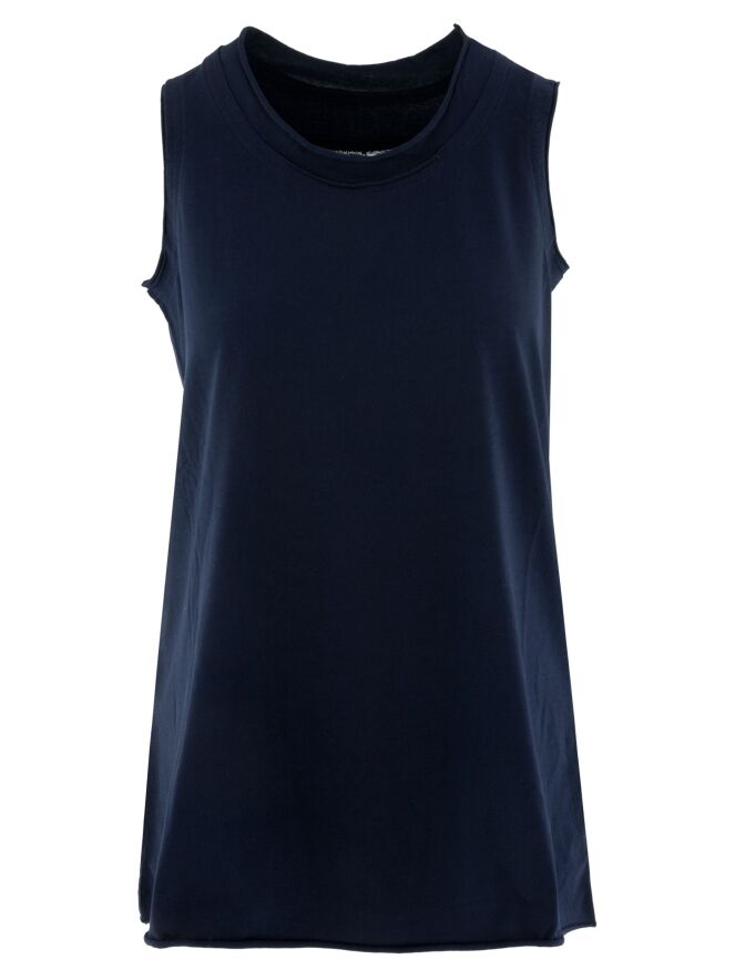 Een top van Rundholz Black Label in de kleur marineblauw. Langs de ronde hals en de mouwinzet bevindt zich een licht transparante bies met een geruld effect. Ook aan de onderkant is de stof geruld. Deze top kan op 30 graden worden gewassen.