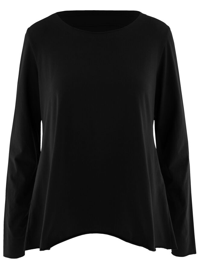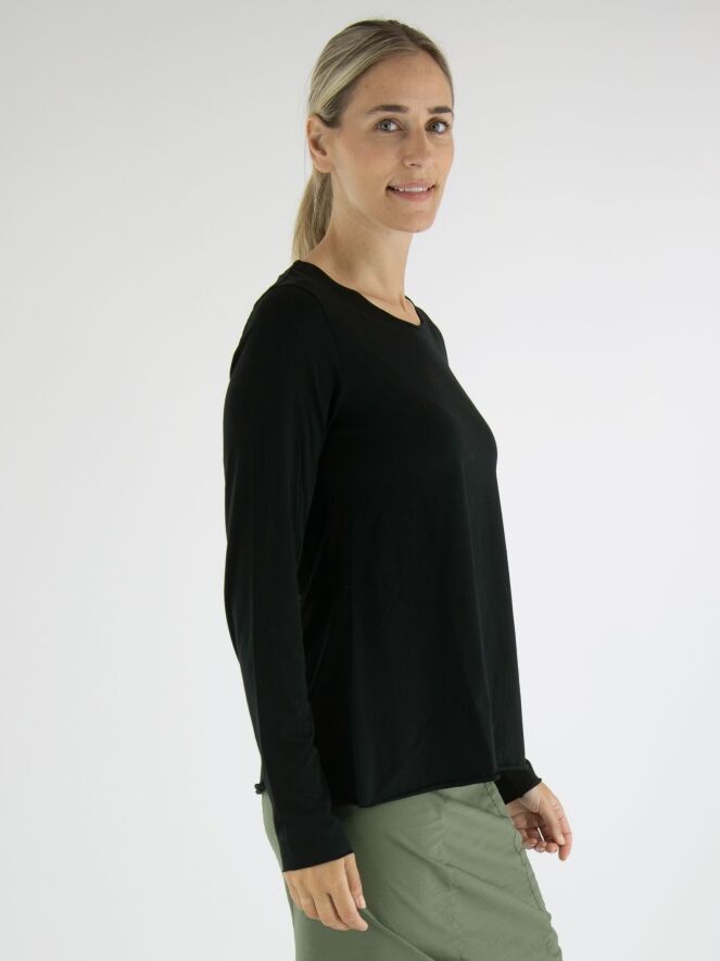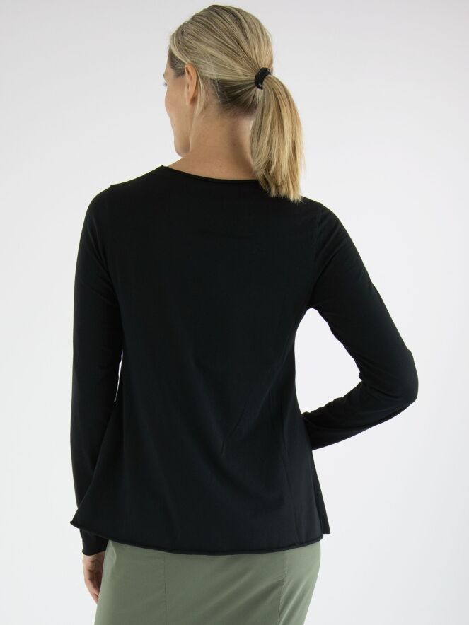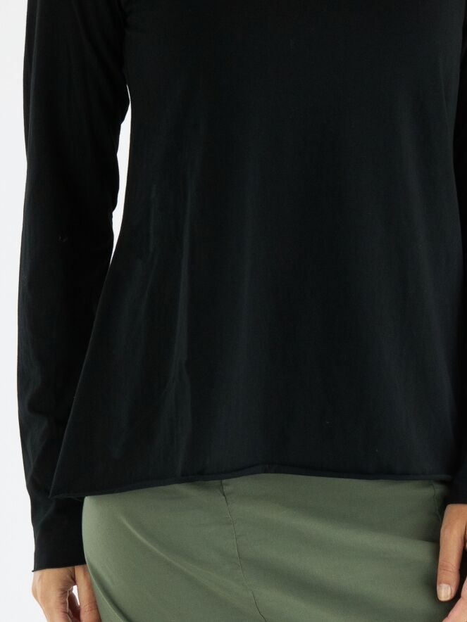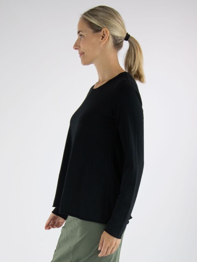 Een shirt van Rundholz black label in de kleur zwart. Het shirt heeft een ronde hals en lange mouwen. De rand aan de onderkant is geruld en dit shirt mag op 30 graden worden gewassen.
