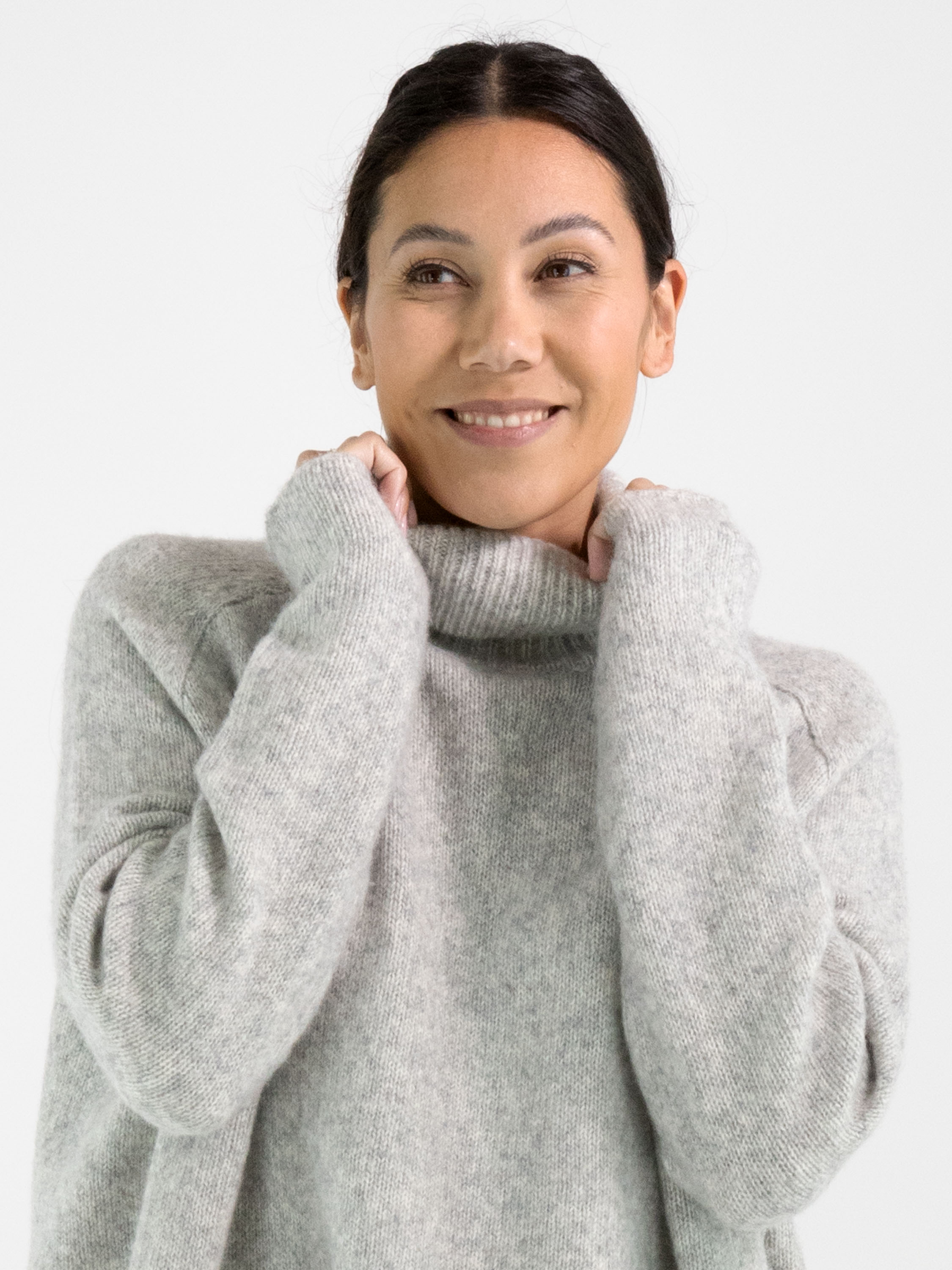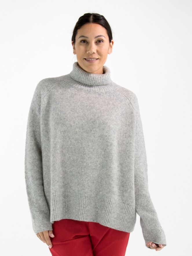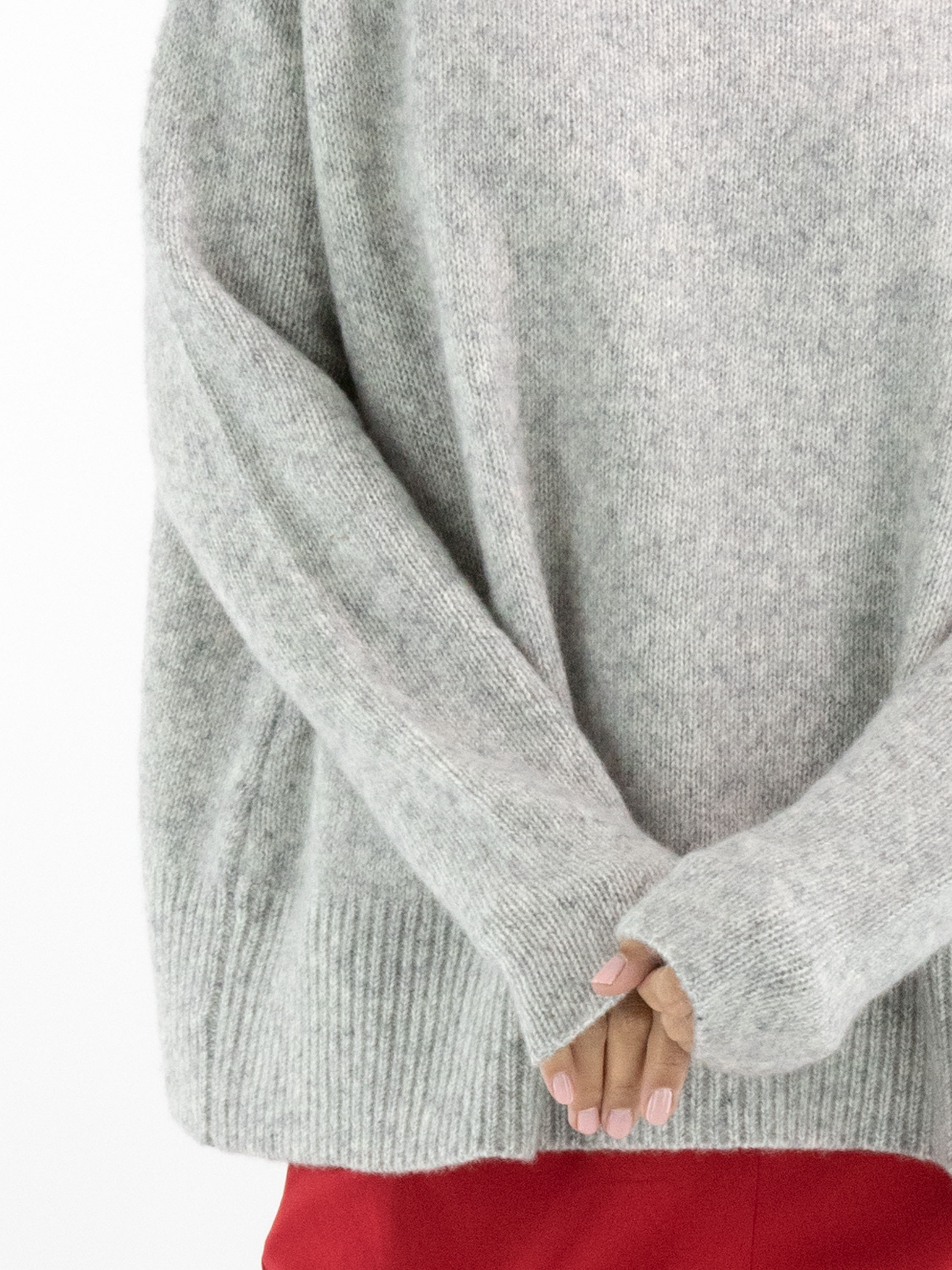 Een ruime, gemêleerde pullover van Rundholz Black Label in lichtgrijze tinten. De boord van de col is geribbeld, net als de uiteinden van de mouwen en de zoom. Deze pullover mag met de hand worden gewassen.