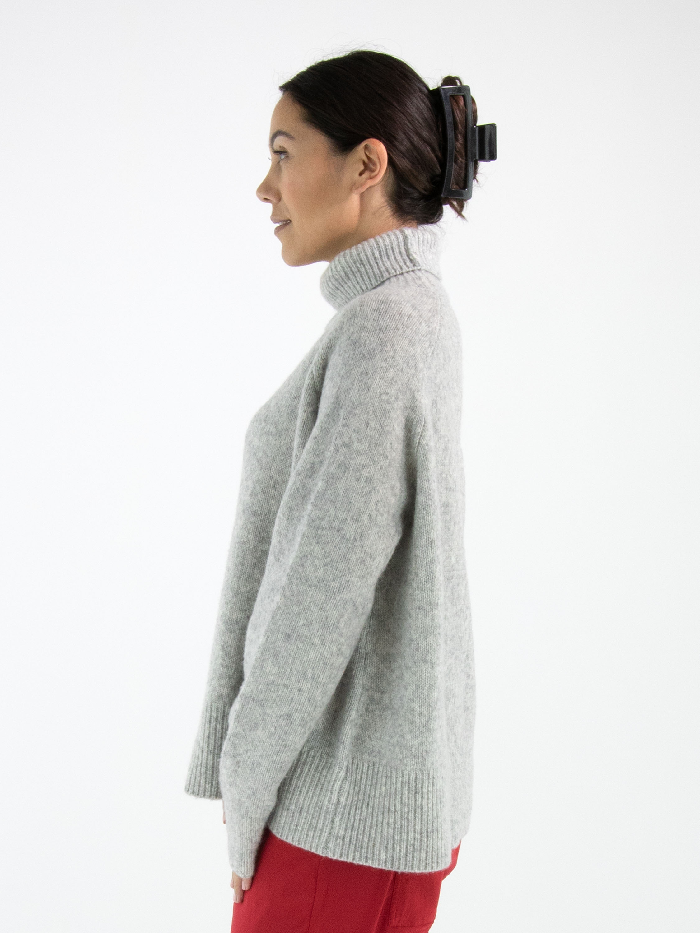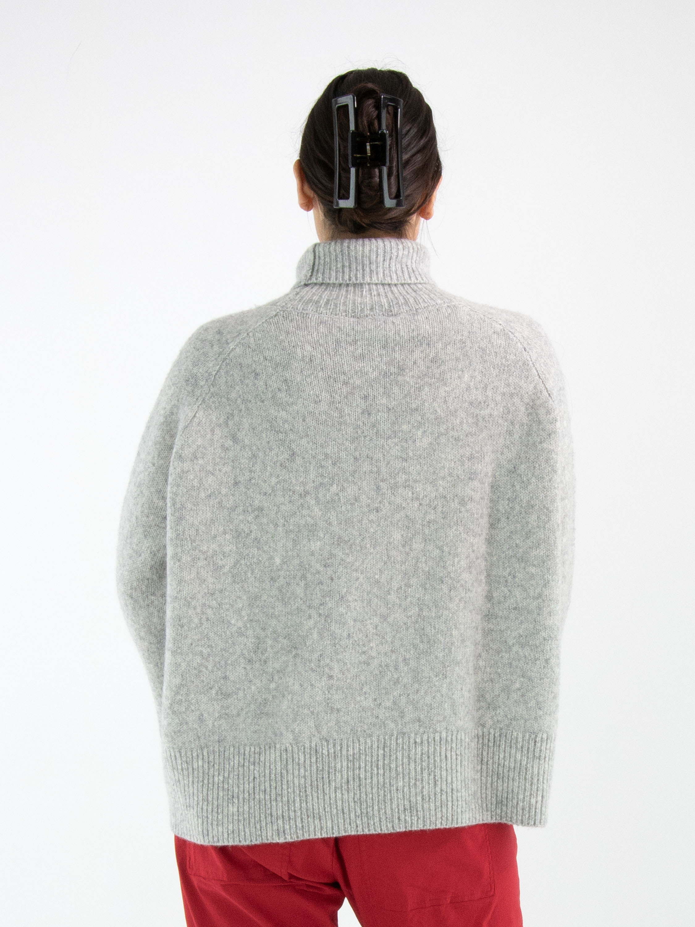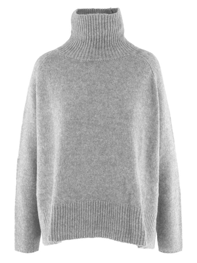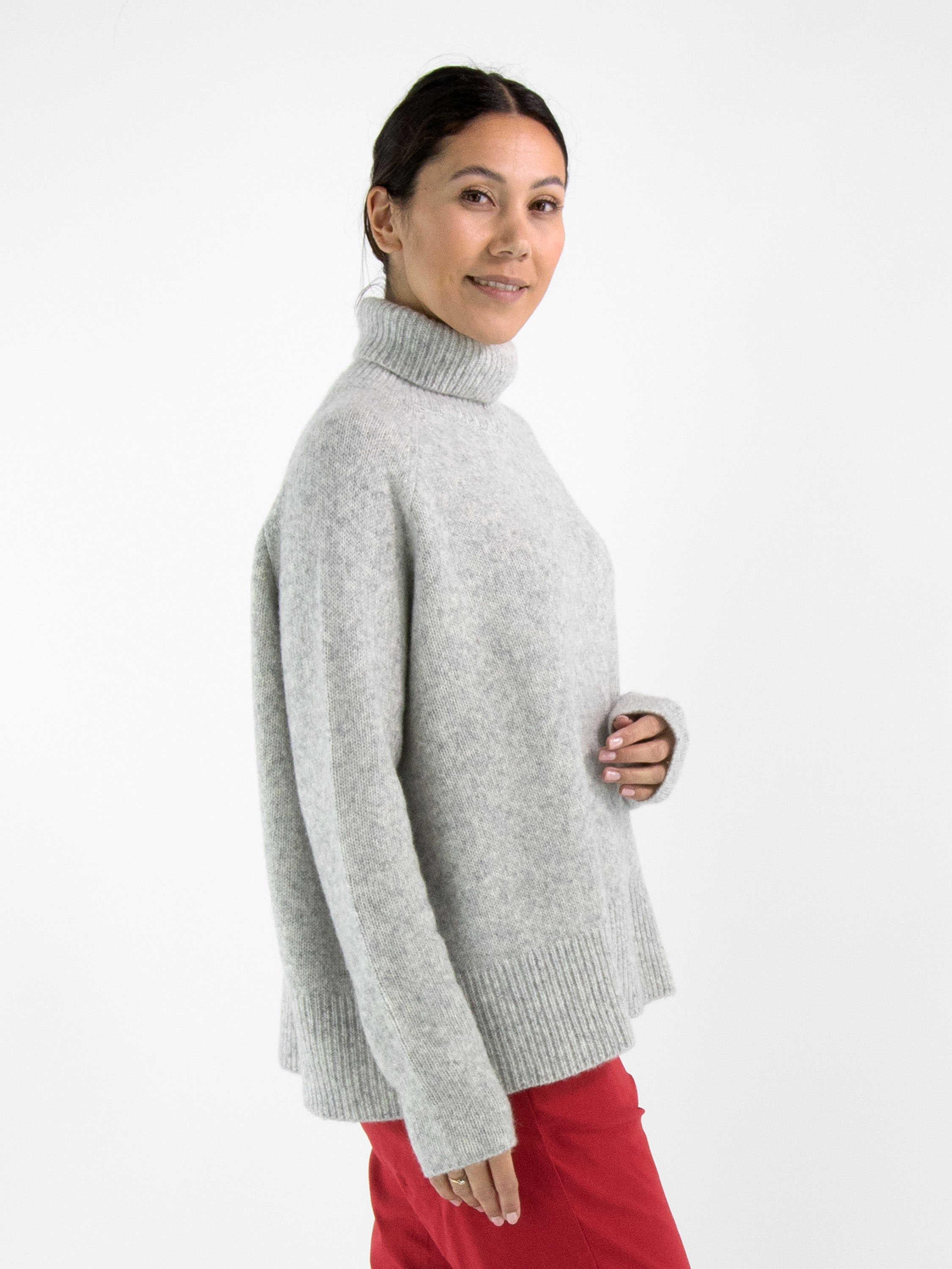 Een ruime, gemêleerde pullover van Rundholz Black Label in lichtgrijze tinten. De boord van de col is geribbeld, net als de uiteinden van de mouwen en de zoom. Deze pullover mag met de hand worden gewassen.